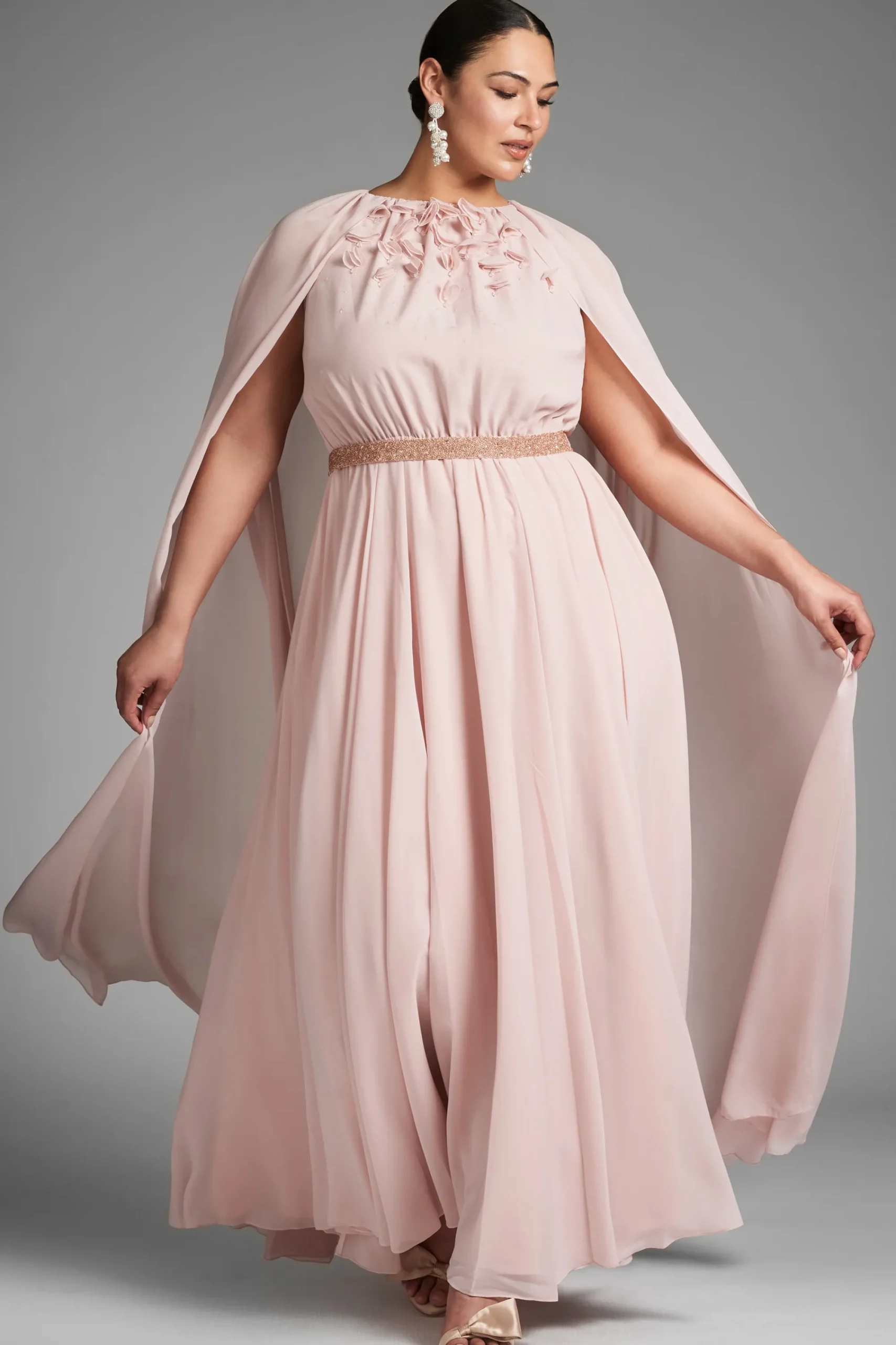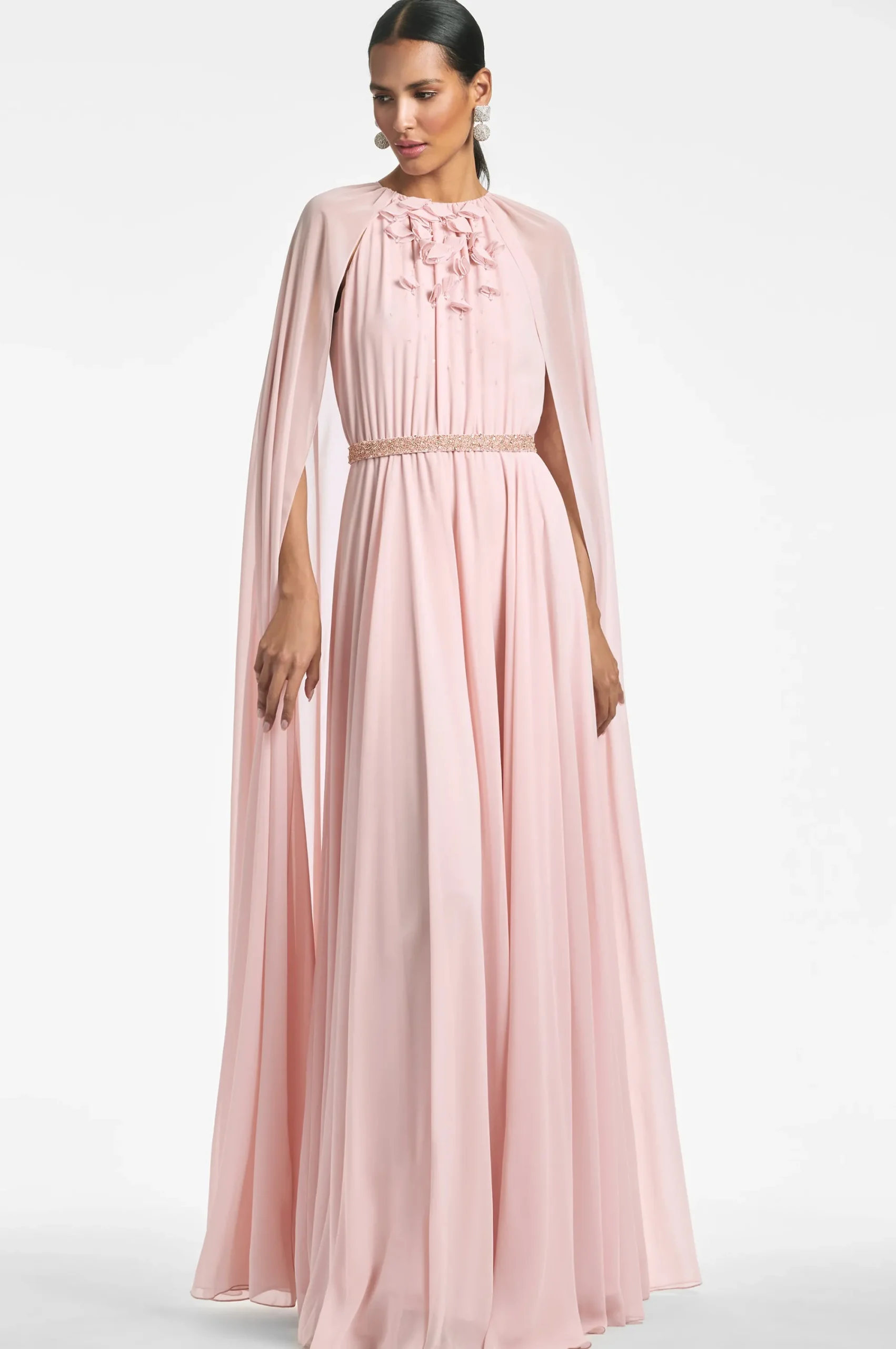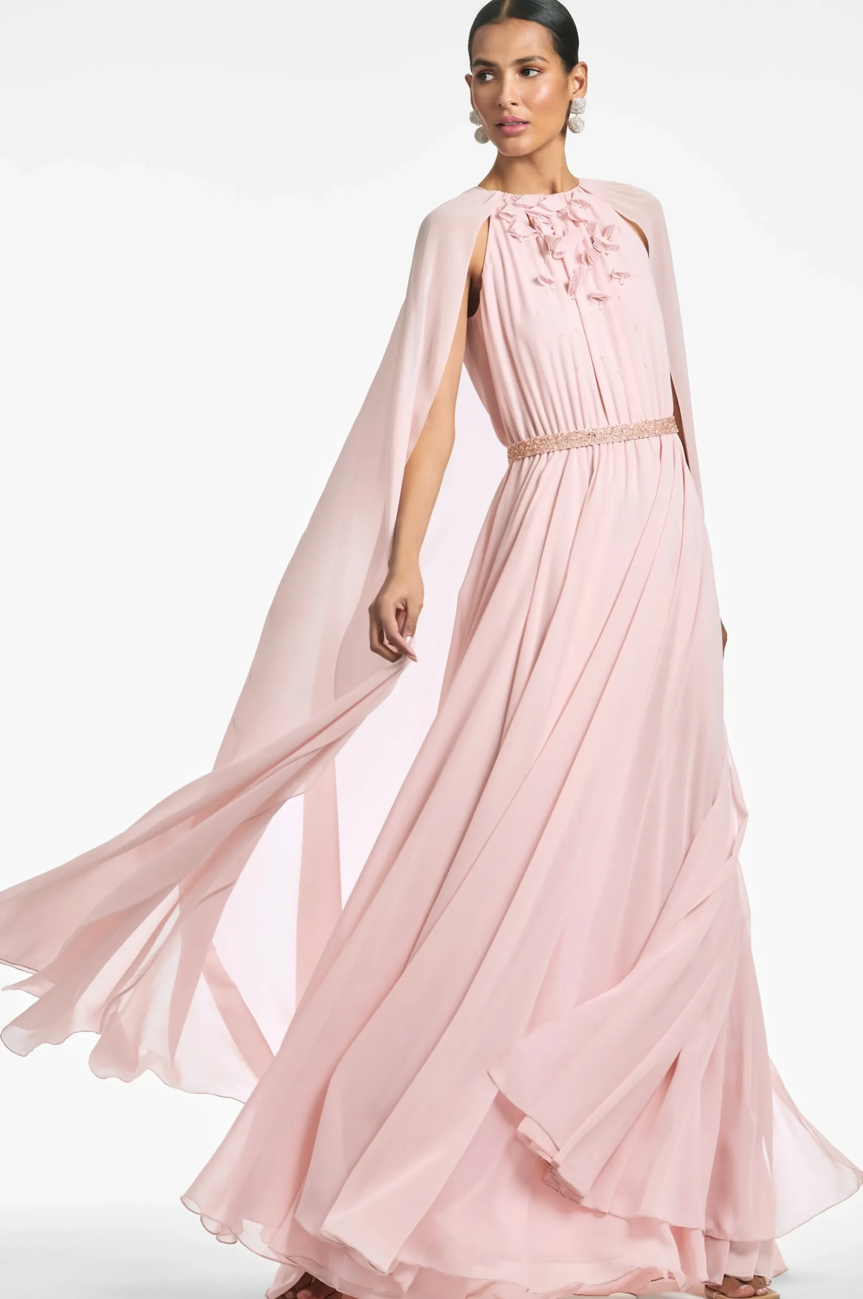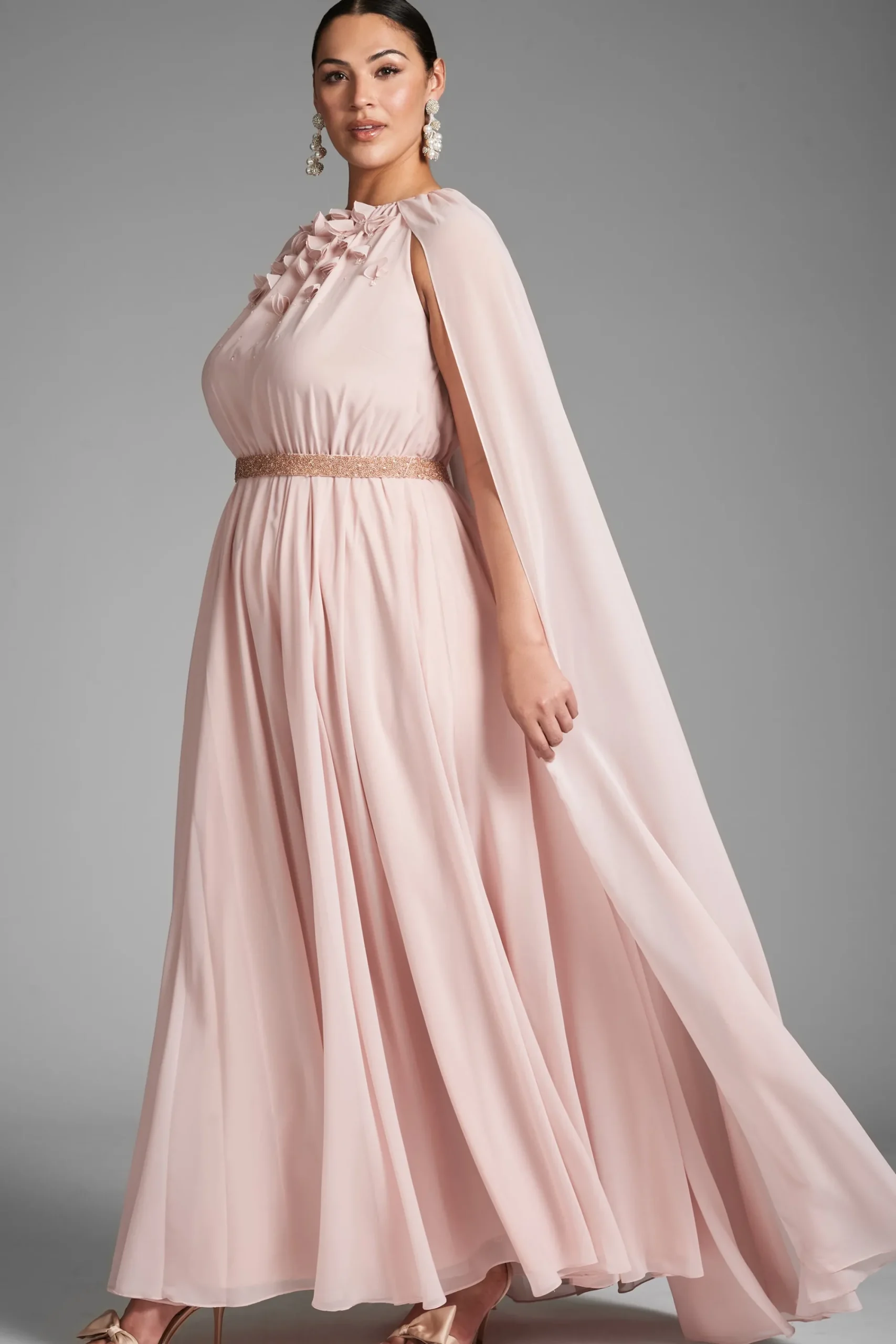 Layers of peachy petal pink chiffon make this gown diaphanous, made to look as though it is floating. An attached single layer of chiffon creates a full slit sleeve cape covering the shoulder and adding drama. At the front hand made 3D embroidering and a beaded slim belt. This gown was made to make a statement of sheer elegance.
