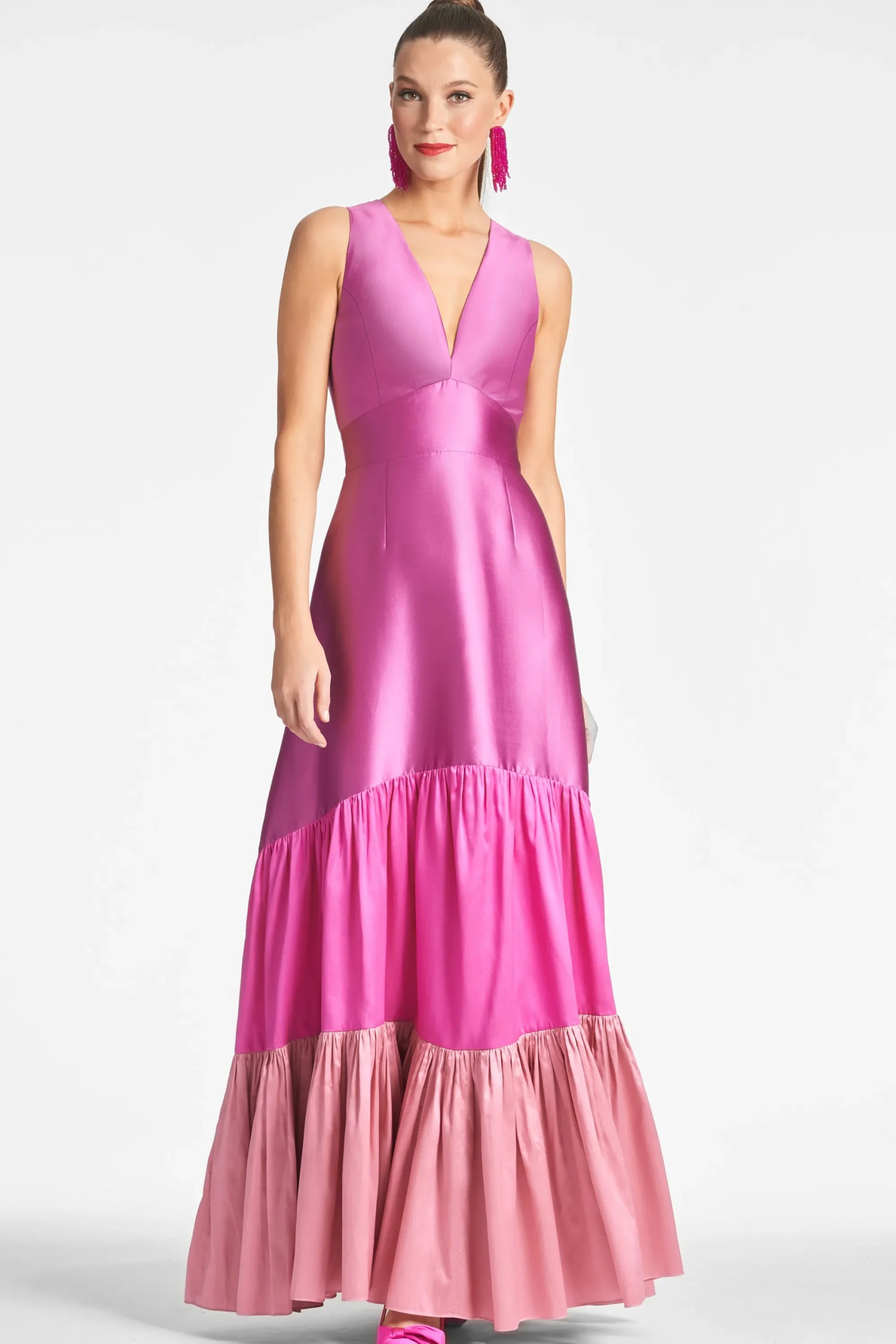 Rori is not for those looking to blend in. She is a show-stopping conversation piece. A clean A-line silhouette with deep V-neckline is punctuated through tiers of fuschia. Featured in our non-stretch Mikado, she is designed to fit and flatter, cinching at the highest point of the waist and elegantly falling at the hip.