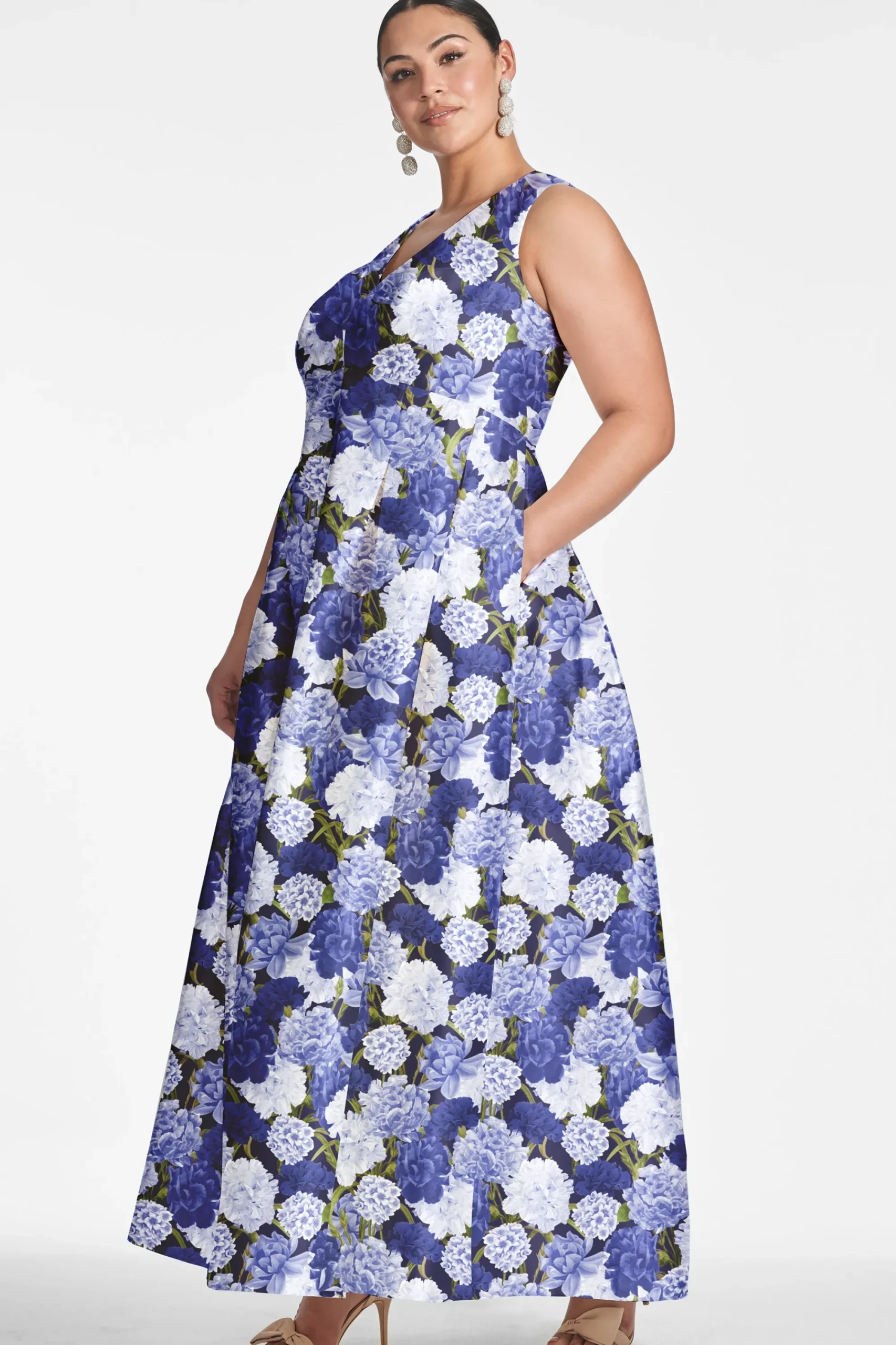 The Brooke is our V-neck gown with box pleats, peaked waist seam, and side pockets. This dress is what we consider to be a classic, essential silhouette, a perfect canvas for our most breathtaking prints.