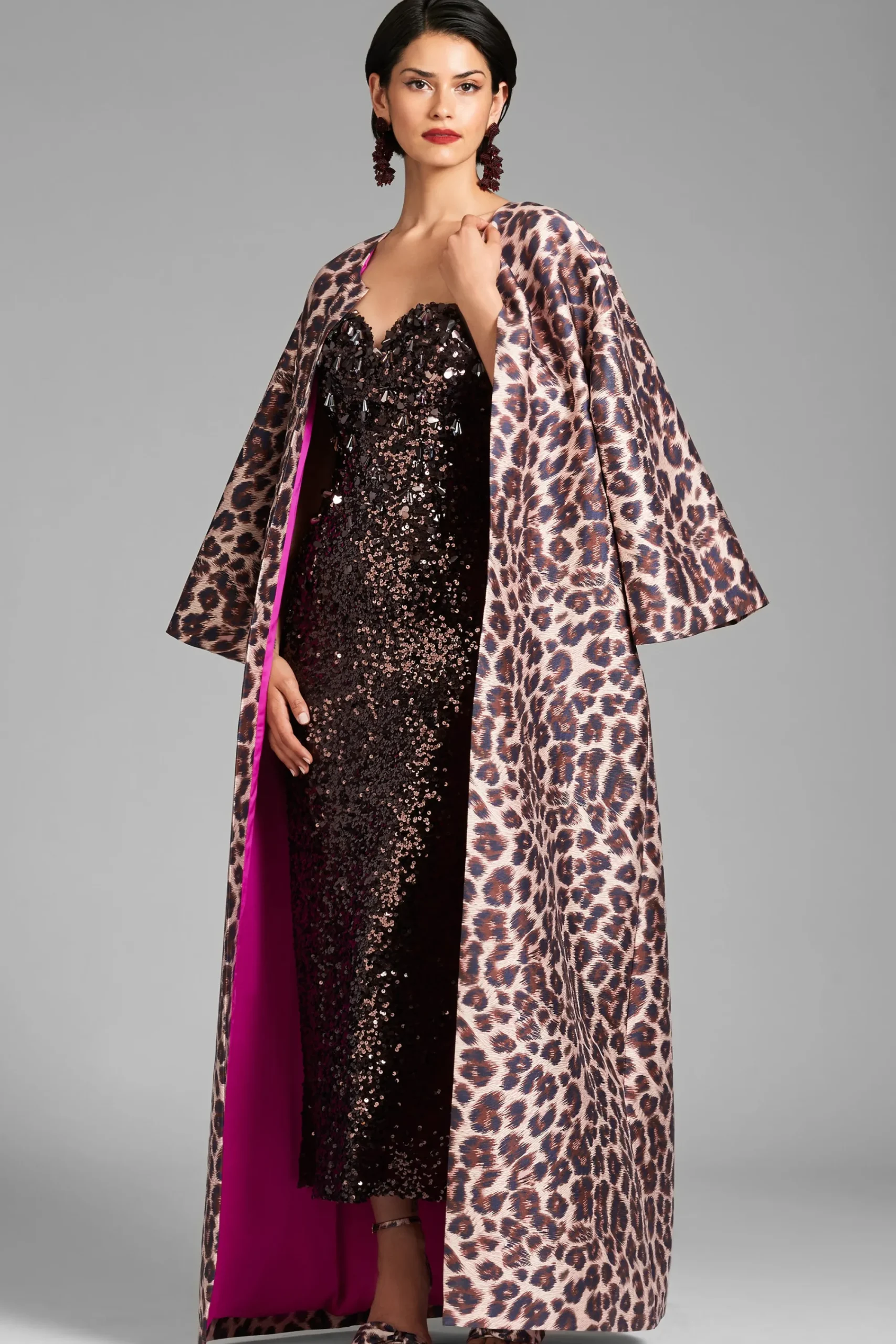 A timeless look with a twist and a secret. The Calliope Coat is a grande addition to any wardrobe. The stretch Mikado fabric gives it a luxurious look and feel while providing a great fit. If the gorgeous allover leopard print wasn’t quite enough, this gorgeous piece is lined in a shocking fuchsia for an extra pop.