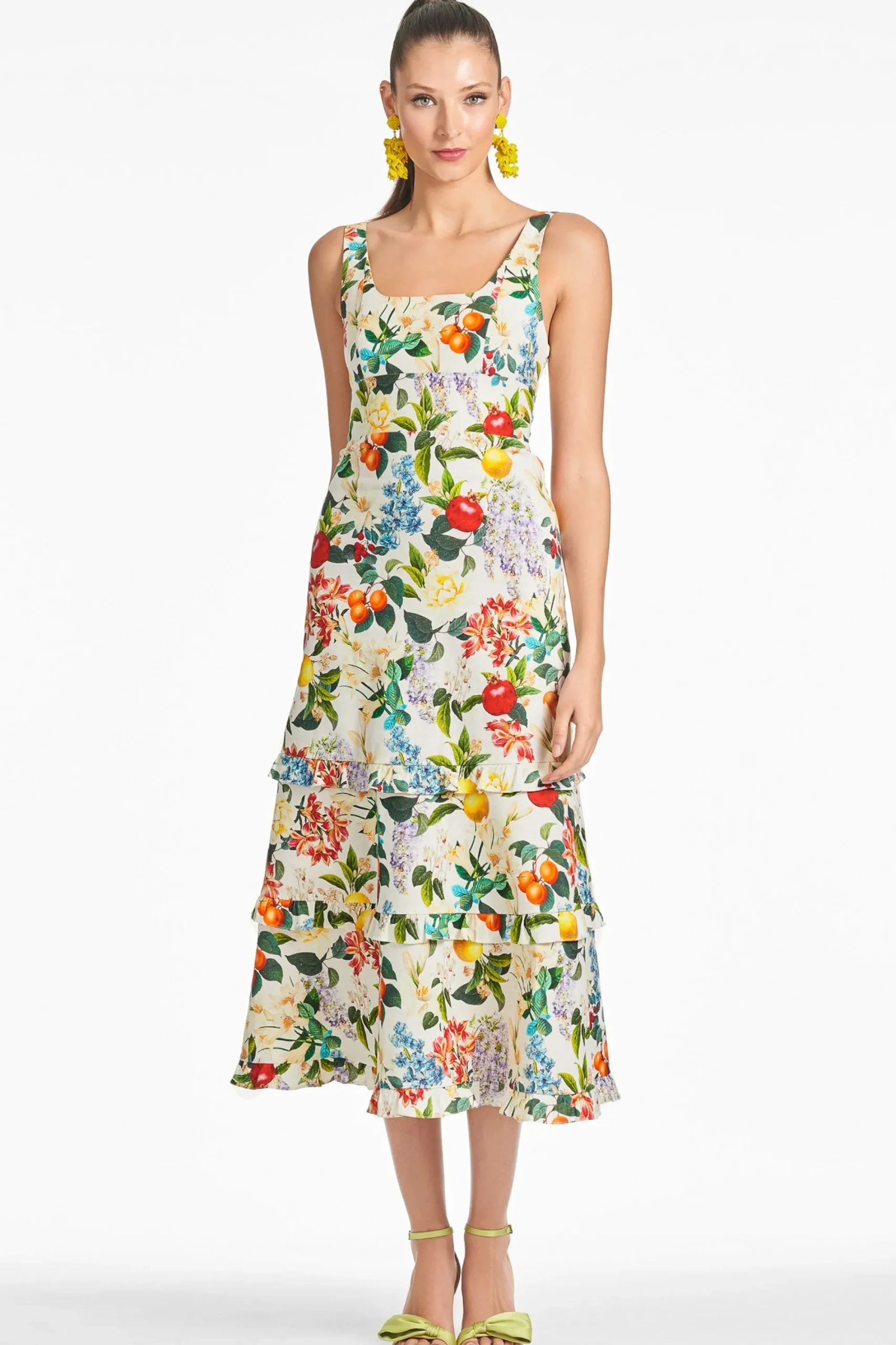 Caterina is one of those dresses that makes you want to book a plane ticket on the spot. This stretch linen midi, seen here in our Giorno Giardino print, is the perfect companion for your next warm weather vacay or trip to the beach.