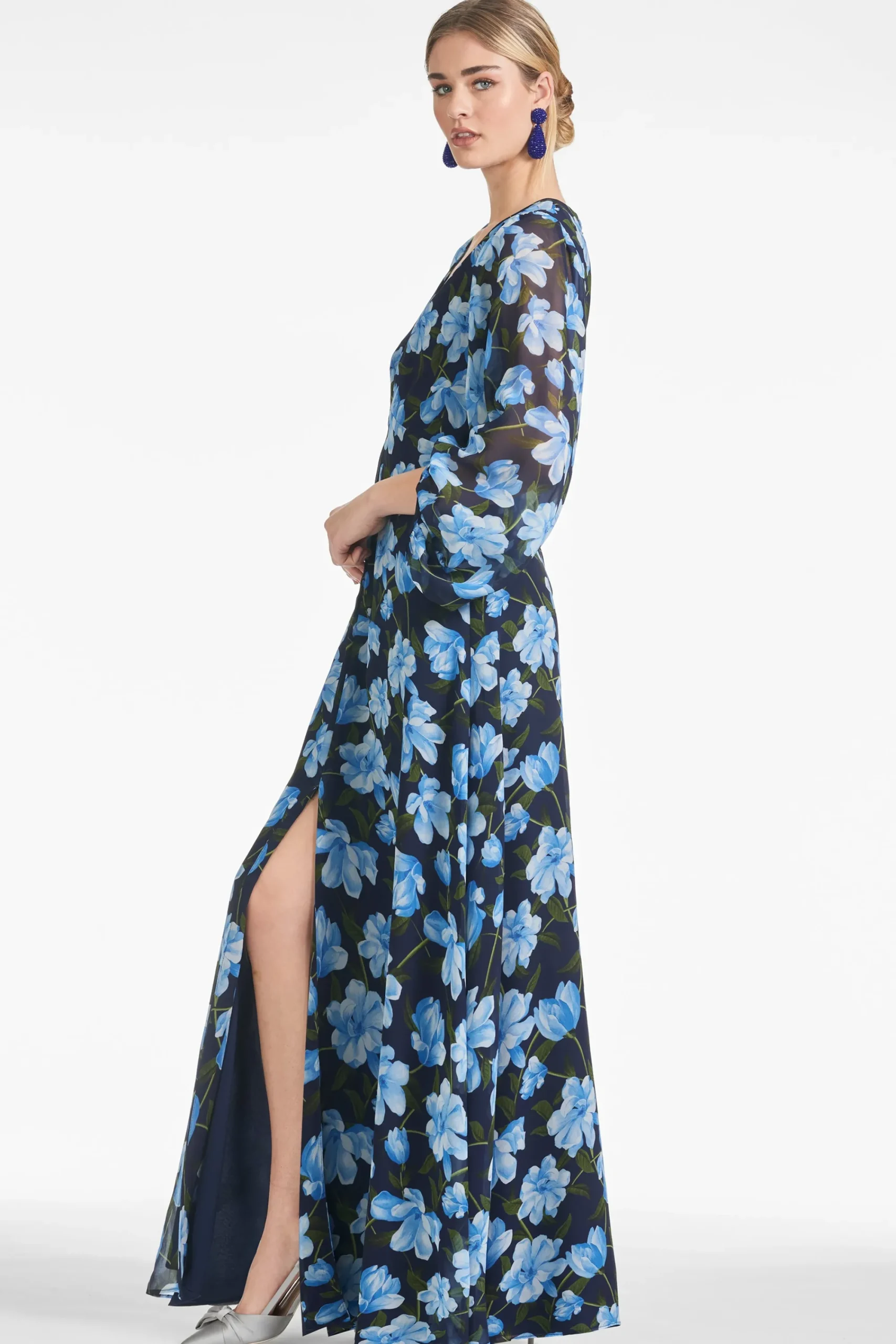 Jenny in Ocean Blue Magnolia is a gown that knows who she is: elegant, understated, and sophisticated. Featured in poly chiffon, the empire waist falls to a perfect A-line while the collapsed crescent sleeves add a subtle yet unique element to the gown’s overall design.
