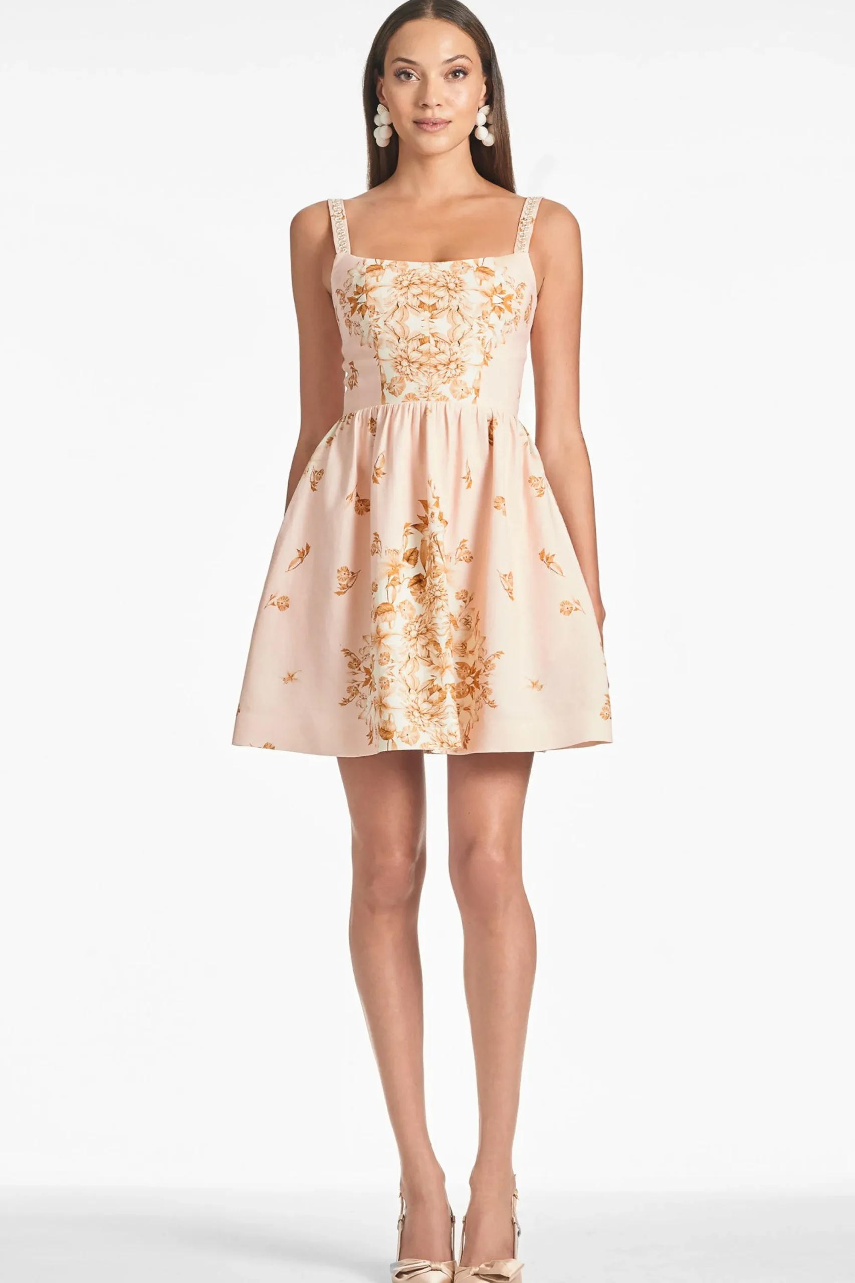 Our mini fit-and-flare silhouette takes on printed linen viscose for the ultimate warm-weather look. The pattern is ethereal and feminine, tying together gold botanicals with the prettiest pale pink. From day to night, casual to dressy, this is a piece you can wear all summer long.