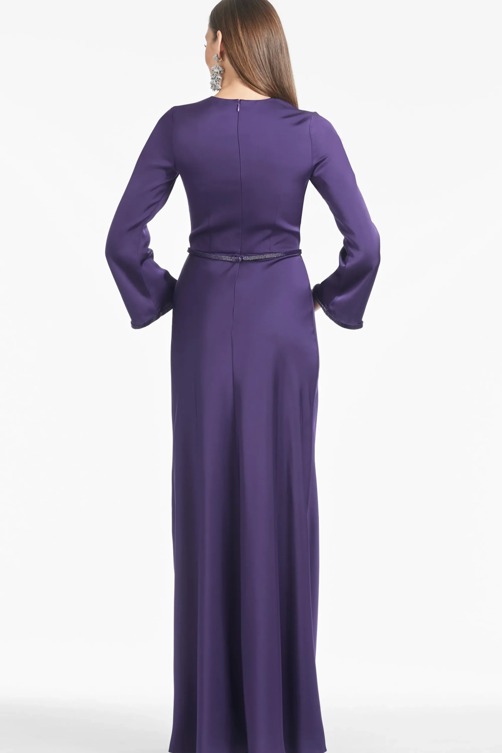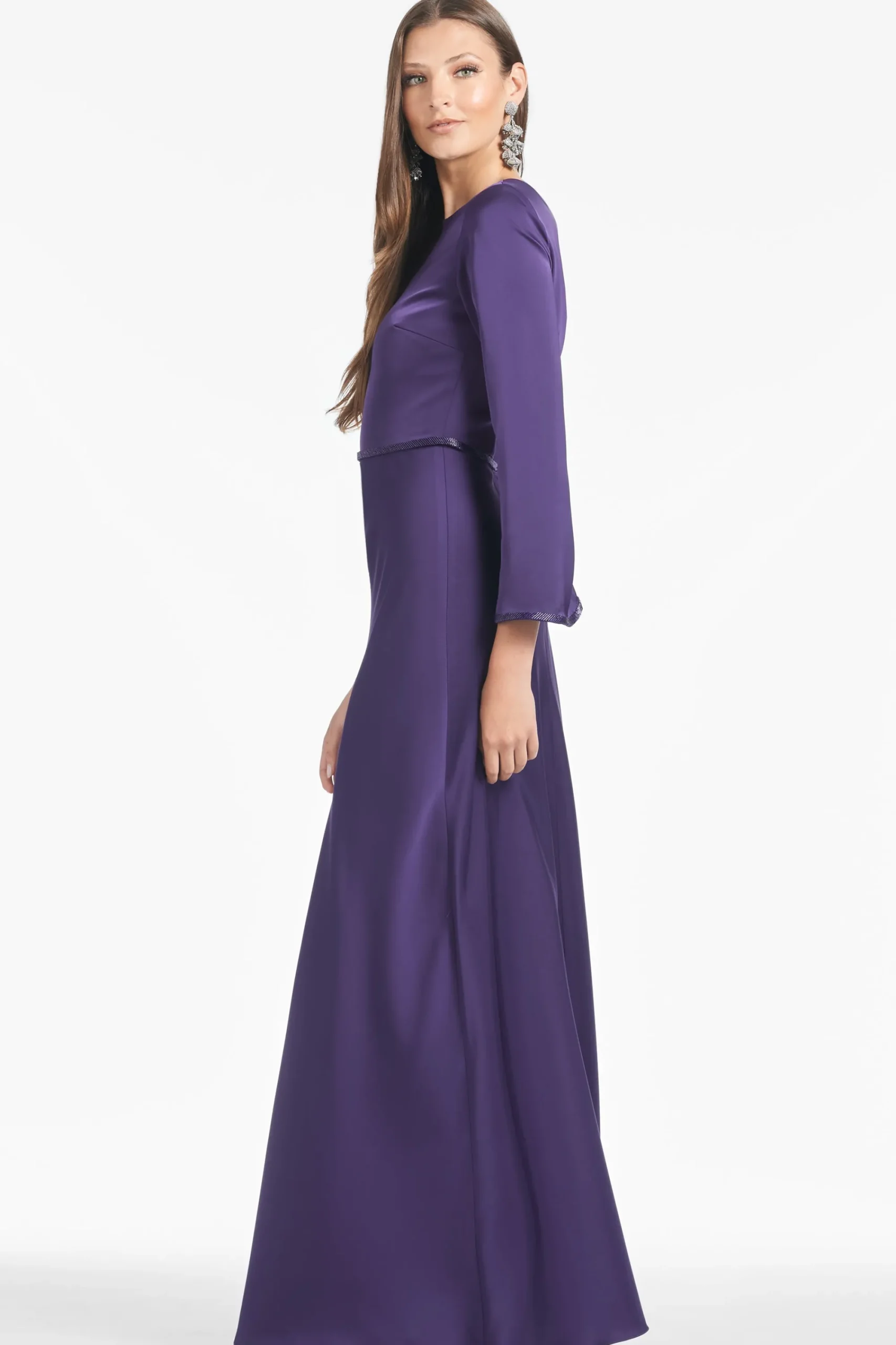 Alex is a gown who knows who she is: elegant, timeless, and chic. This long-sleeve, satin crepe dress is in a rich Amethyst with hand beading at the waist and cuff for a subtle glamour that will allow this dress to remain relevant for many years to come.