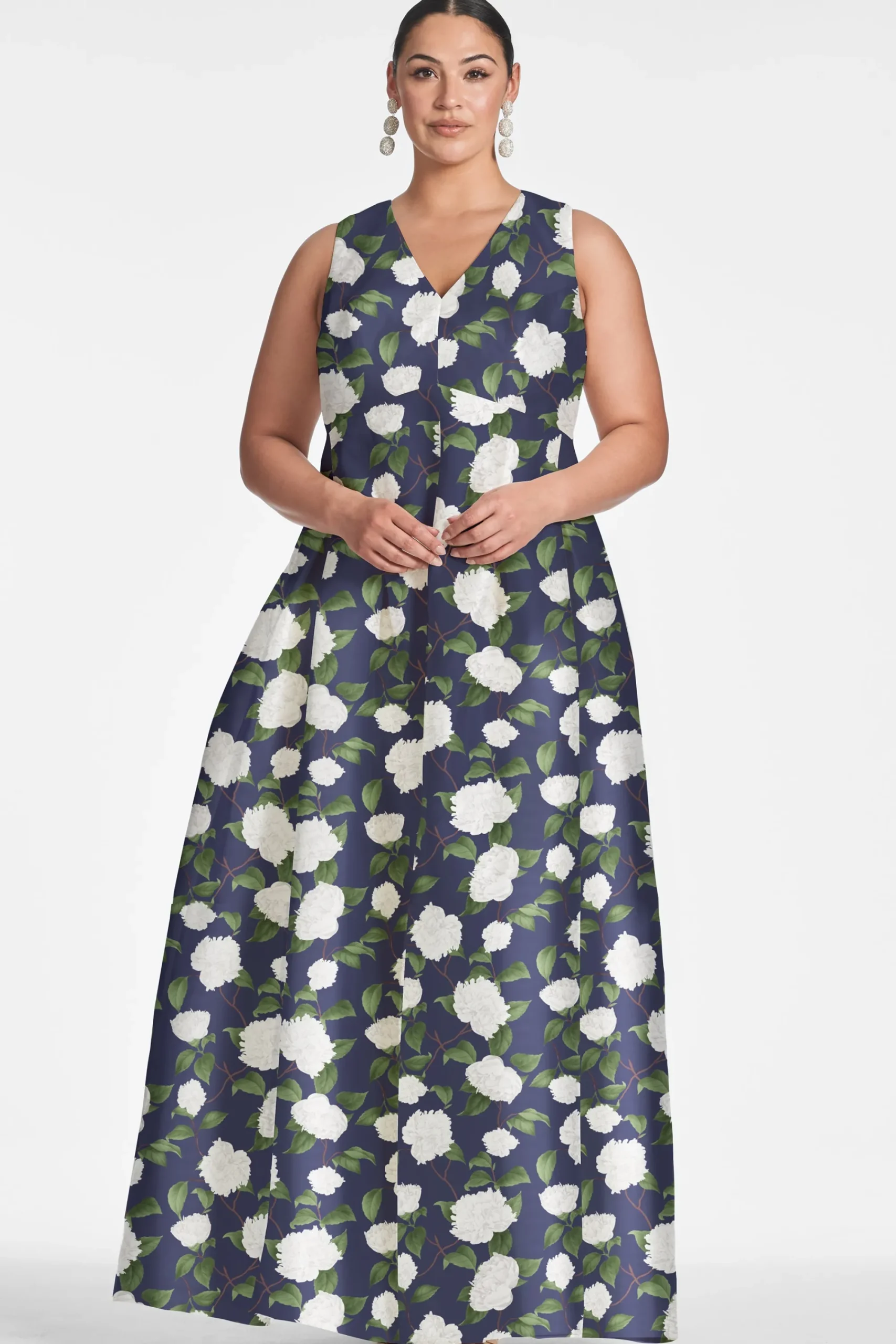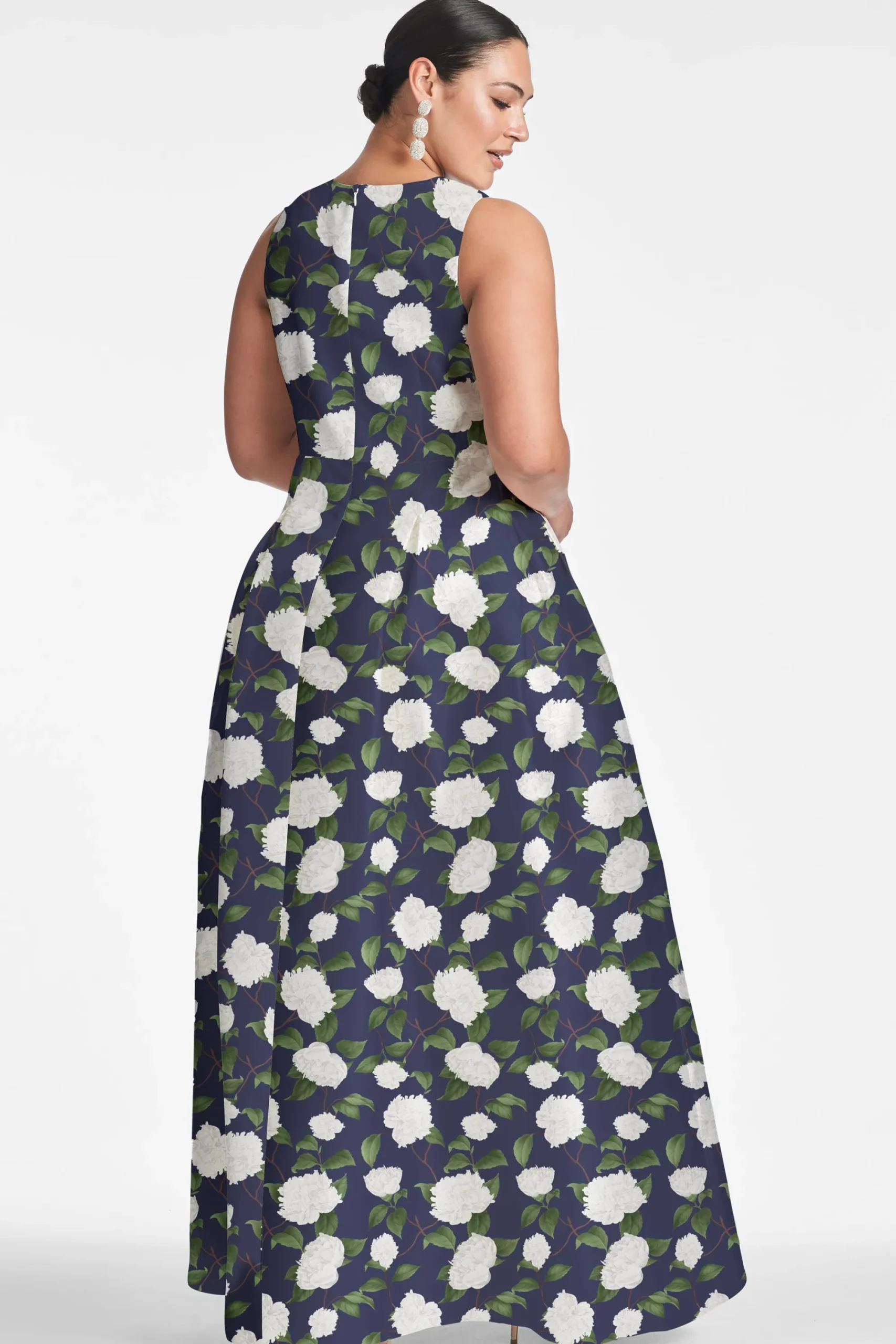 The Brooke is our V-neck gown with box pleats, peaked waist seam, and side pockets. This dress is what we consider to be a classic, essential silhouette, a perfect canvas for our most breathtaking prints. This one is featured in Navy Moonlit Garden, our peony print with gorgeous touches of green and ivory.