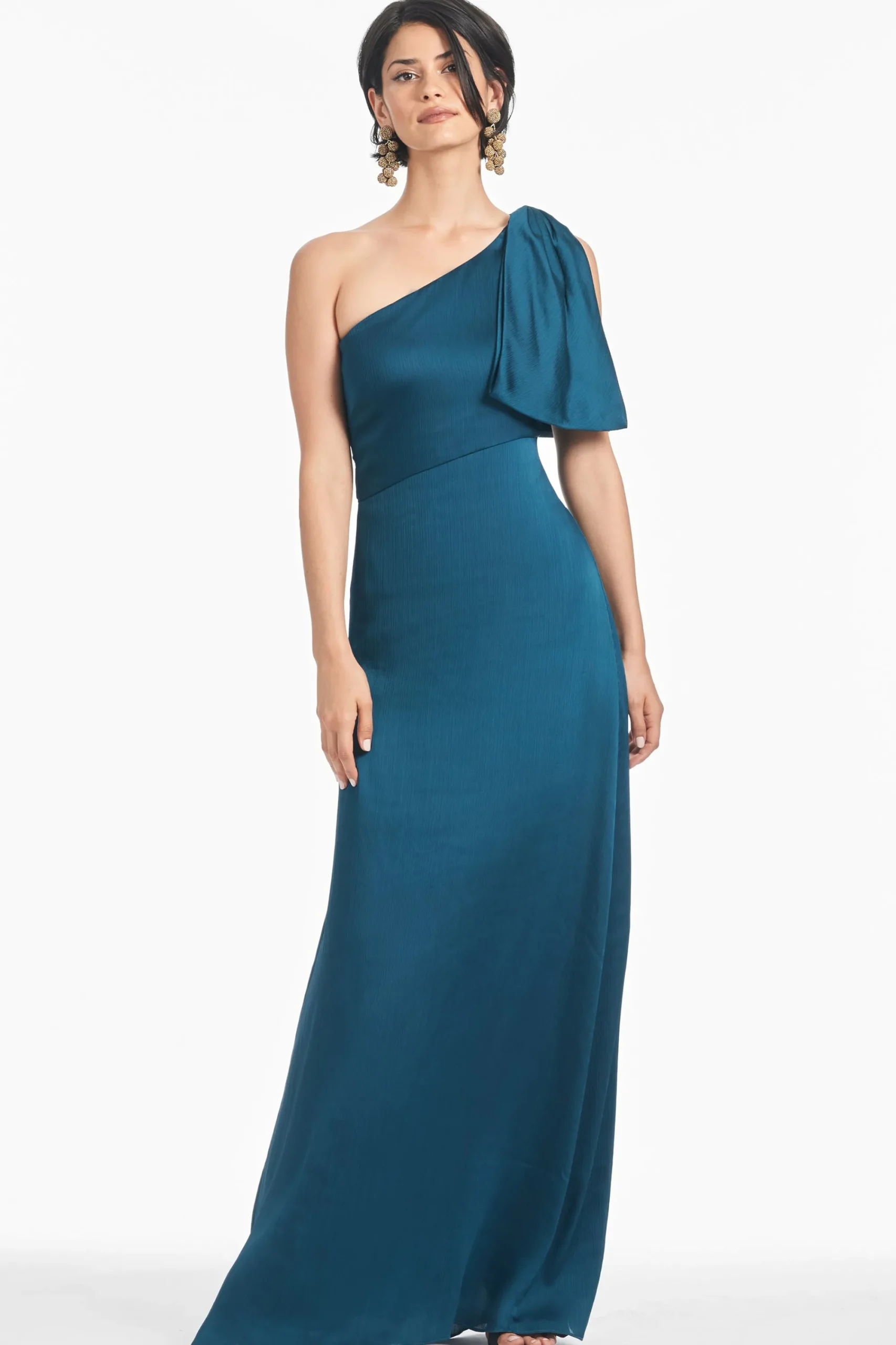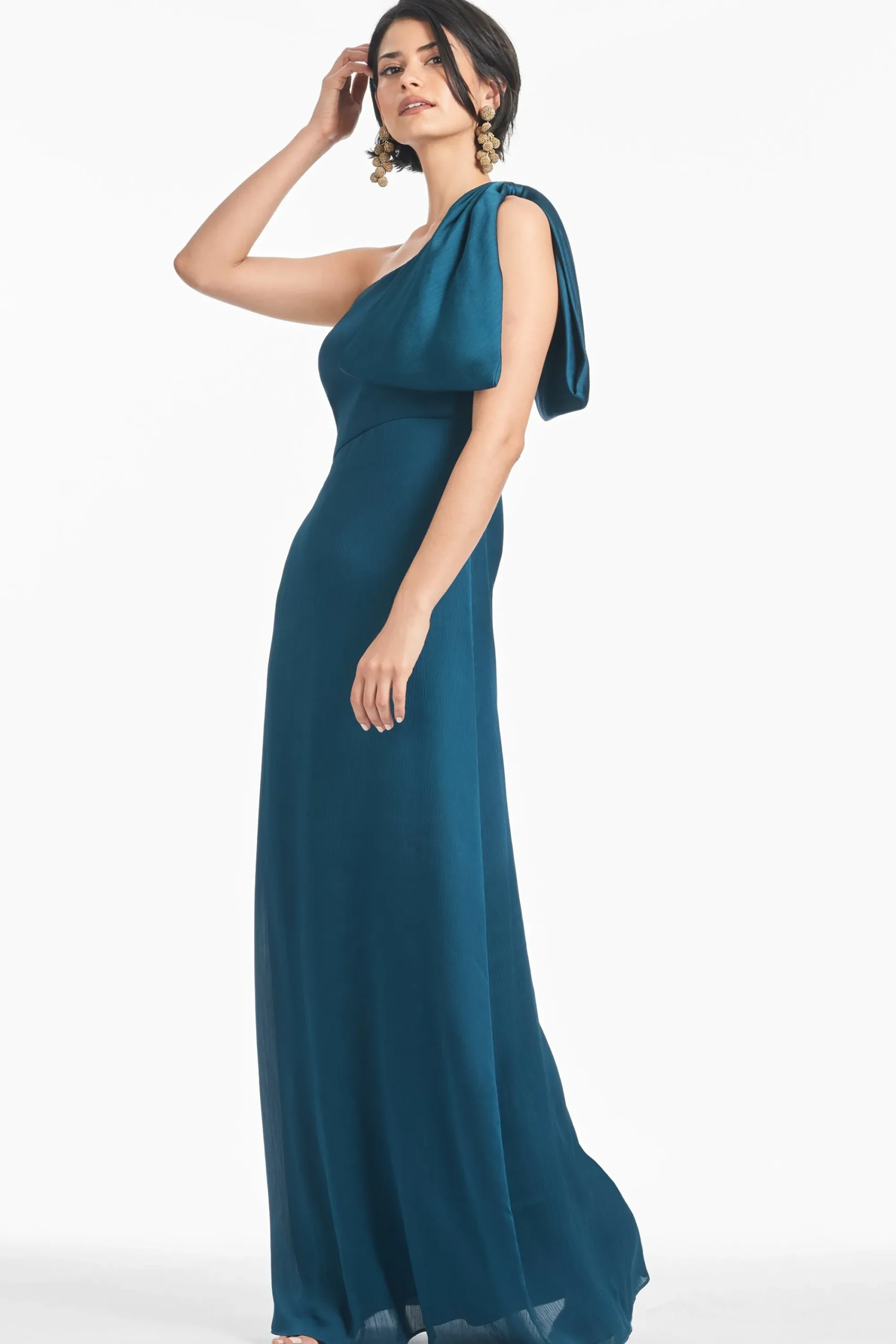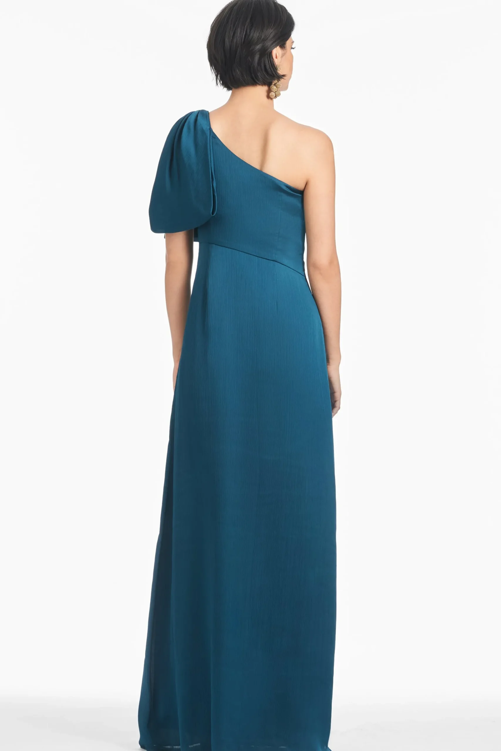 The Chelsea gown in Bottle Green is an example of balance by design. A sleek sleeve of crinkle georgette is cut on the bias with an asymmetric seam at the waist, creating a column for curves. At the shoulder sits a hand-tucked, stitched-on collapsed bow. We design all of our Essential Social dresses with the intention that they can be enjoyed again and again. After all, a beautiful dress should be worn often and well.