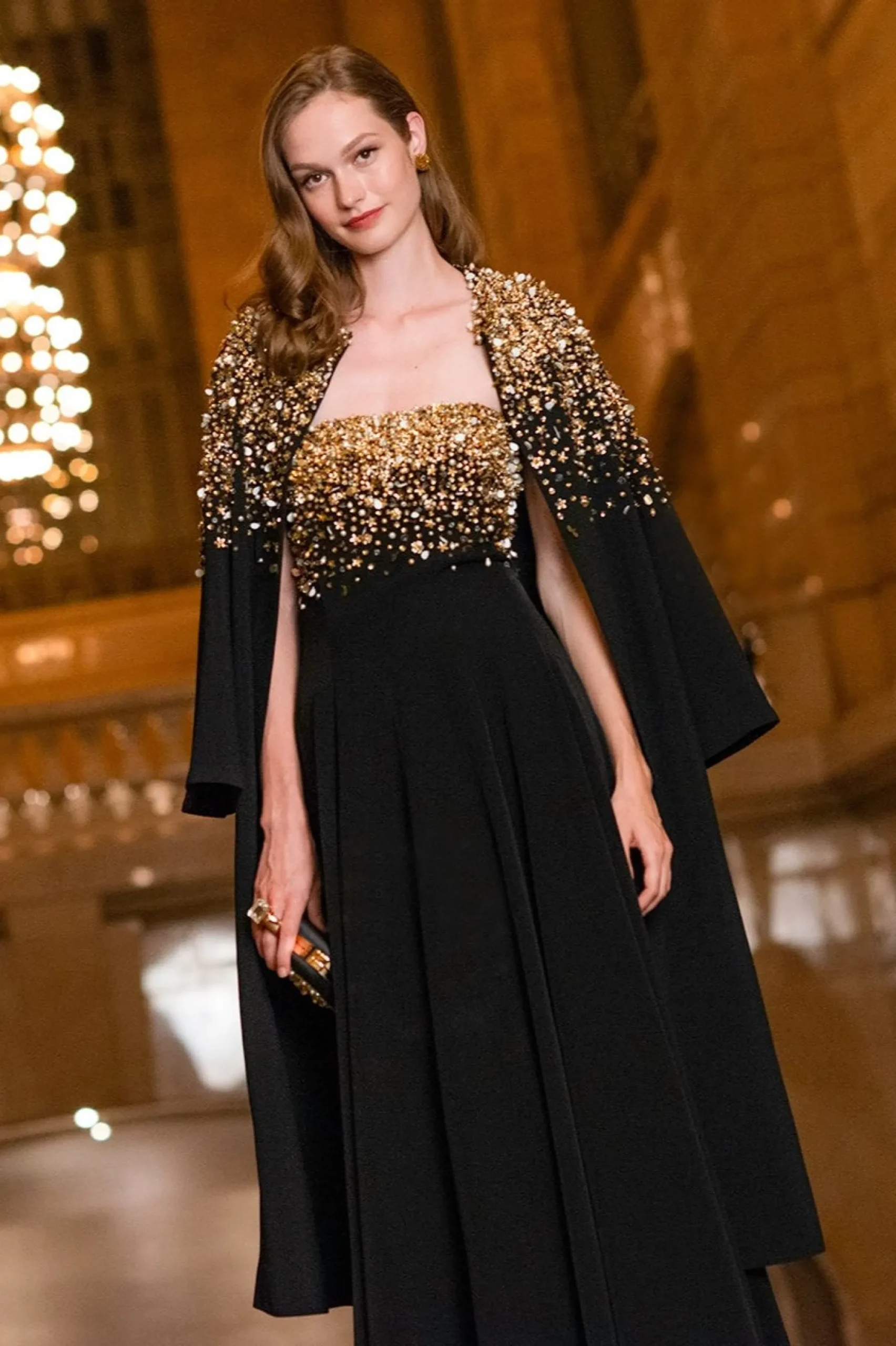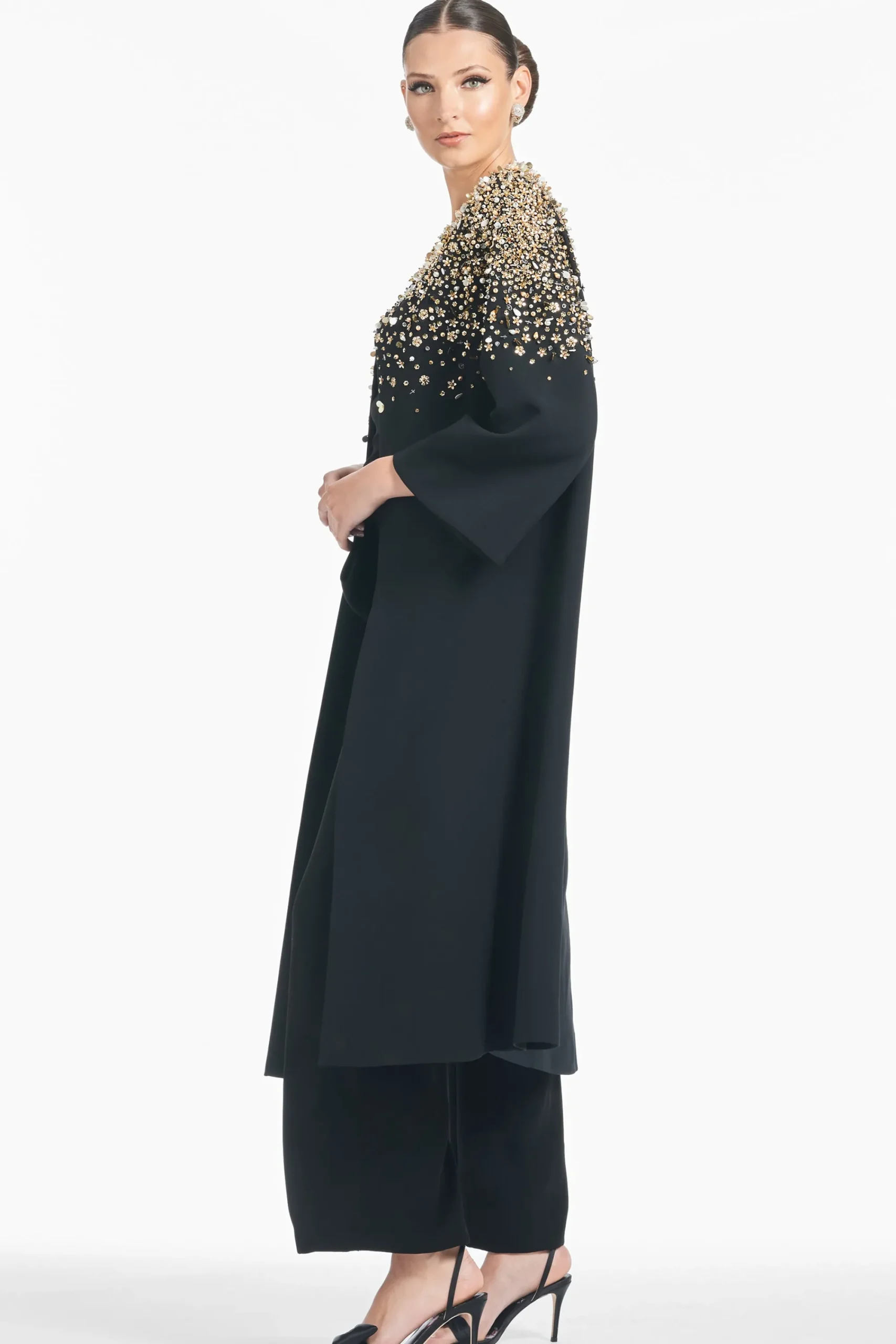 Timeless and dramatic, the Prima Coat is a grande addition to any wardrobe. The seasonless crepe fabric gives it a luxurious look with a relaxed, intentionally easy fit. Hand placed gold and pearl embellishment blanket the neckline catching the light in all the right ways. This is not for the faint-fashioned hearted; this is for all of our bold glamour girls!