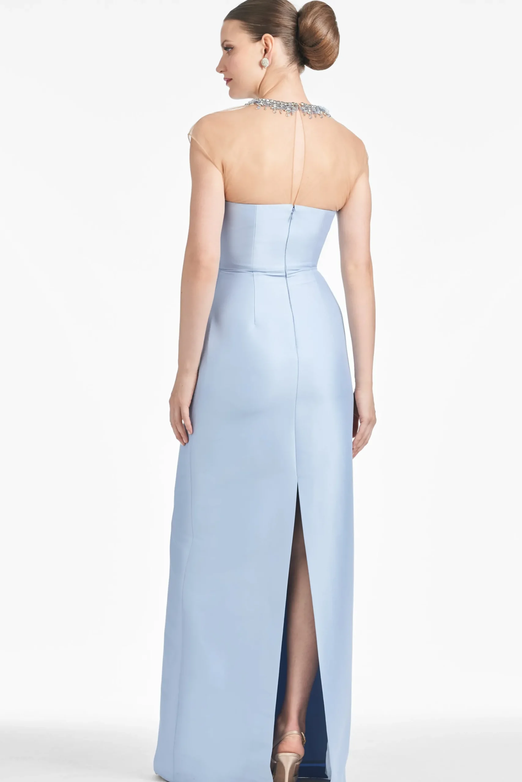 Experience timeless elegance in the Irina Gown in Glacial Blue. This exquisite gown is crafted from stretch Mikado fabric for a truly luxurious feel. A beautiful illusion neckline adorned with intricately beaded embellishments adds an air of sophistication. Showcase your style with this elegant column gown – perfect for the mother of the bride or other special occasions.