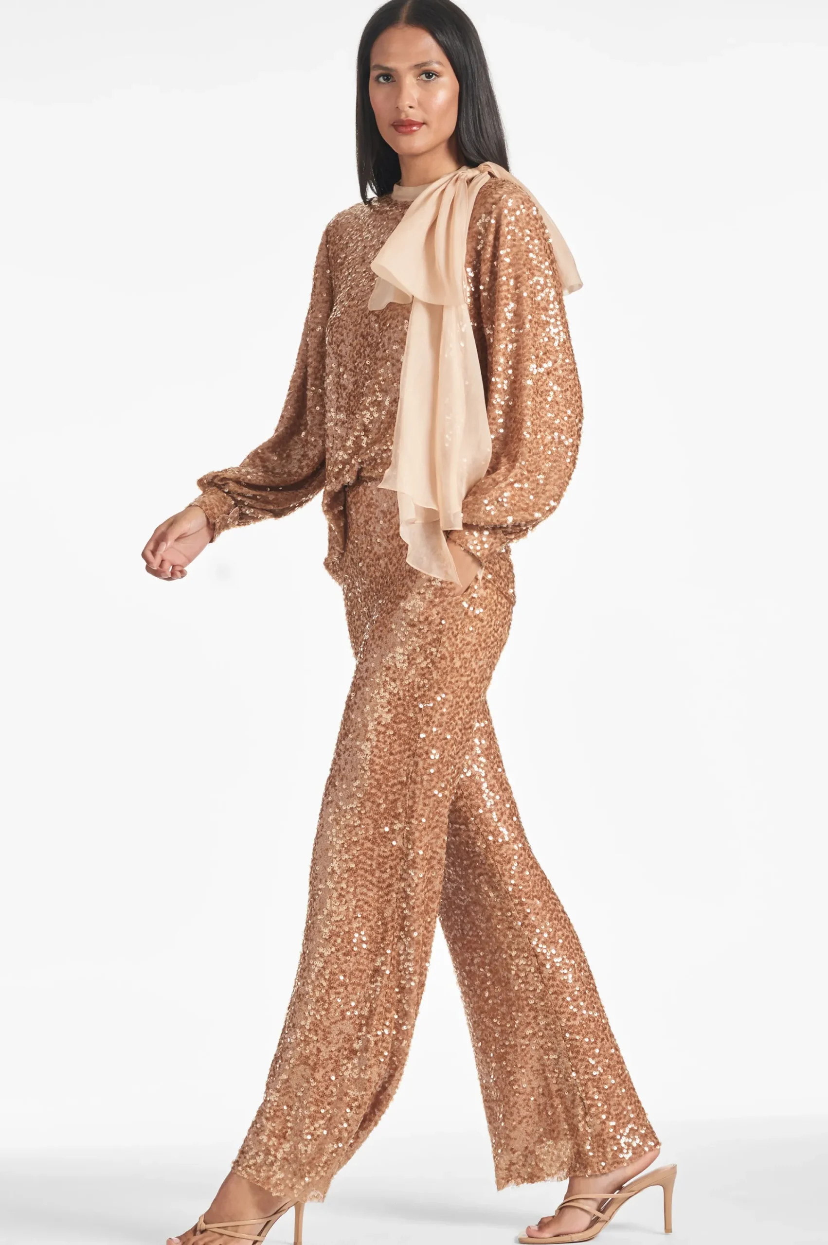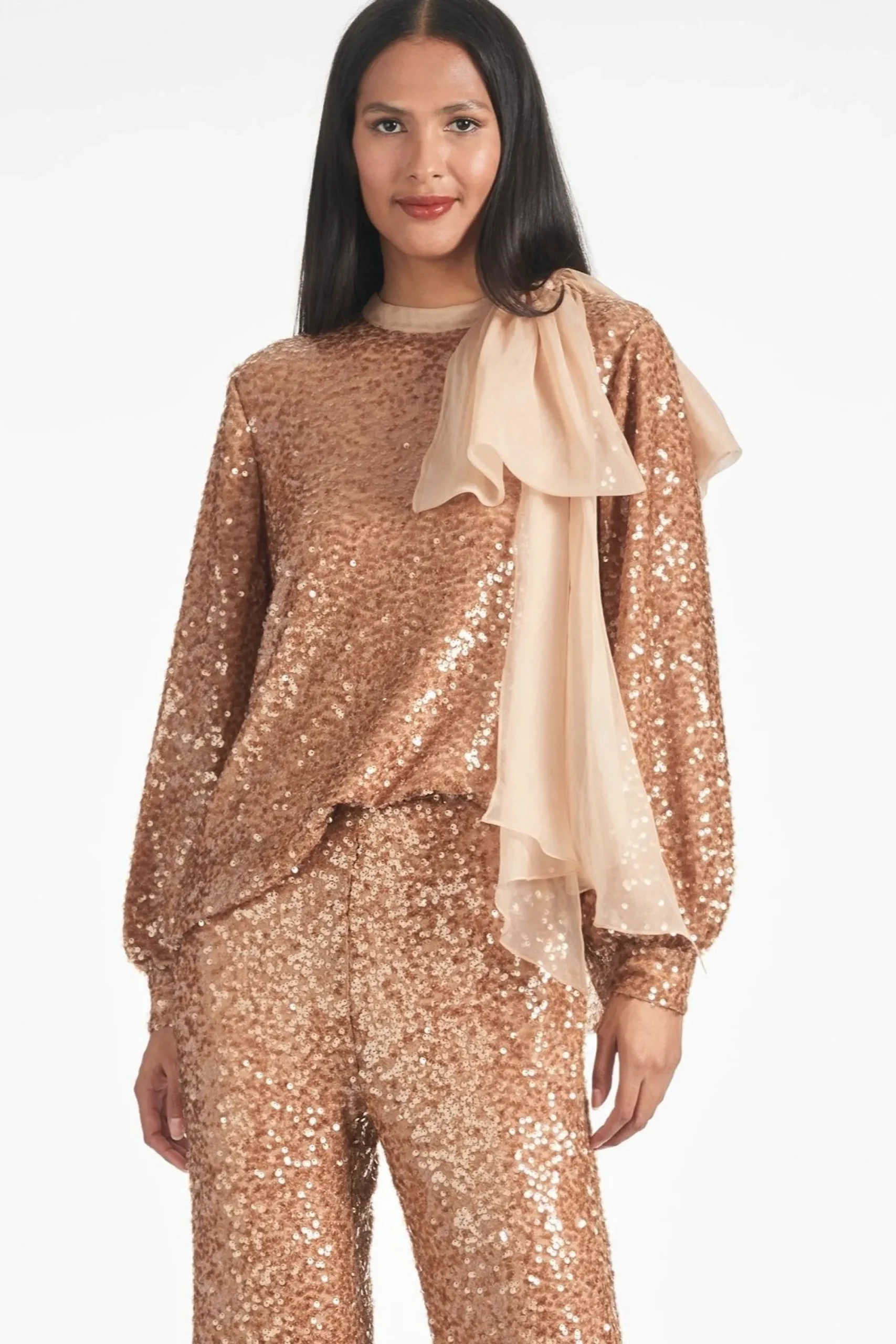 This long sleeve top is crafted with shimmery sequins for a sparkle and shine you will love with an oversized organza bow on the shoulder. The perfect party-ready piece, it’s a must-have addition to your wardrobe for any special occasion. With a coordinating set of bottoms, you’ll sparkle in this unique set.