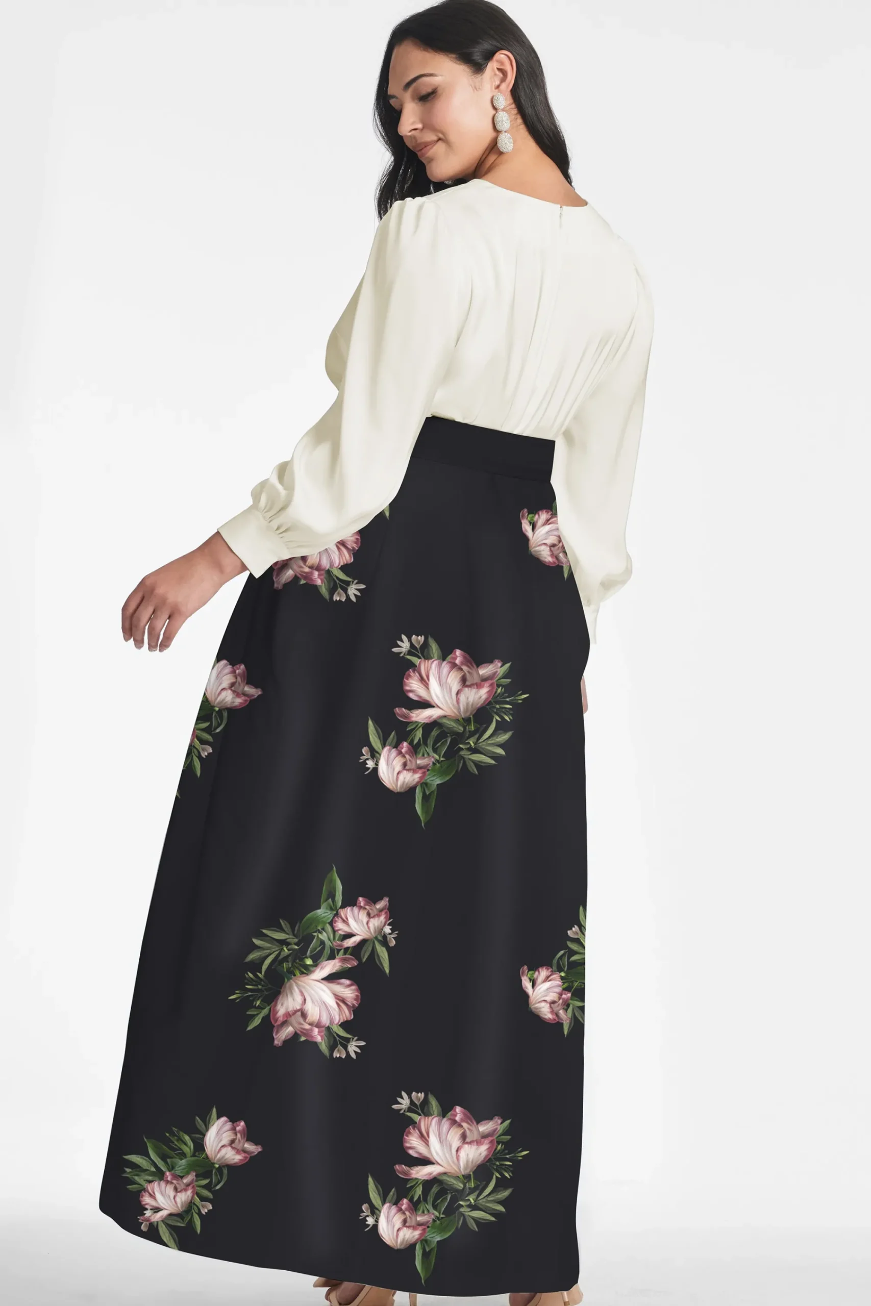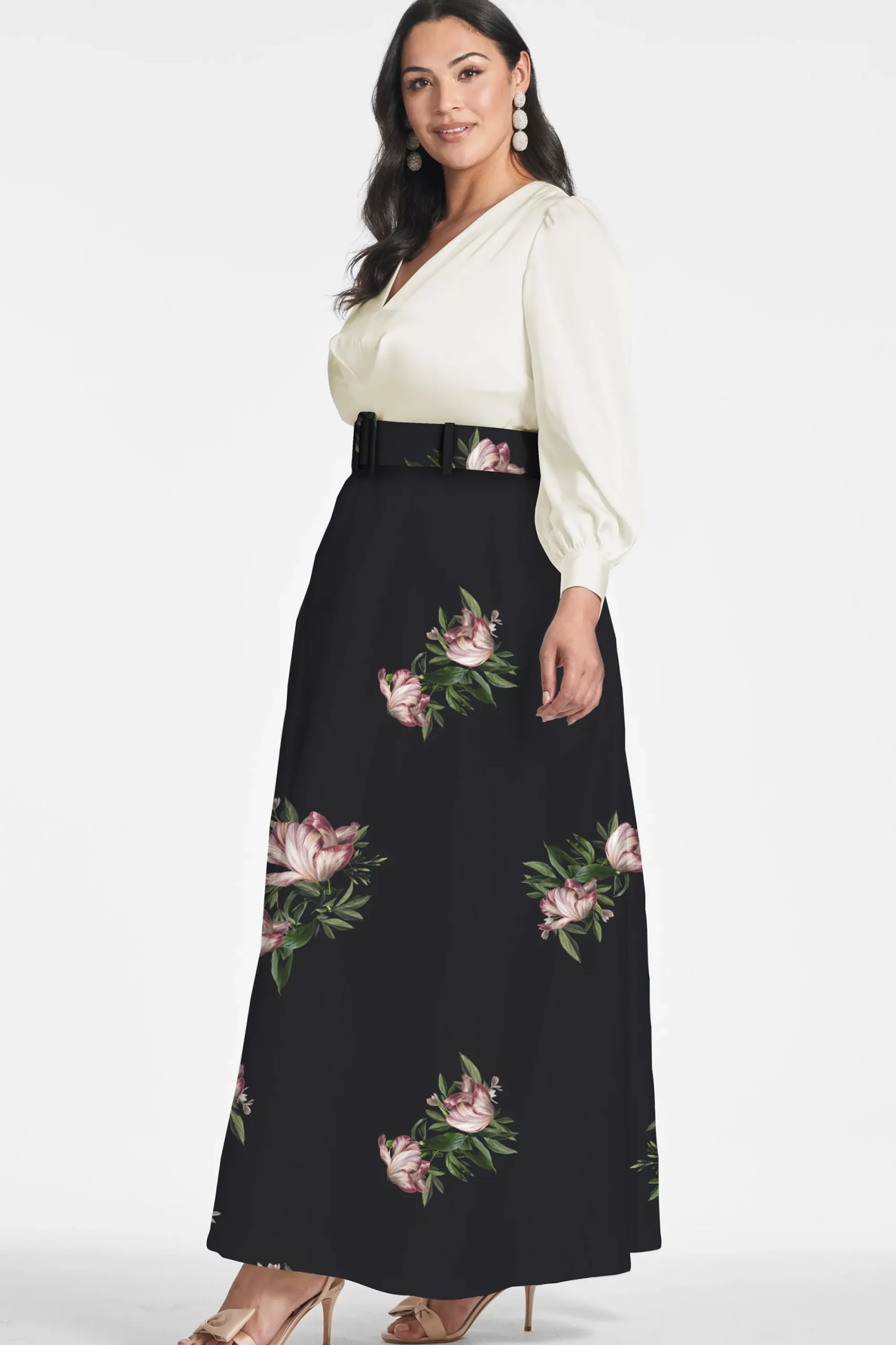 The Zoe Gown is the “Grande Dame” of the occasion. The deep V-neck slate satin crepe bodice meets the printed Mikado s…