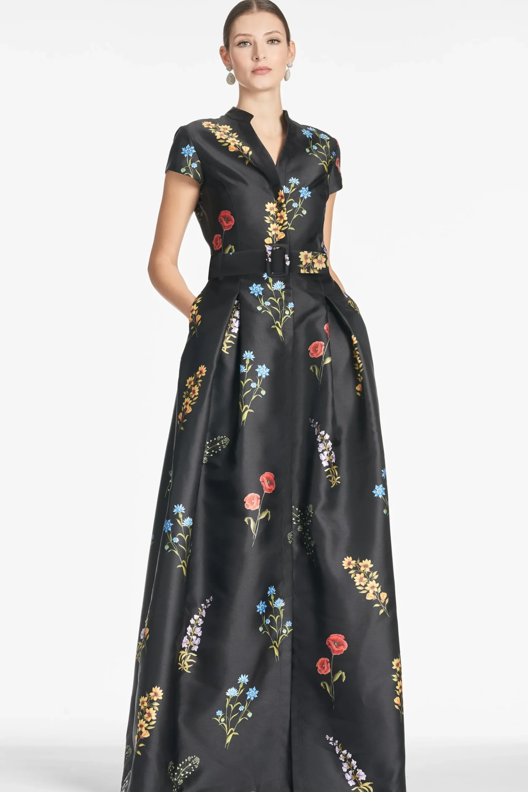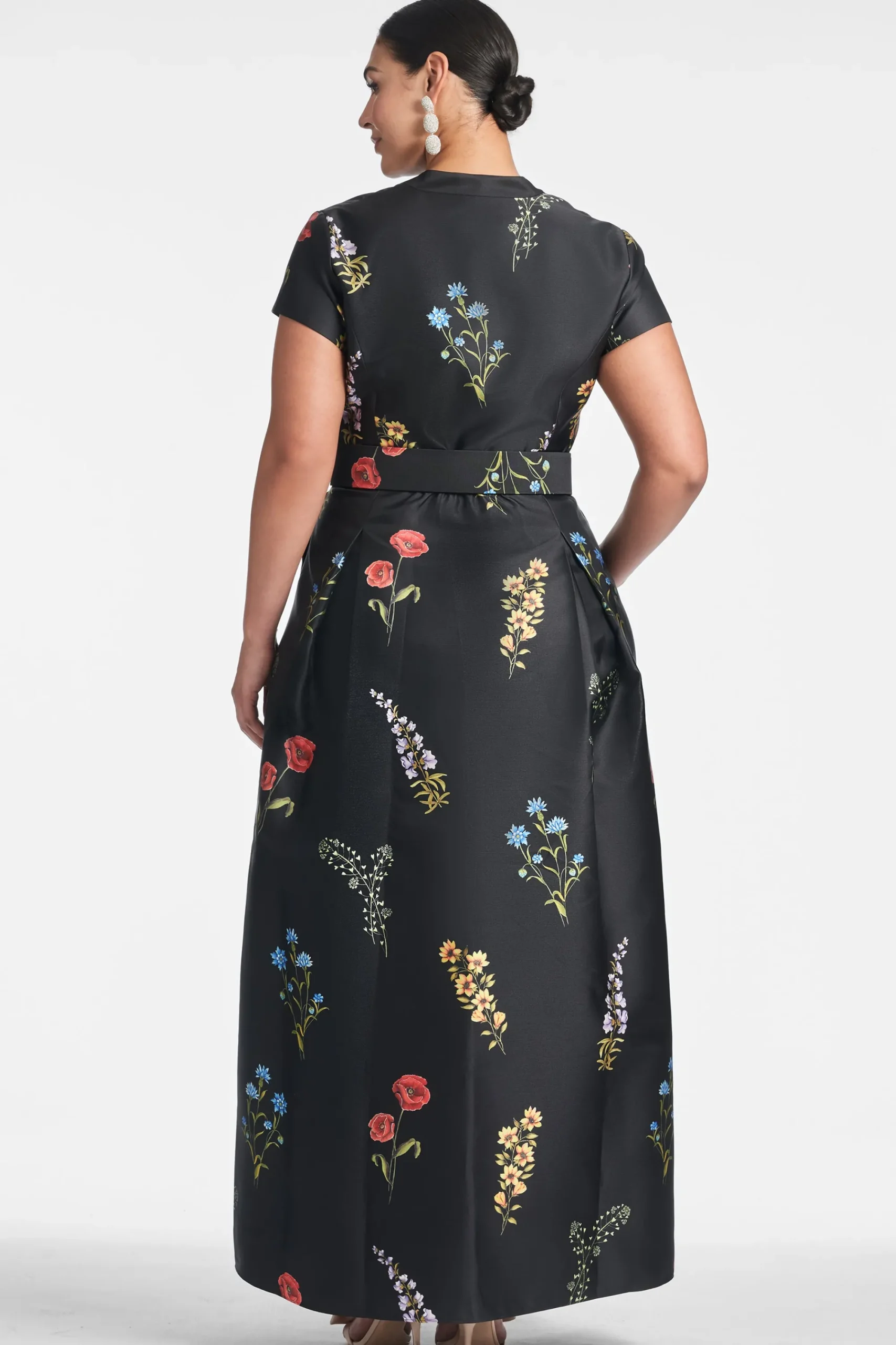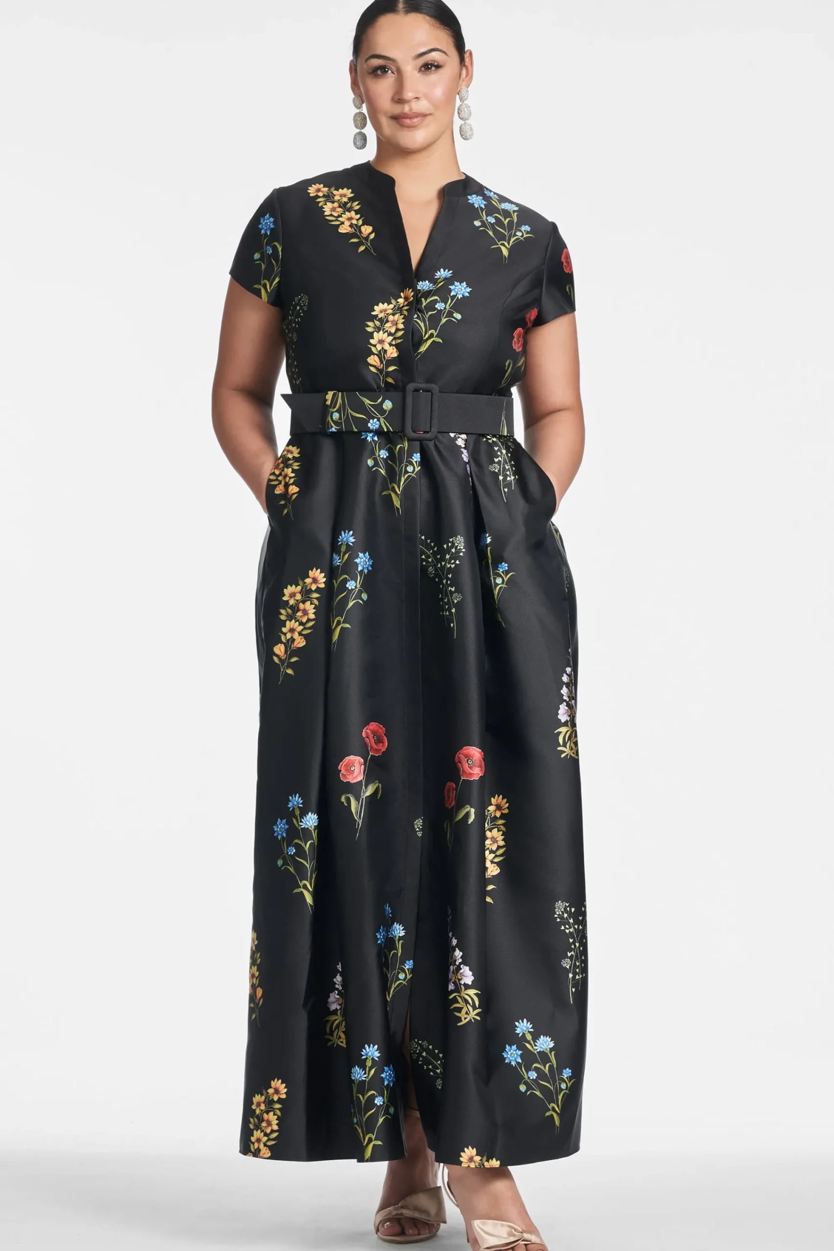 Make no mistake, the Marta Gown isn’t a wall flower. She is the epitome of timeless, elevated personal style, and quiet luxury. The fit and print are everything. The floor length silhouette is partially inspired by the impeccable tailoring a “shirt style” fit. This incredibly flattering body finds its way into our hero Noir Bouquet print. A banded collar is tastefully cut away to meet concealed front buttons. Our black Mikado fabric with the multi-color florals make this dress a classic and a statement all at once.