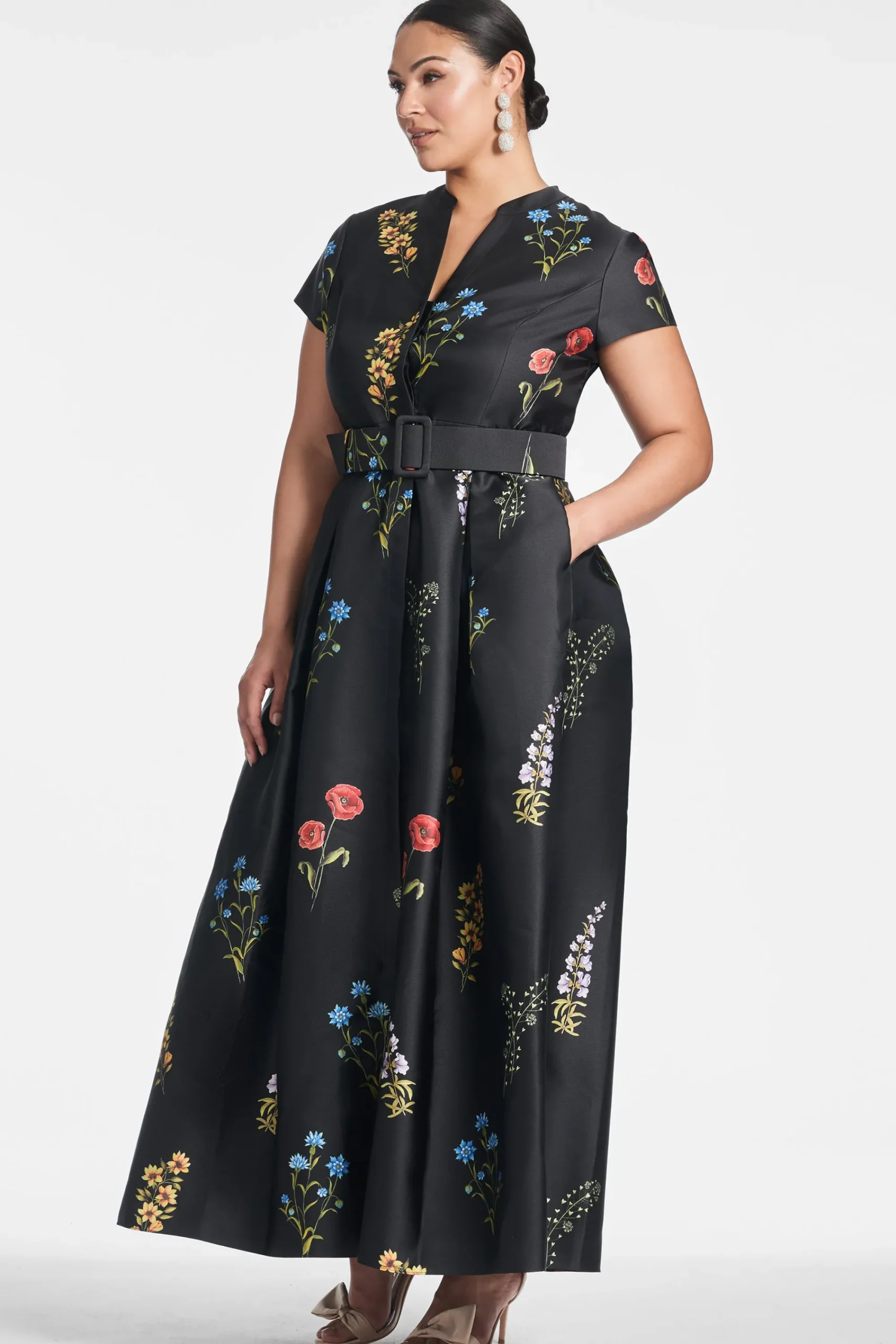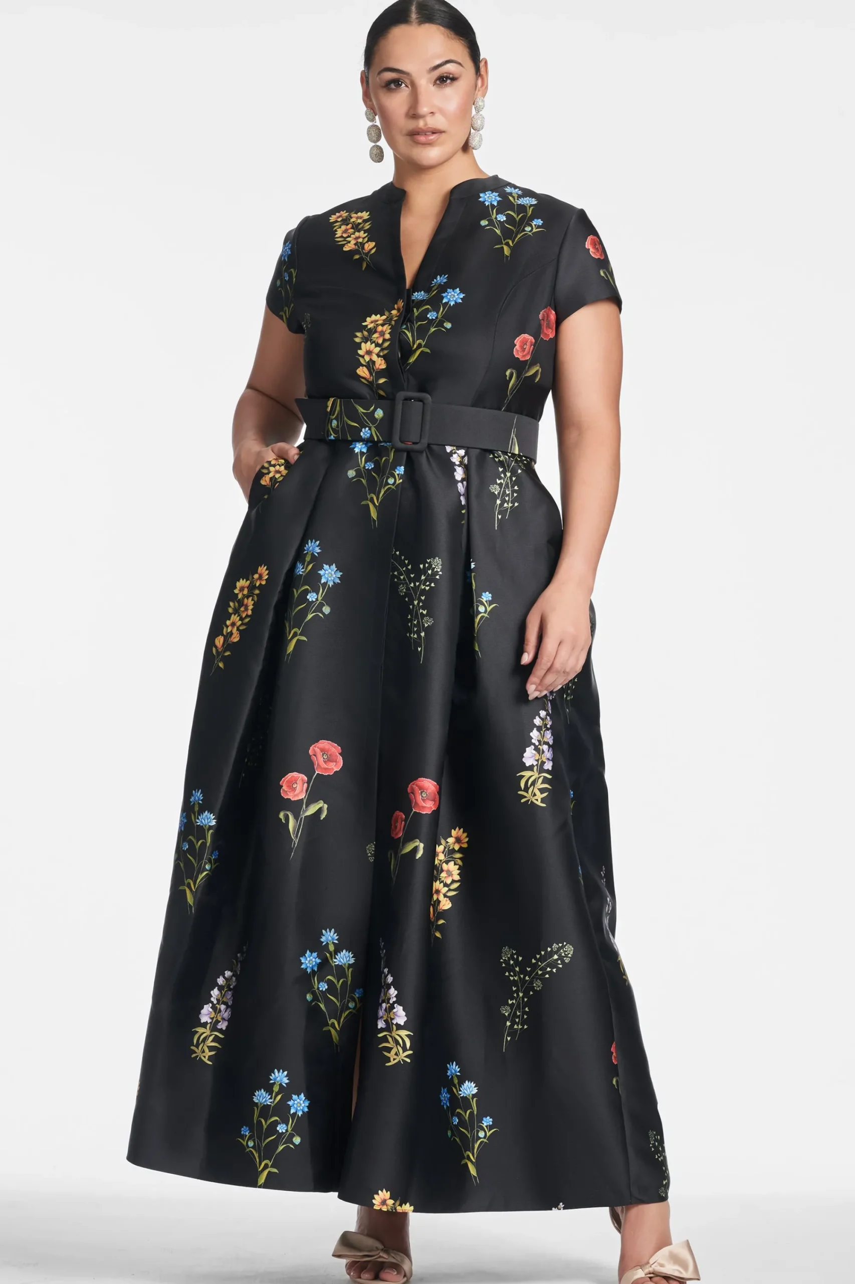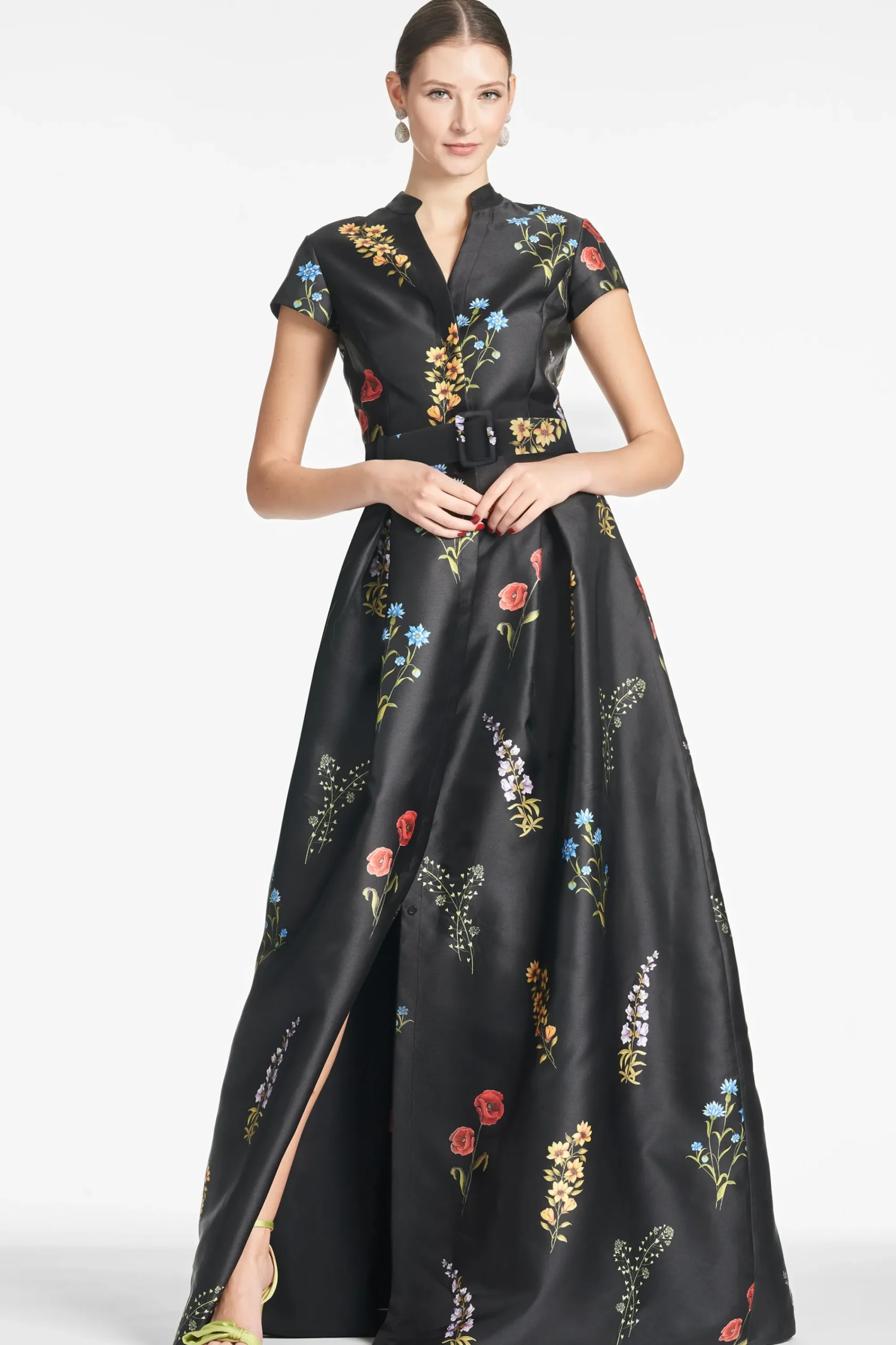 Make no mistake, the Marta Gown isn’t a wall flower. She is the epitome of timeless, elevated personal style, and quiet luxury. The fit and print are everything. The floor length silhouette is partially inspired by the impeccable tailoring a “shirt style” fit. This incredibly flattering body finds its way into our hero Noir Bouquet print. A banded collar is tastefully cut away to meet concealed front buttons. Our black Mikado fabric with the multi-color florals make this dress a classic and a statement all at once.