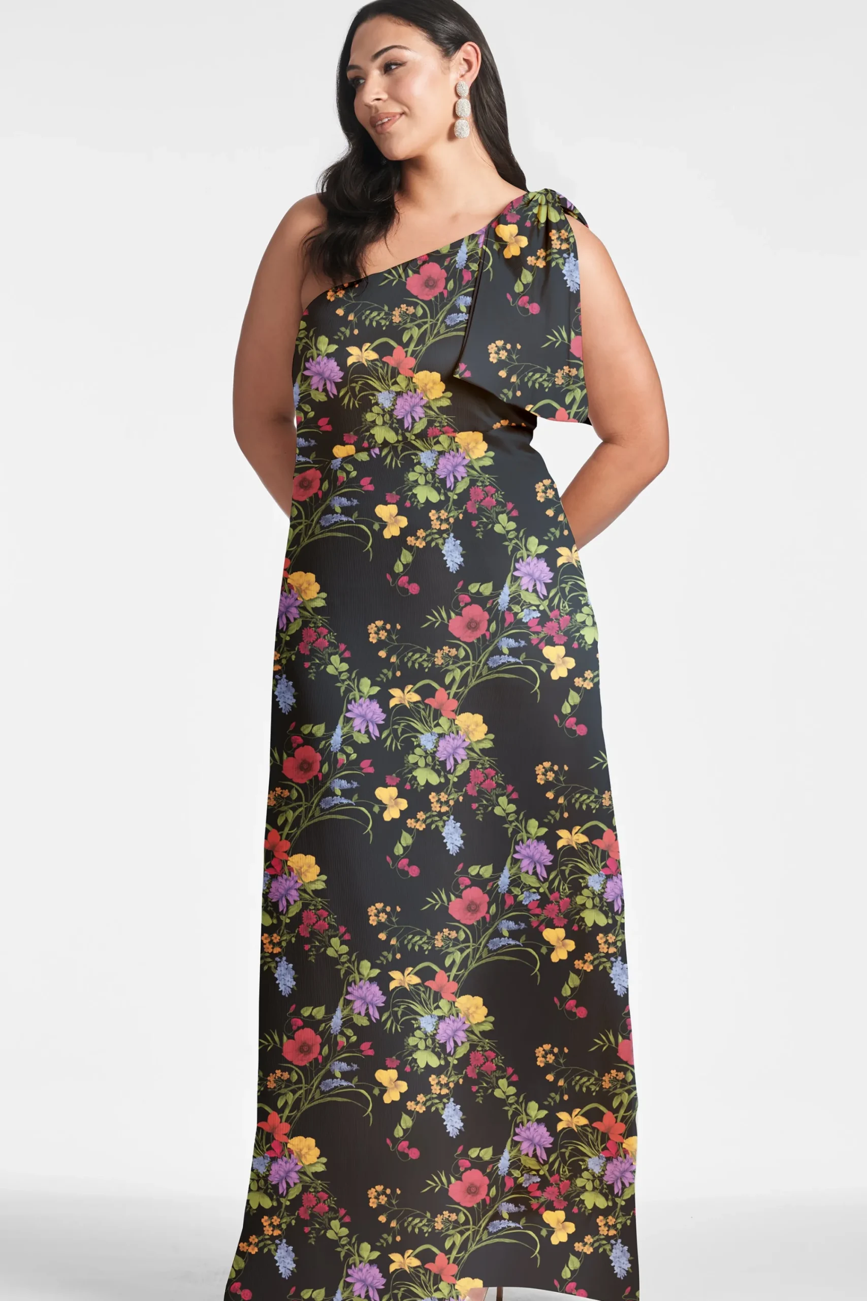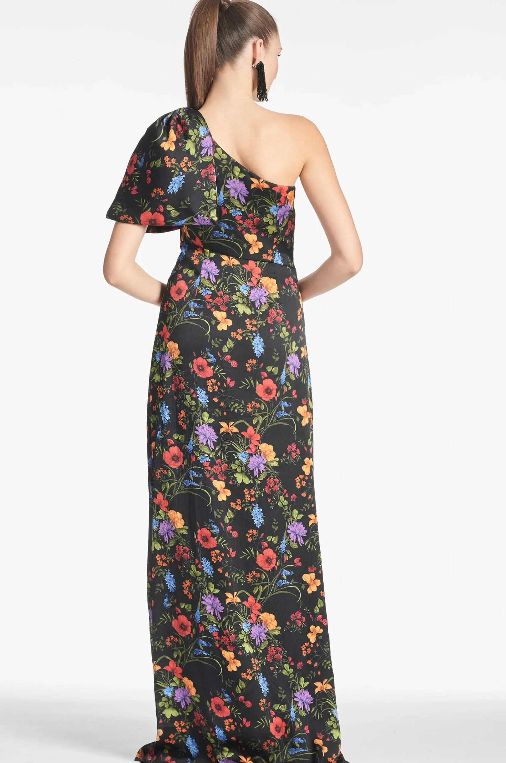 The Chelsea gown in our Noir Wildflower print is an example of balance by design. A sleek sleeve of crinkle georgette is cut on the bias with an asymmetric seam at the waist, creating a column for curves. At the shoulder sits a hand-tucked, stitched-on collapsed bow. We design all of our Essential Social dresses with the intention that they can be enjoyed again and again. After all, a beautiful dress should be worn often and well.