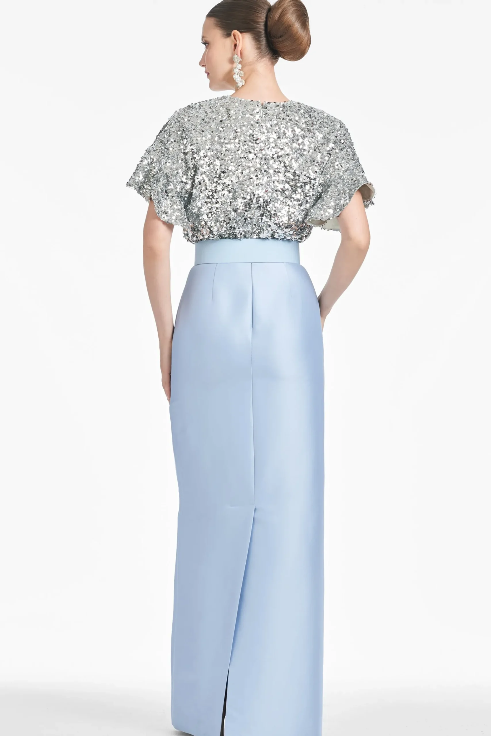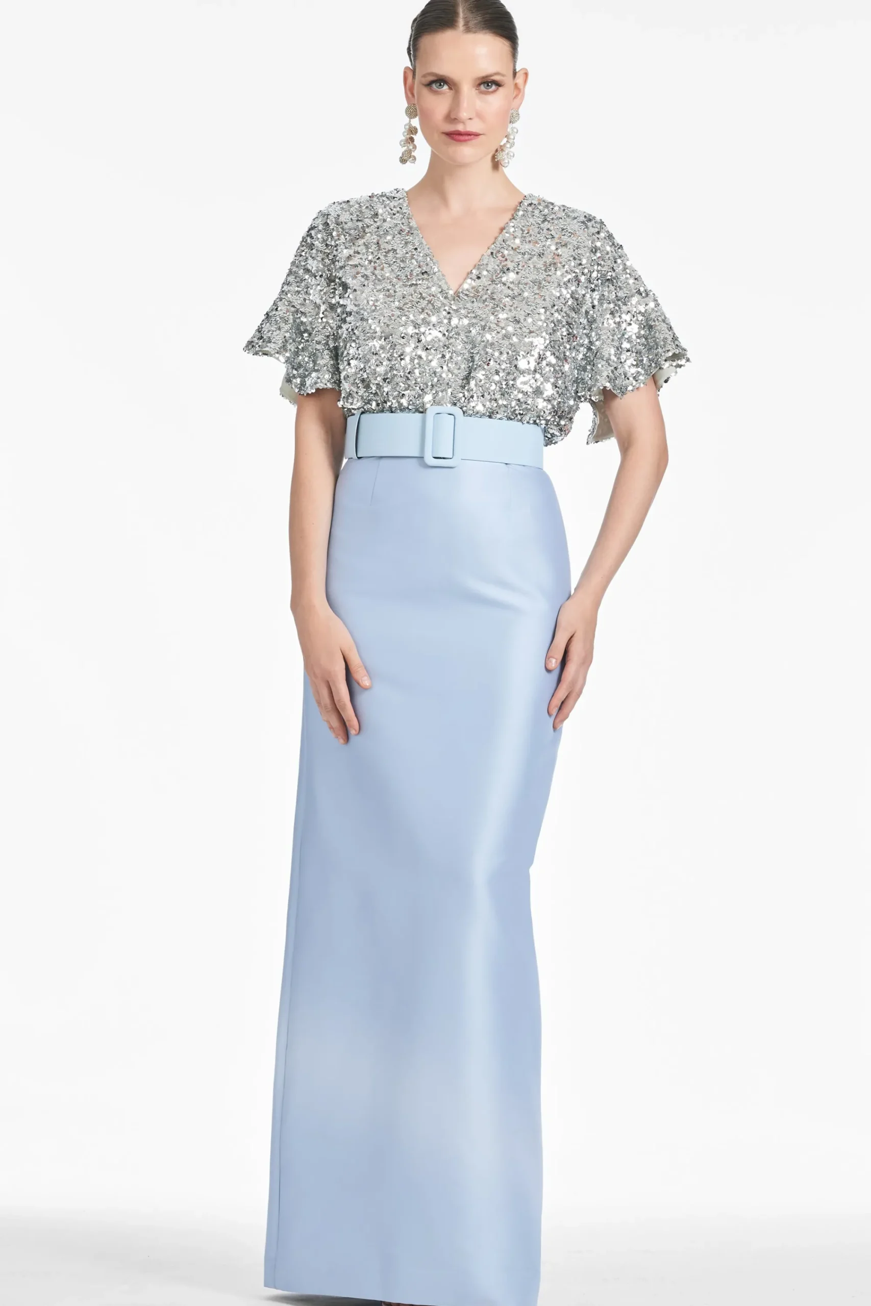 Prepare to turn heads in the Marlene. A classic column skirt in double-face Mikado meets glittering metallic stretch micro-sequins for the ultimate black-tie ensemble. The drop sleeve offers an easy elegance to this otherwise classic silhouette. A self-belt in silver glacial blue completes the gown.