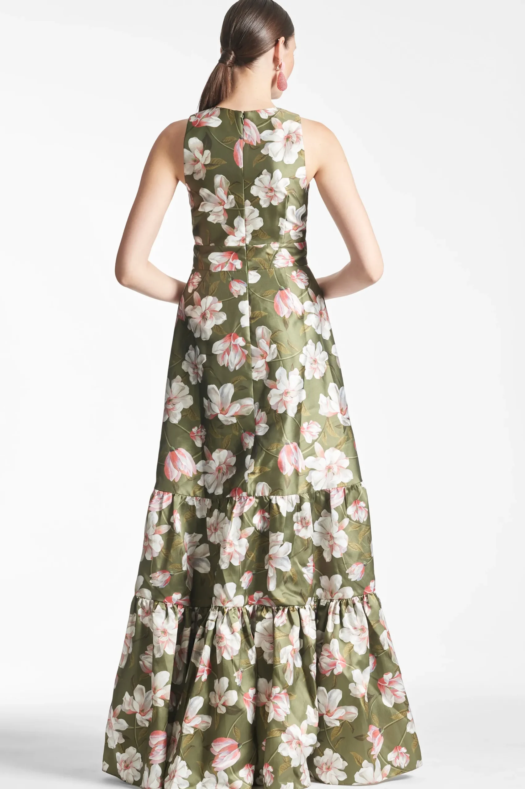Rori is not for those looking to blend, she is a show-stopping conversation piece. A clean a-line silhouette with deep v-neckline is punctuated through tiers of our moss green magnolia print. Featured in our non-stretch Mikado, she is designed to fit and flatter, cinching at the highest point of the waist and elegantly falling at the hip.
