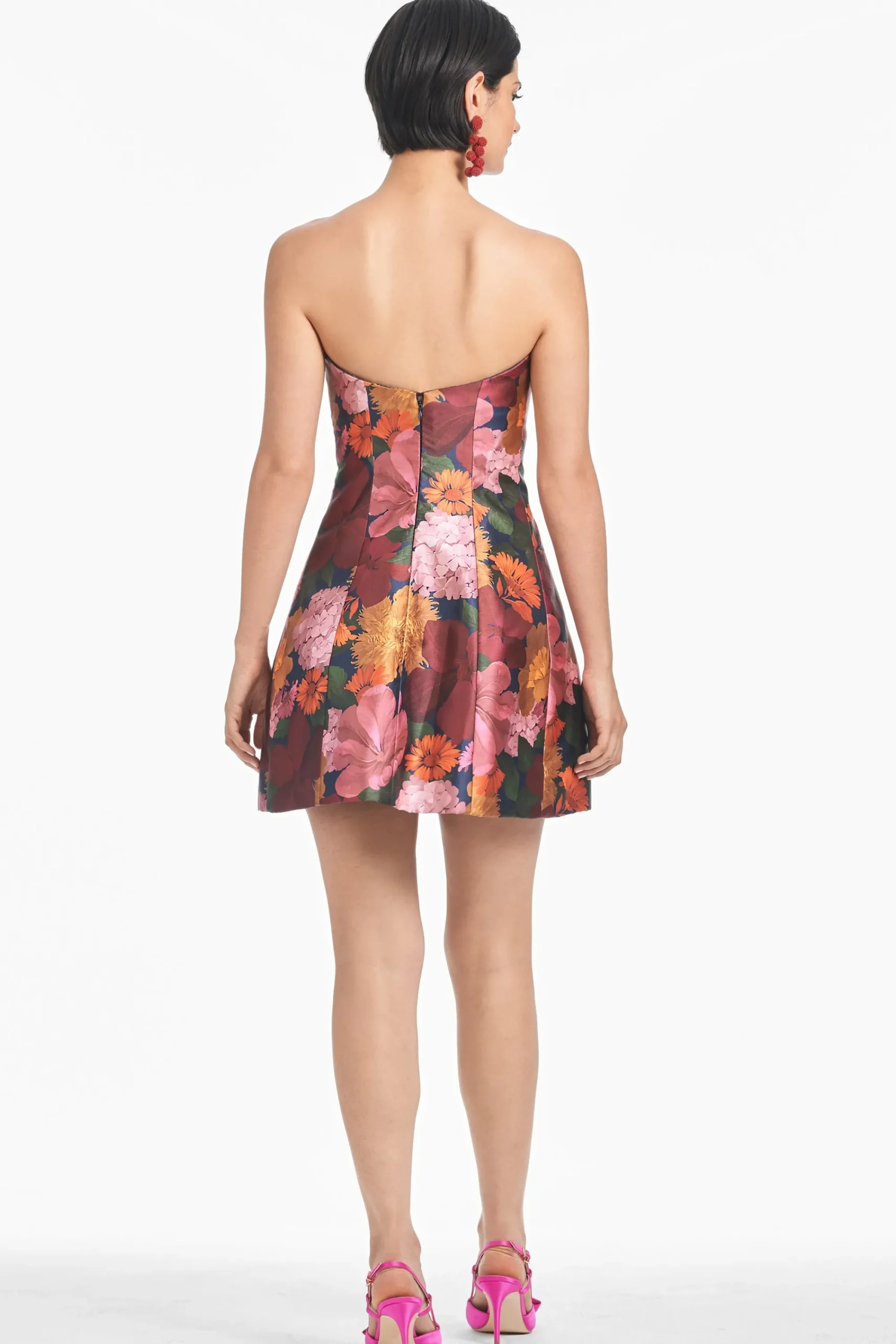 She is a sculpture articulated in bella bouquet! This ultimate little dress in bella bouquet is engineered to keep her perfect bell shape. Boning at the bodice is what allows her to defy gravity. Embroidered flowers kiss the top of the dress disappearing into the bodice. We spent many hours on this frock to make sure she is exactly what you see on the site.