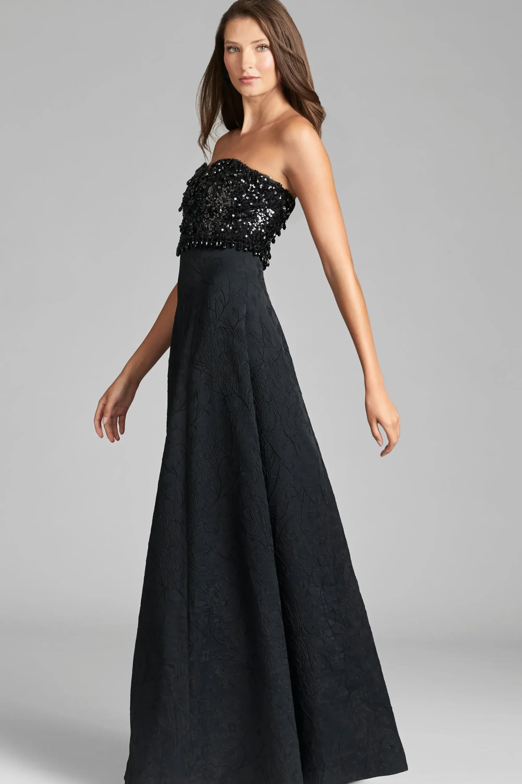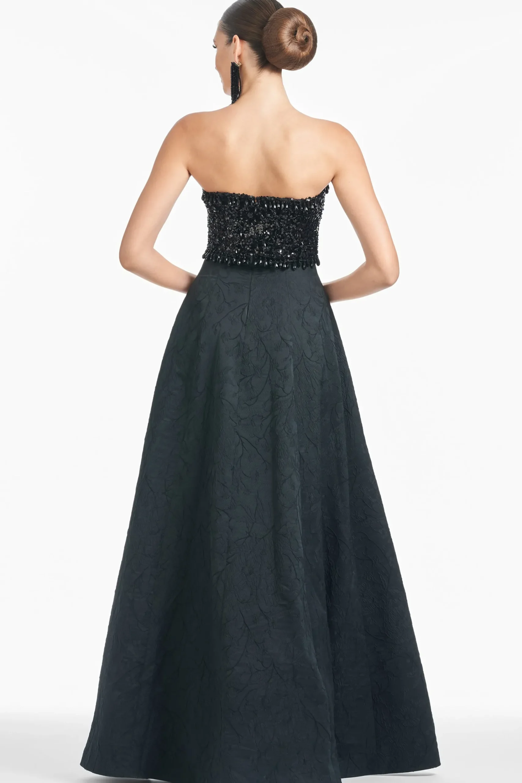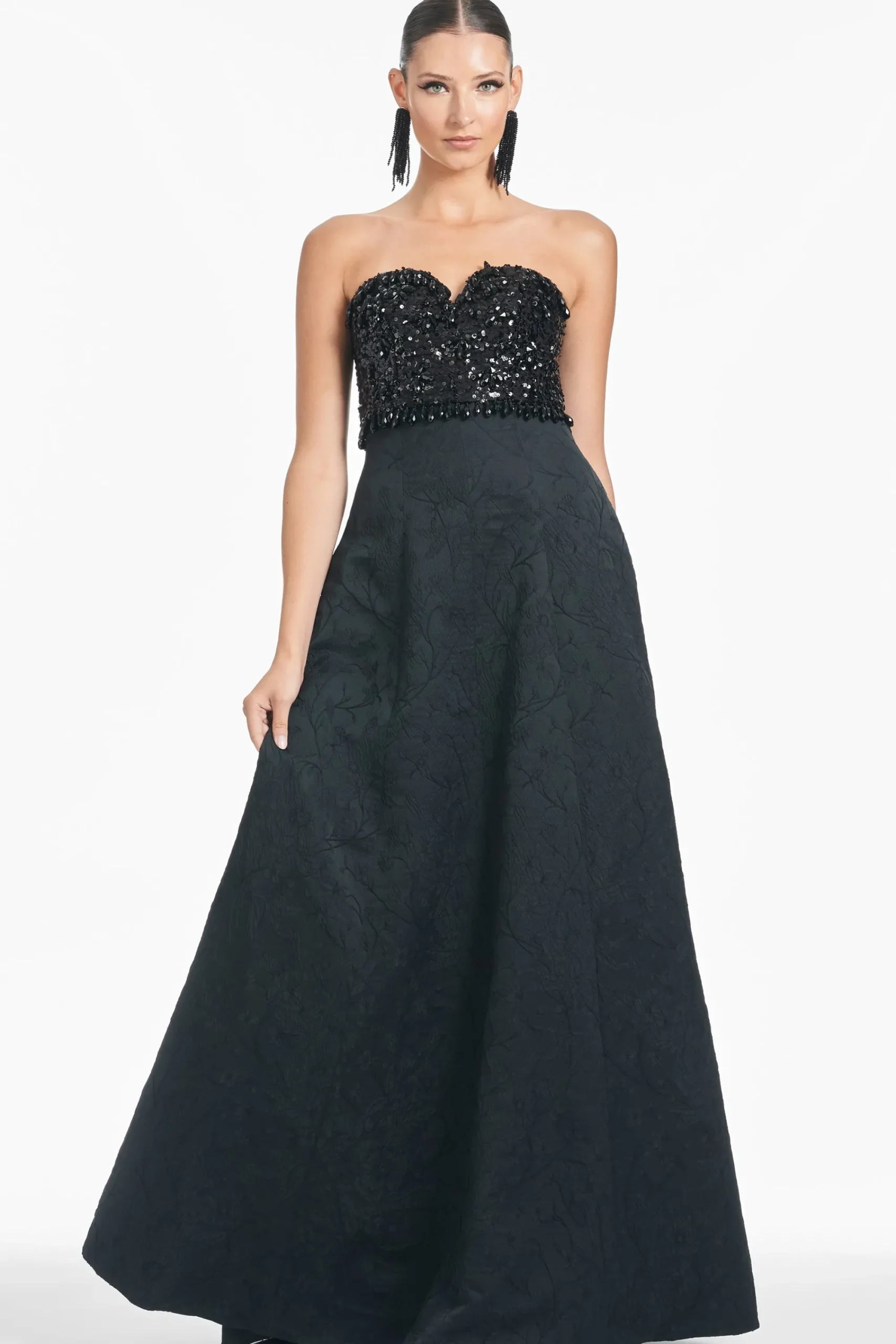 Lillian is a staple and a statement all at once. The Jacquard Cloque fabrication is exquisite on its own, but it’s made even more fabulous with the sequin and drop embellishment at the sweetheart neckline. She cascades into a subtle A-line to create the dreamiest black-tie gown.