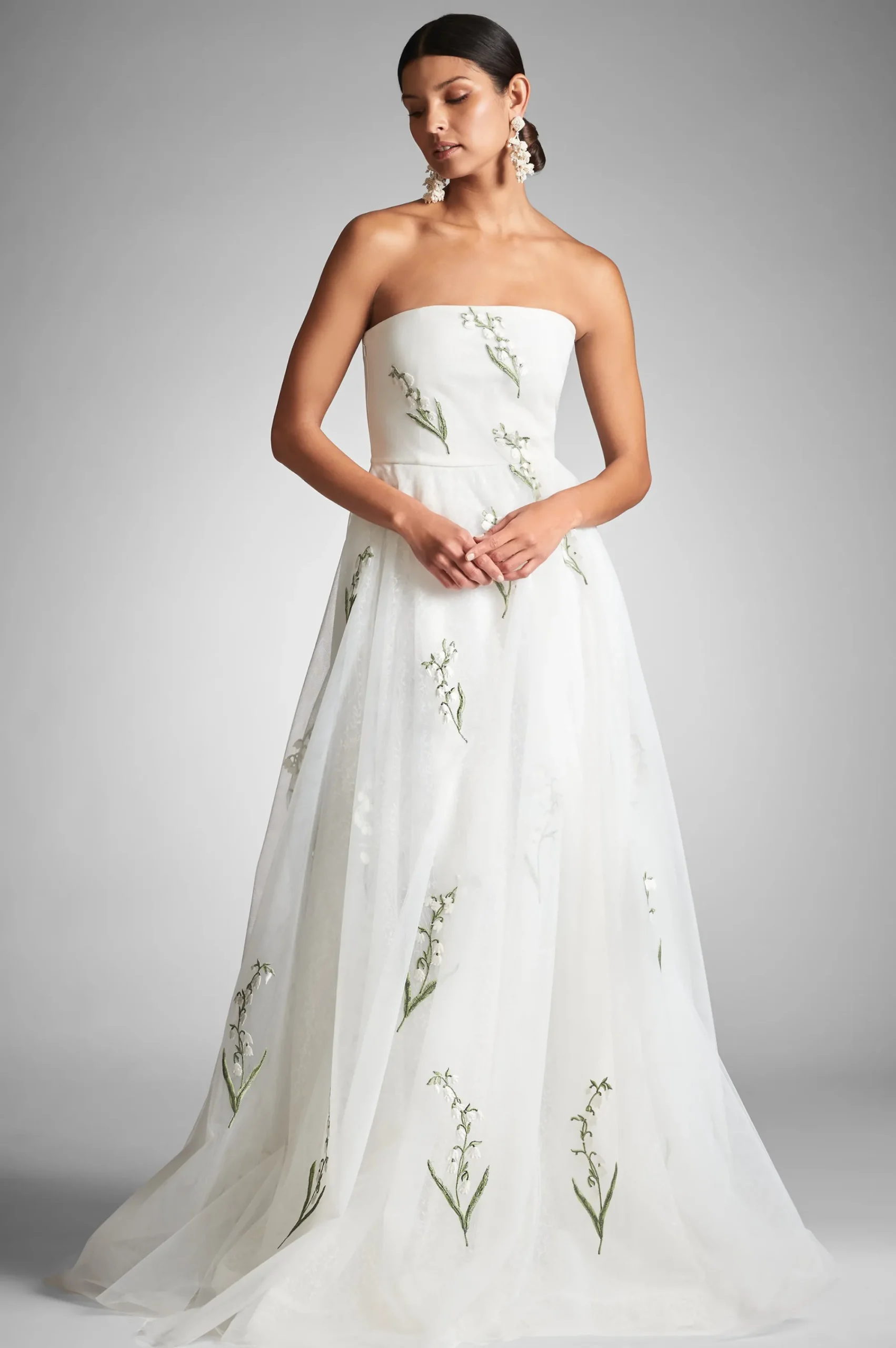 Look stunning on your special day in the Anais Gown. Flowing layers of tulle and lace are adorned with impressive scattered Lily of the Valley floral embroidery.