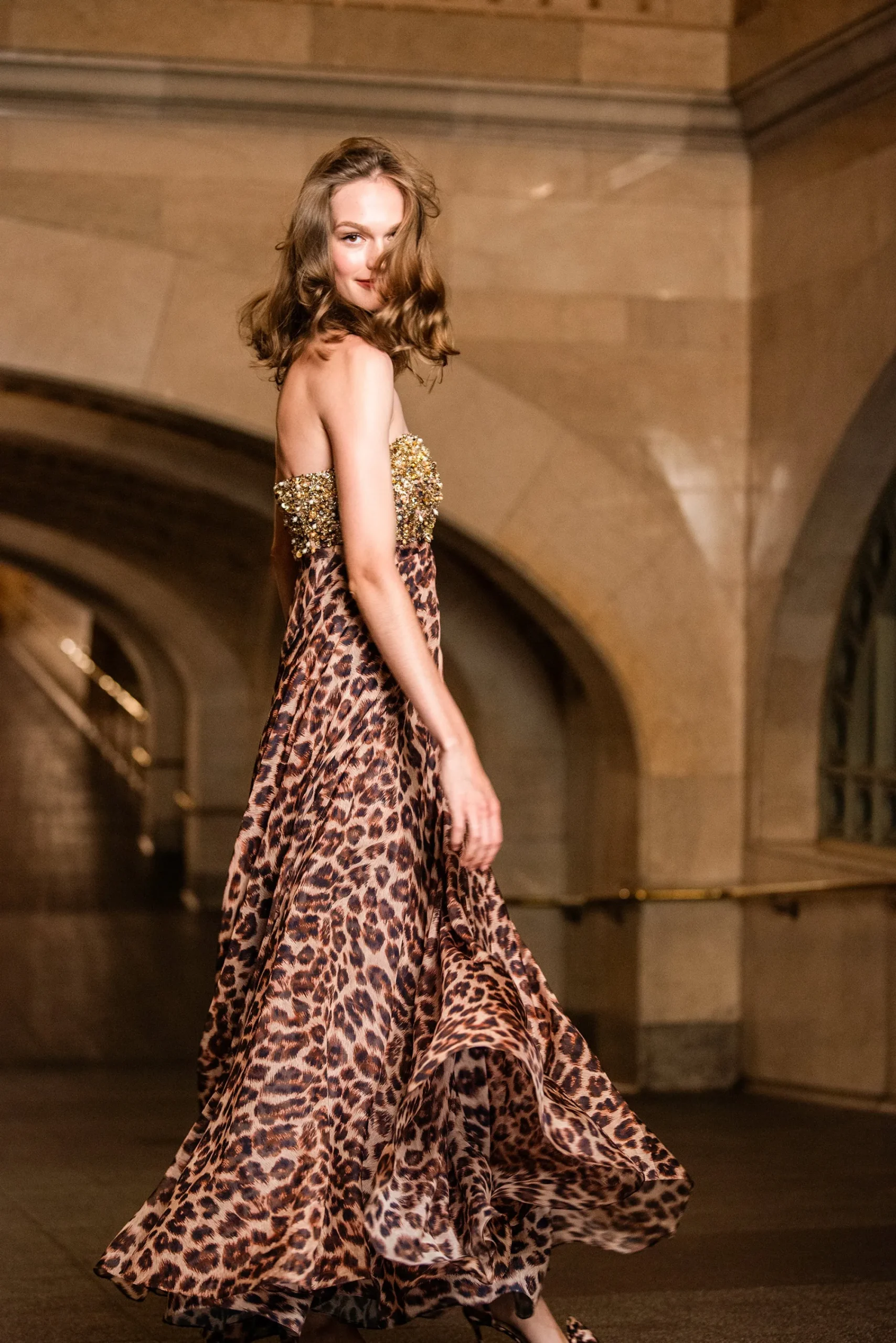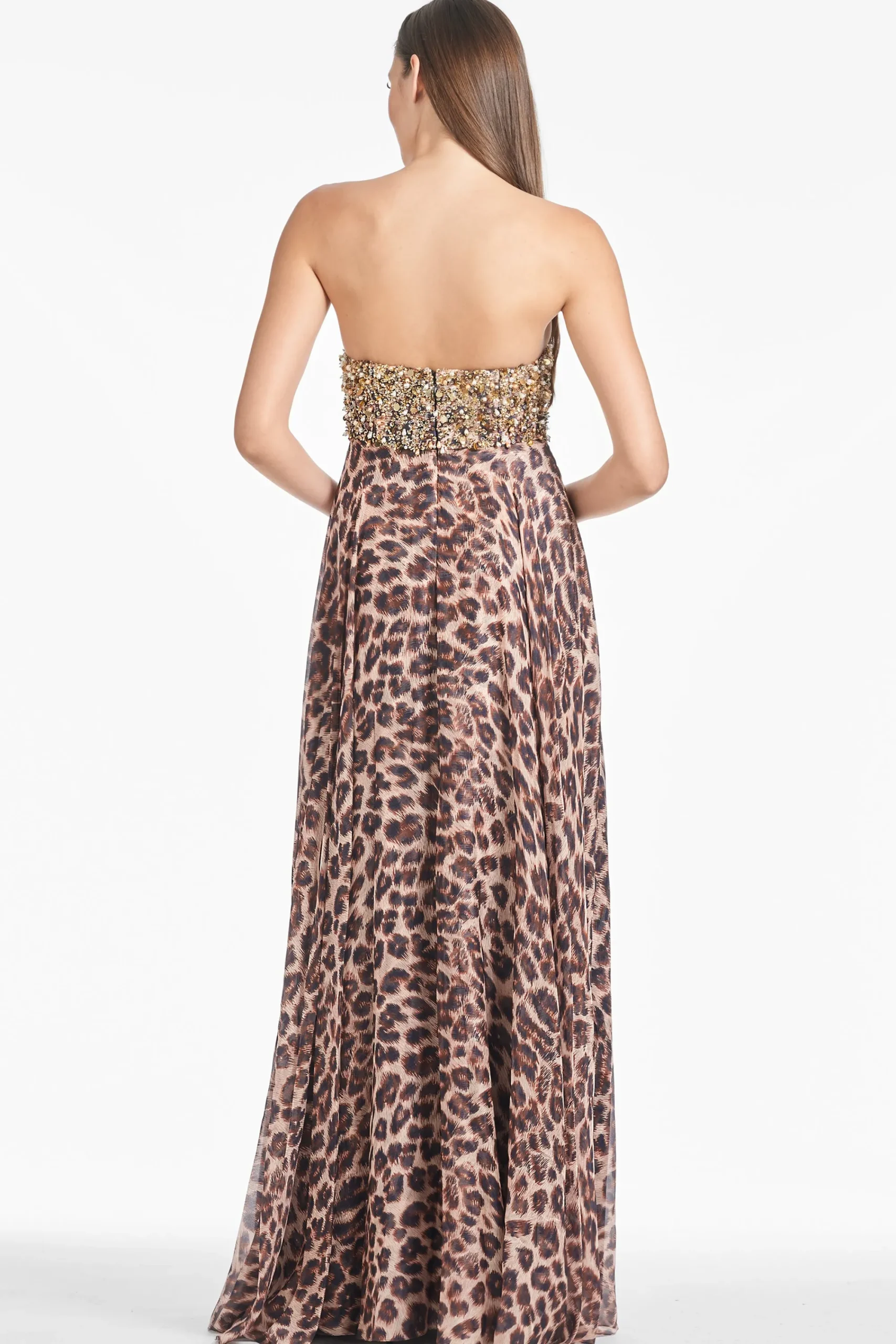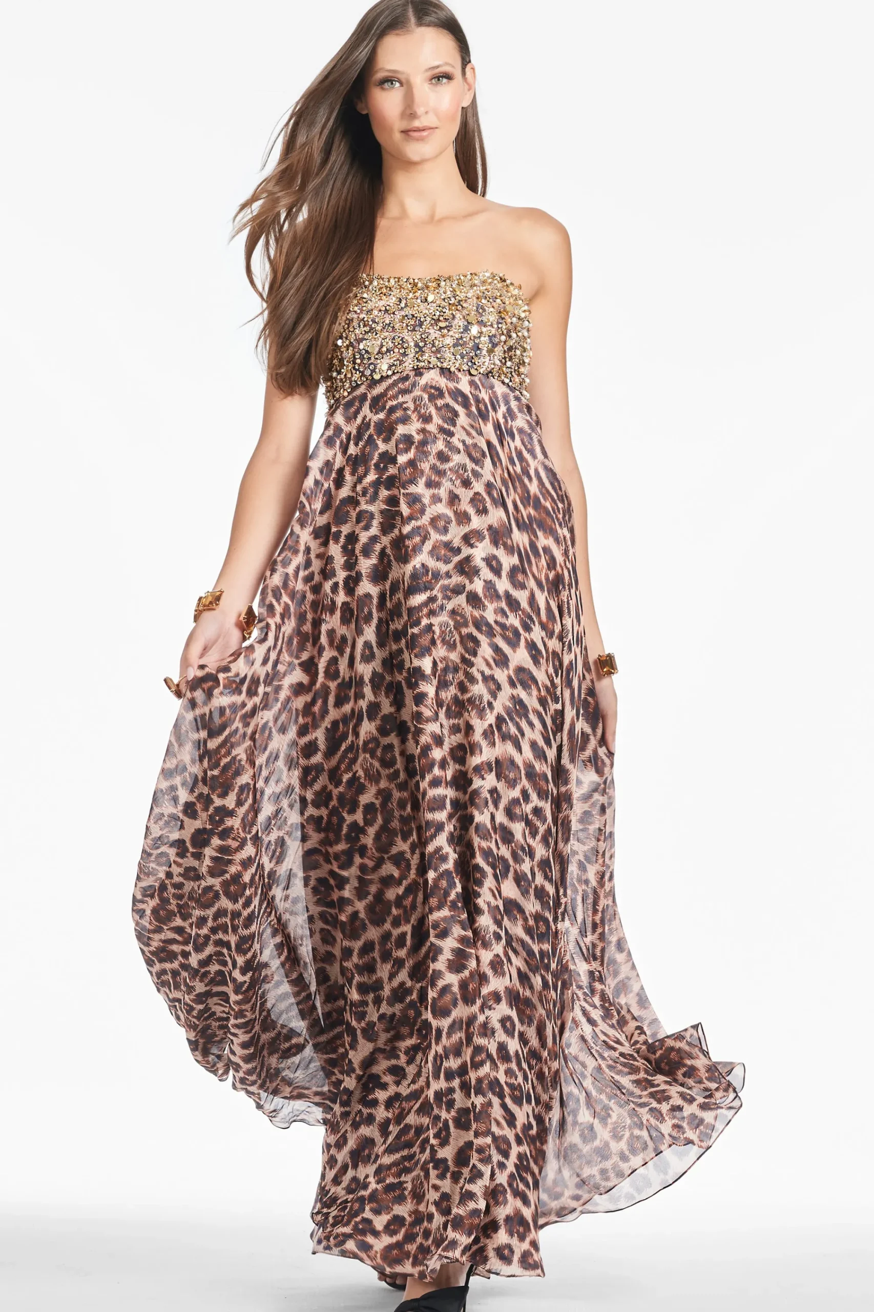 It’s obvious upon first look: Ames is FIERCE. Where to start with this one? She’s a full-length, strapless gown in our all-over leopard print. The bodice features gleaming gold embellishment that catches the light in all the right ways, while the big cat print cascades down in the most elegant, ethereal way. Prepare to turn heads with this statement piece.