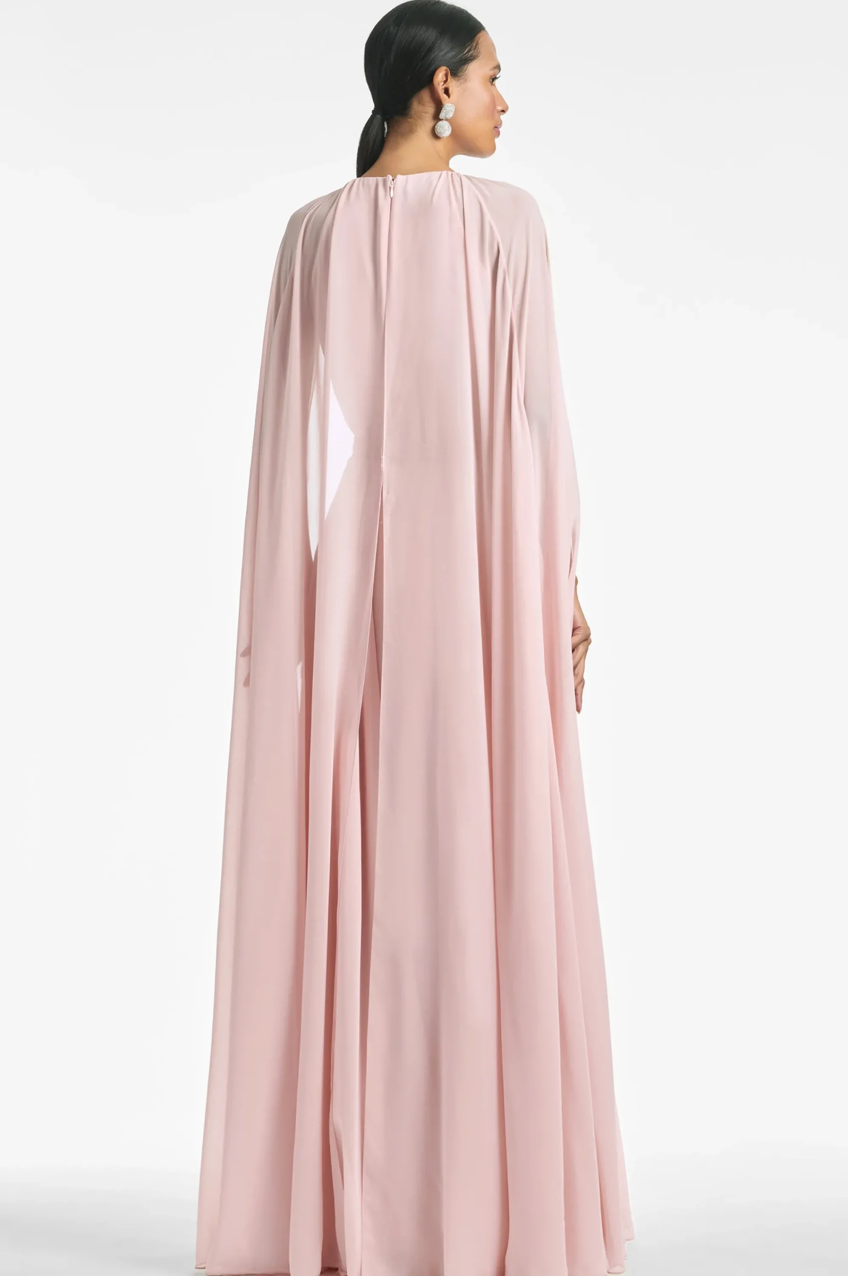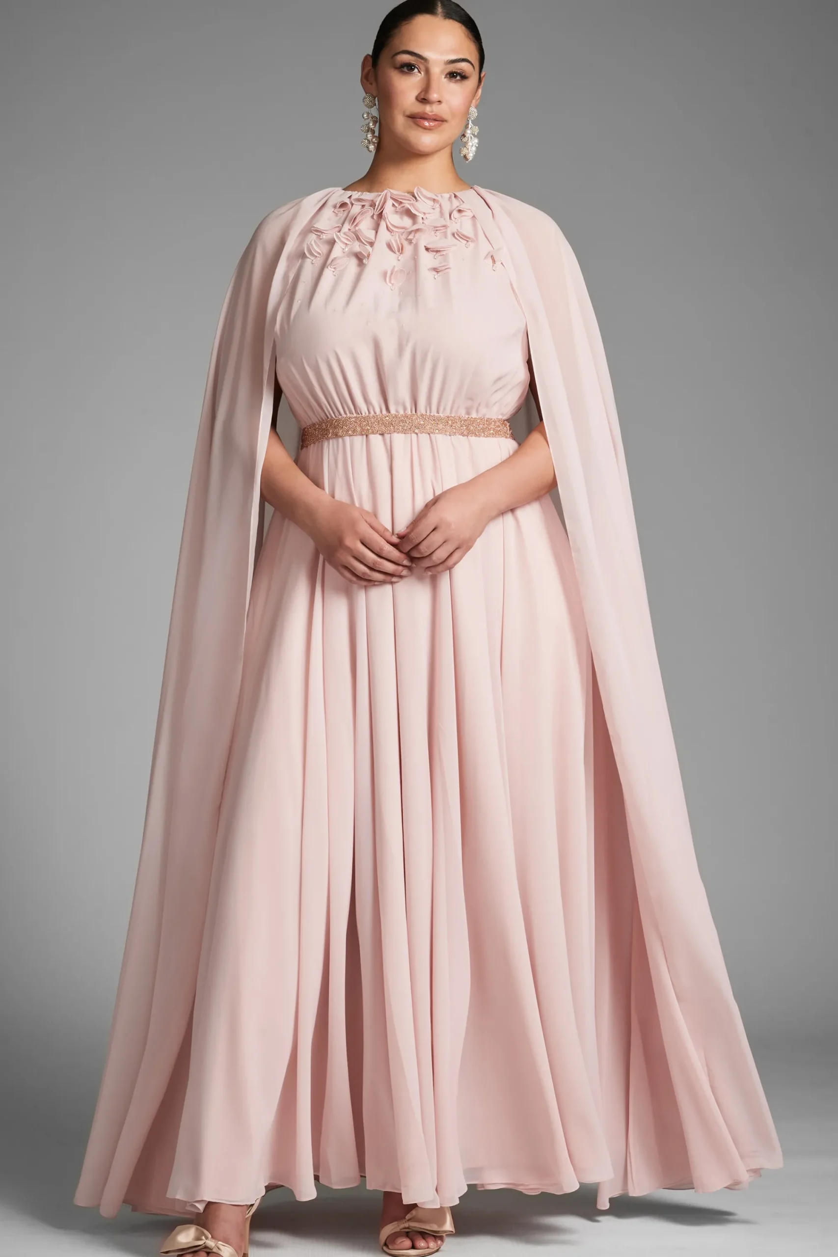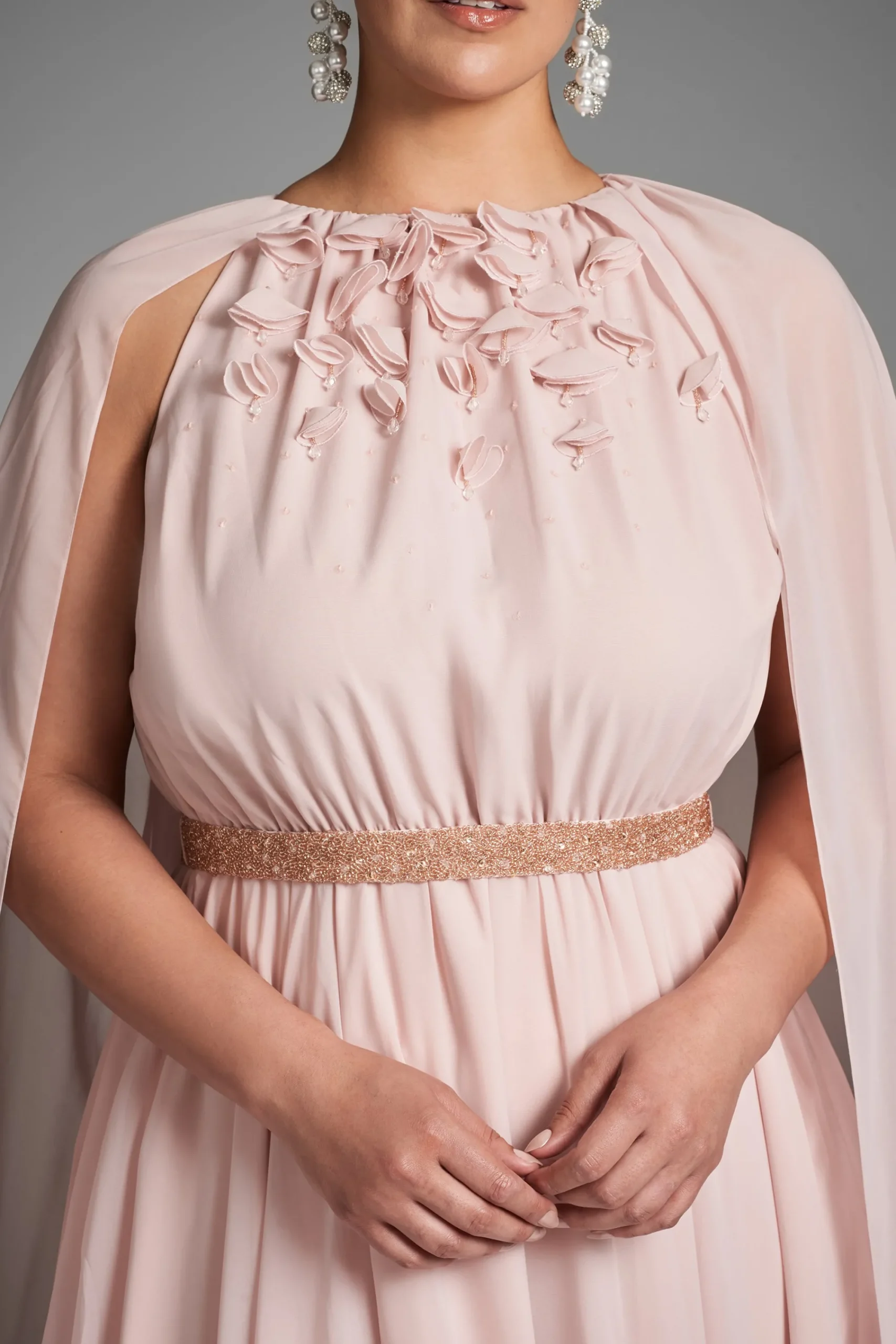 Layers of peachy petal pink chiffon make this gown diaphanous, made to look as though it is floating. An attached single layer of chiffon creates a full slit sleeve cape covering the shoulder and adding drama. At the front hand made 3D embroidering and a beaded slim belt. This gown was made to make a statement of sheer elegance.