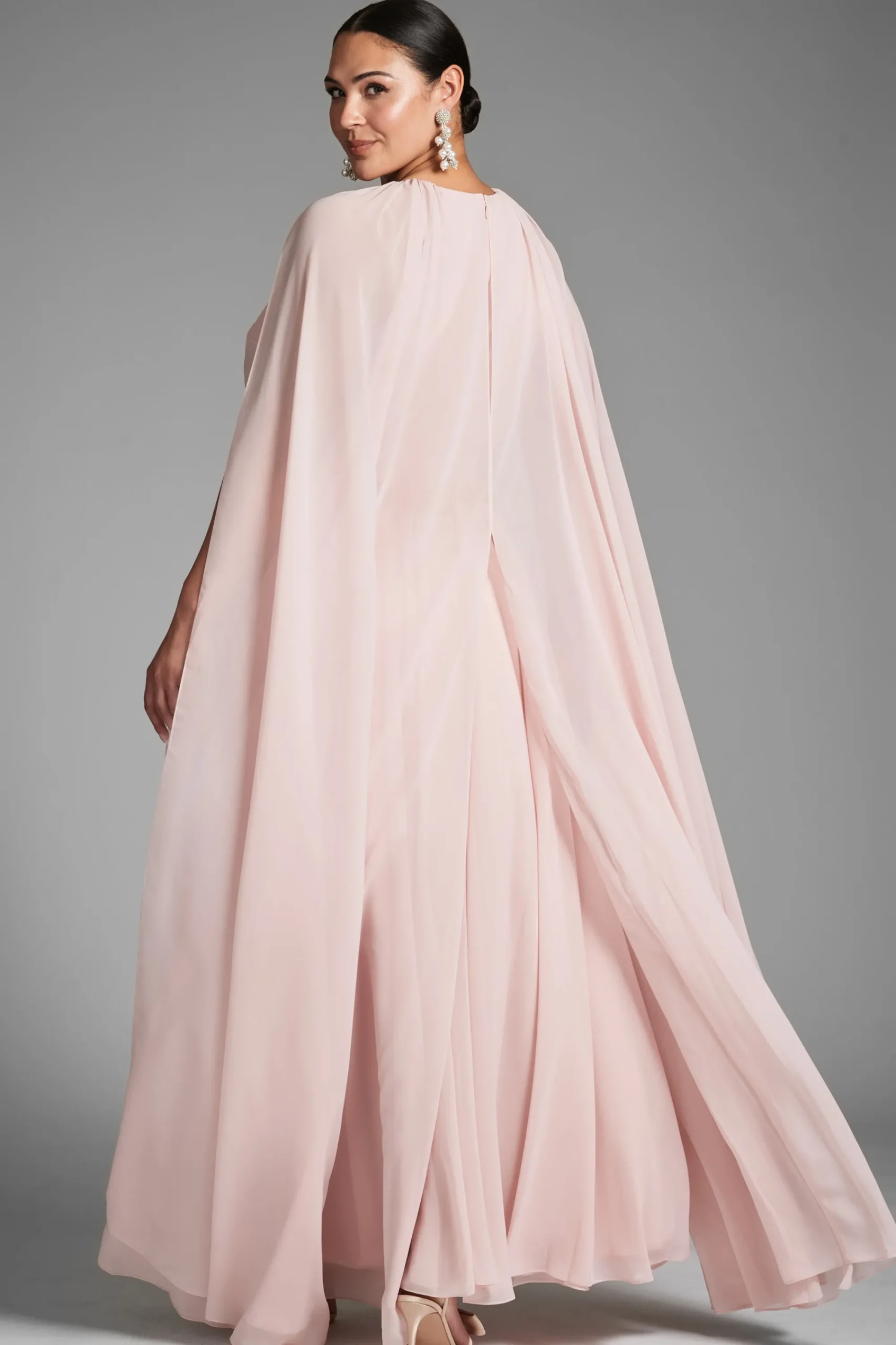 Online ExclusiveLayers of peachy petal pink chiffon make this gown diaphanous, made to look as though it is floating. An…