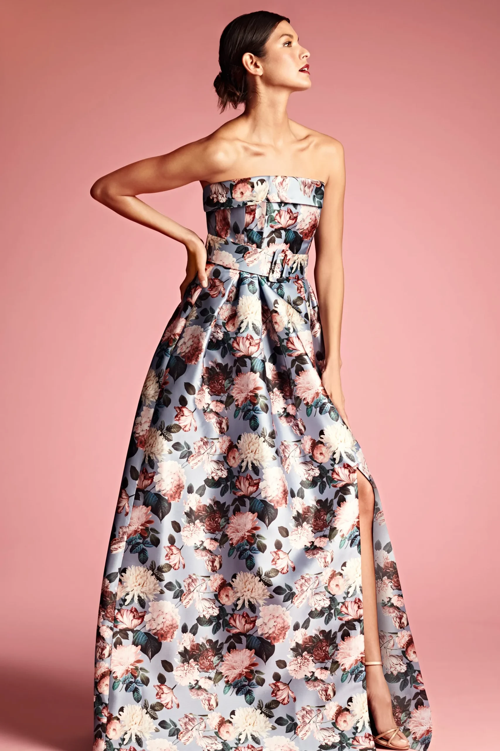 The Brielle gown is a vision in our uniquely romantic garden floral print. The otherwise classic strapless silhouette ha…