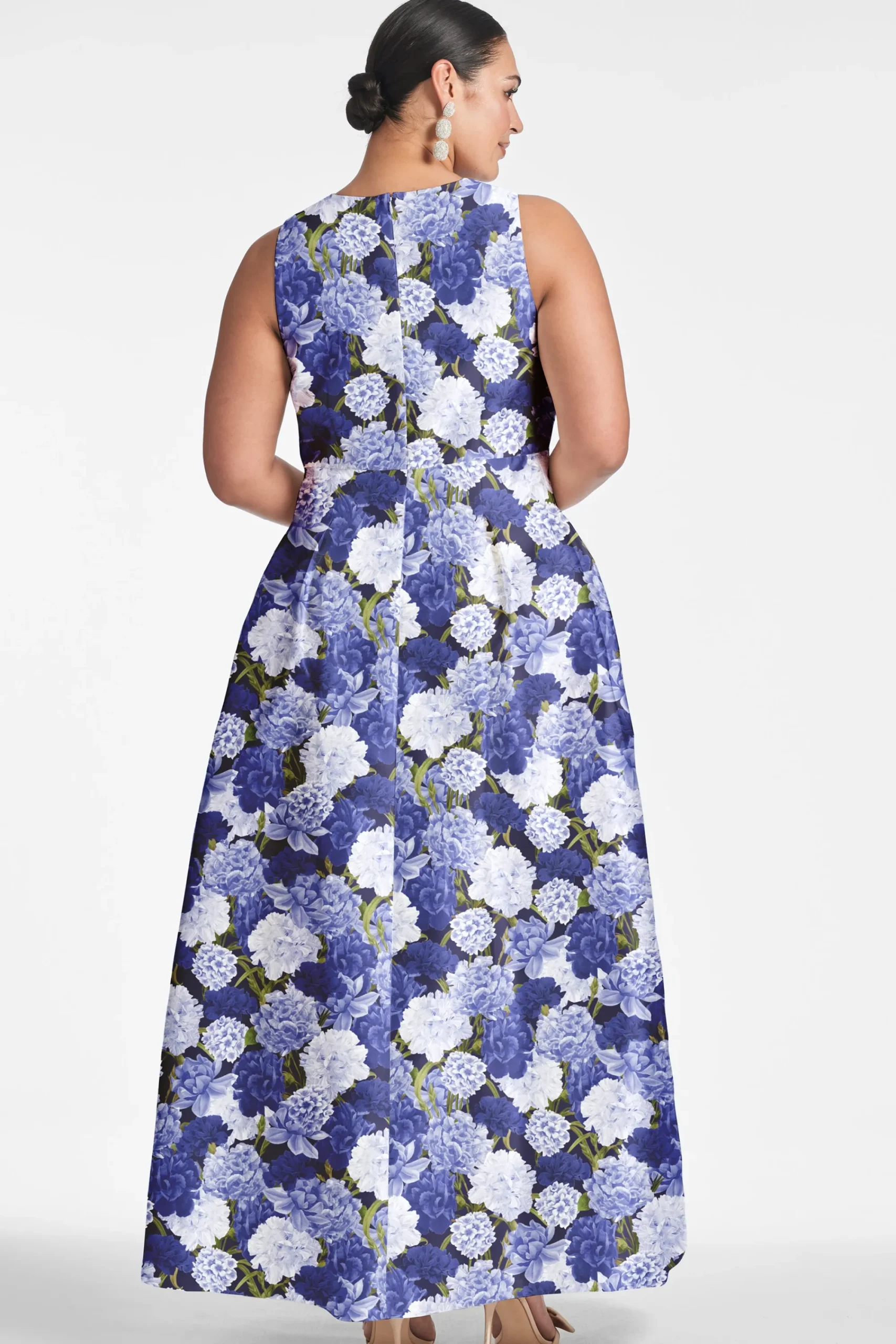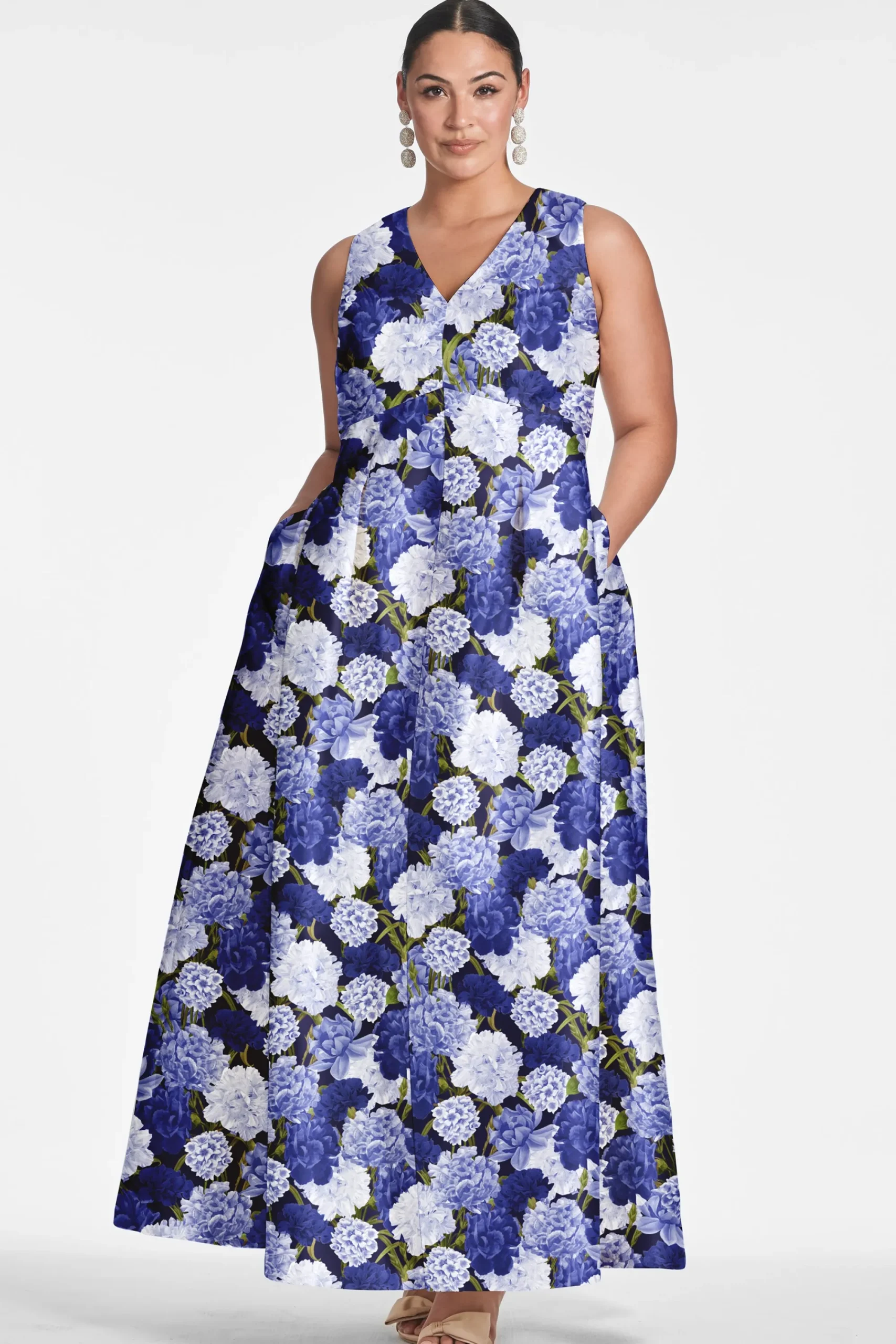 The Brooke is our V-neck gown with box pleats, peaked waist seam, and side pockets. This dress is what we consider to be a classic, essential silhouette, a perfect canvas for our most breathtaking prints.
