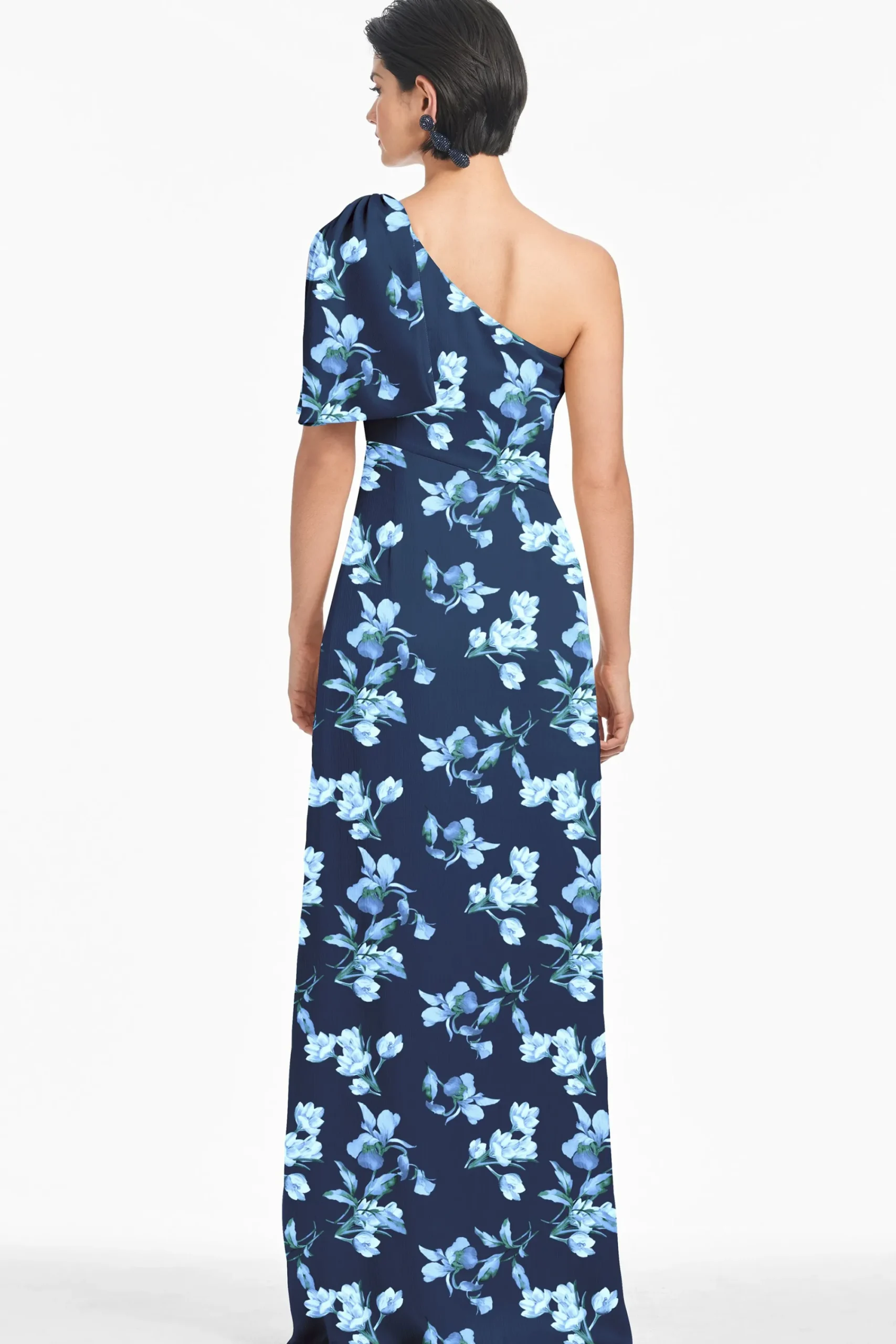 The Chelsea gown is an example of balance by design. A sleek sleeve of crinkle georgette is cut on the bias with an asym…