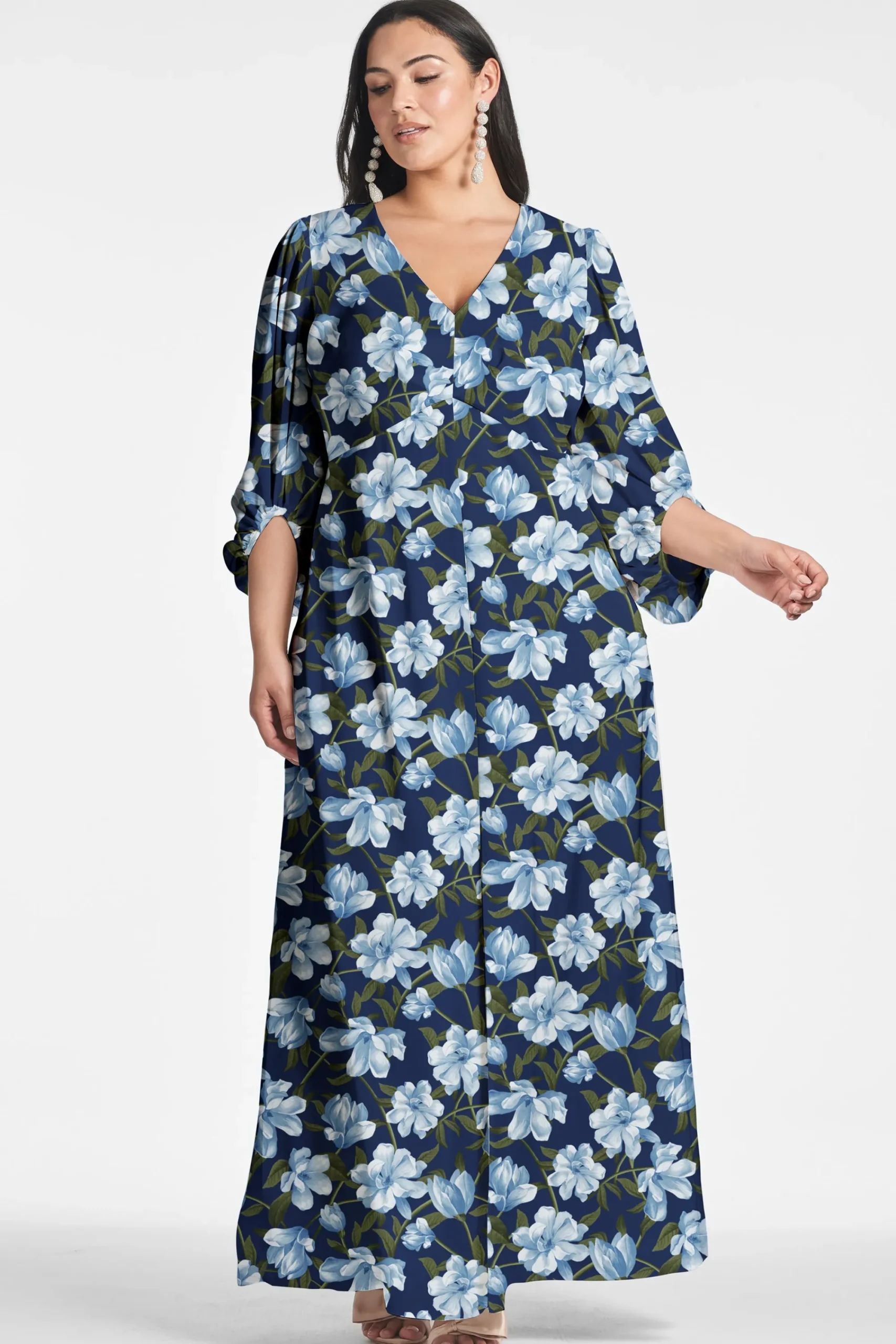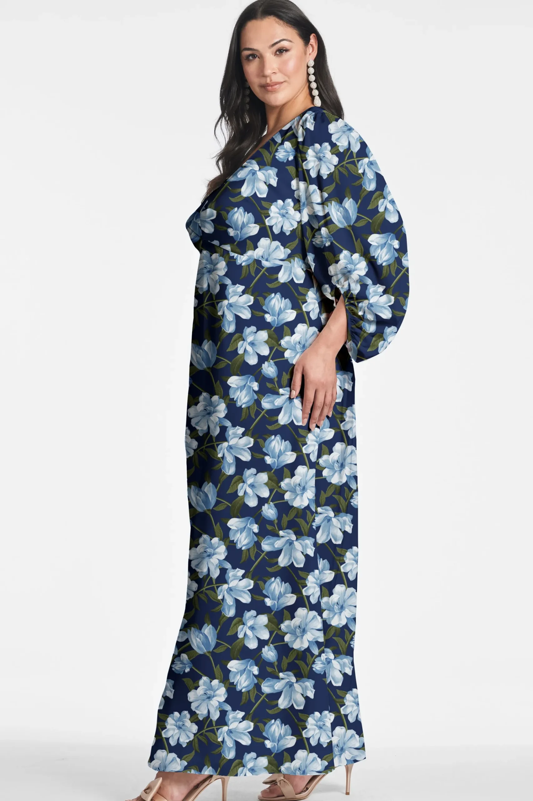 Jenny in Ocean Blue Magnolia is a gown that knows who she is: elegant, understated, and sophisticated. Featured in poly chiffon, the empire waist falls to a perfect A-line while the collapsed crescent sleeves add a subtle yet unique element to the gown’s overall design.
