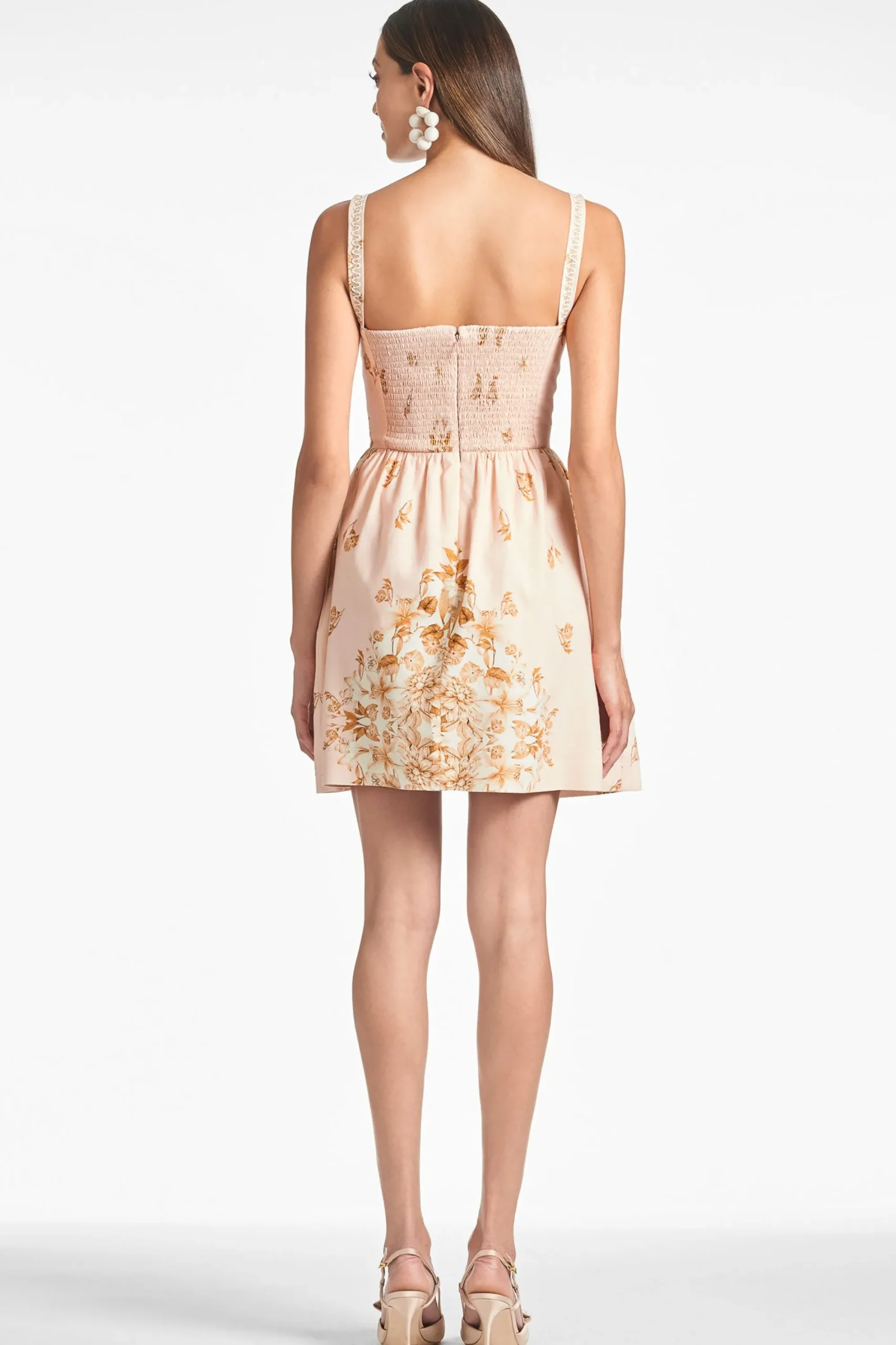 Our mini fit-and-flare silhouette takes on printed linen viscose for the ultimate warm-weather look. The pattern is ethereal and feminine, tying together gold botanicals with the prettiest pale pink. From day to night, casual to dressy, this is a piece you can wear all summer long.