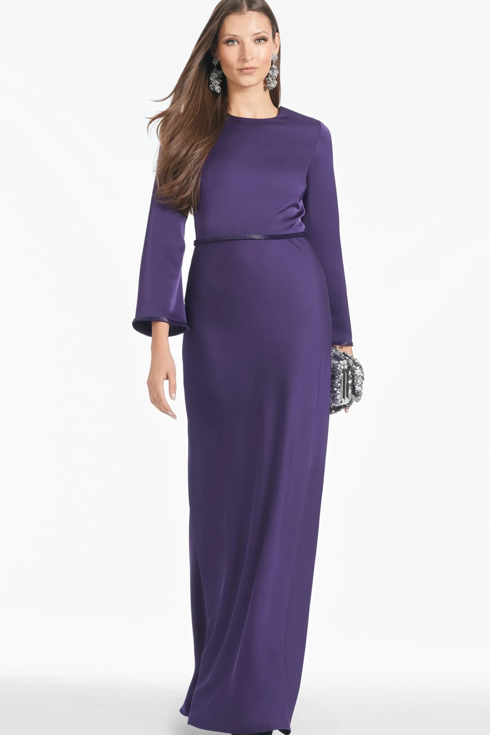 Alex is a gown who knows who she is: elegant, timeless, and chic. This long-sleeve, satin crepe dress is in a rich Amethyst with hand beading at the waist and cuff for a subtle glamour that will allow this dress to remain relevant for many years to come.