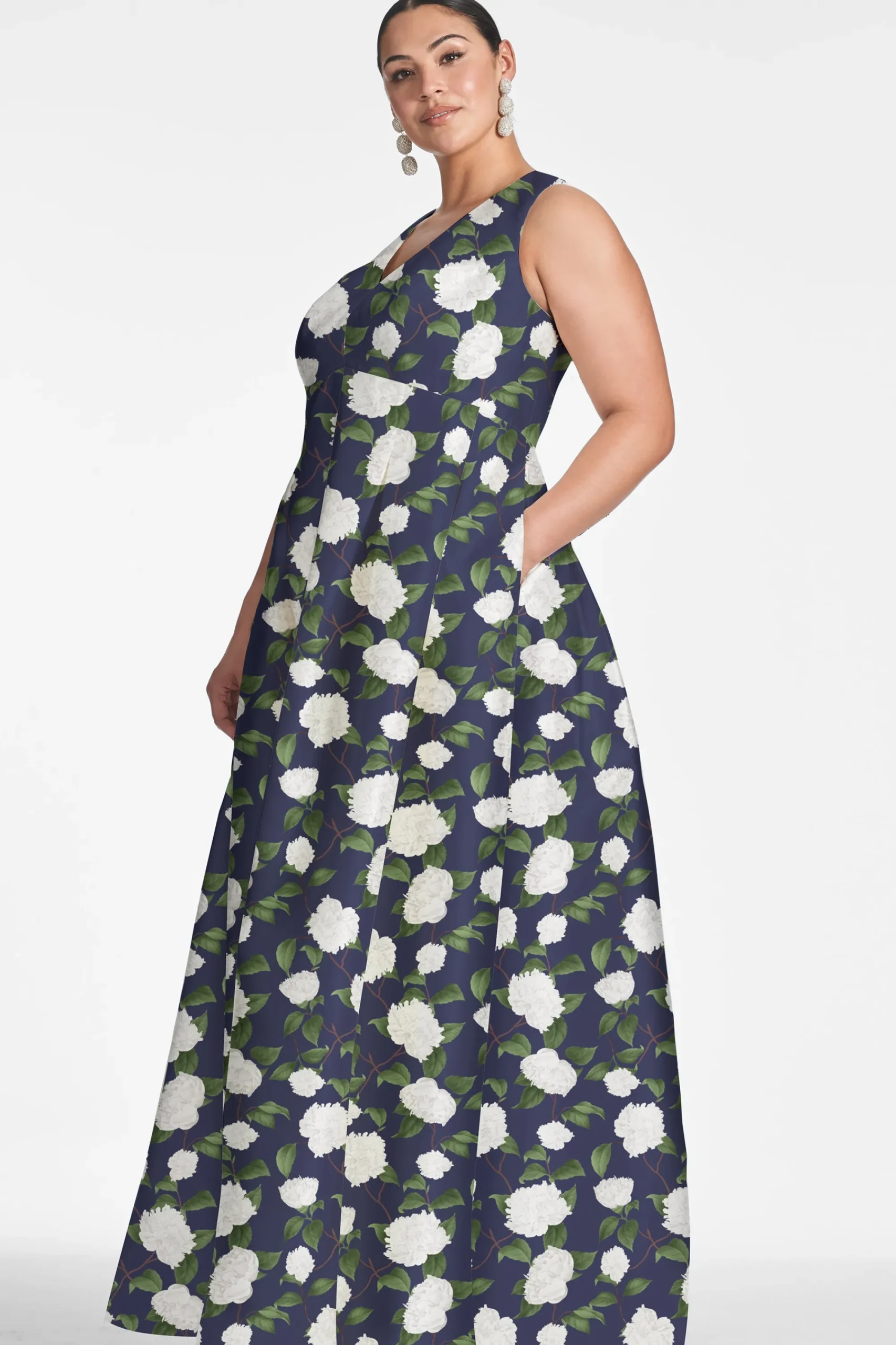The Brooke is our V-neck gown with box pleats, peaked waist seam, and side pockets. This dress is what we consider to be a classic, essential silhouette, a perfect canvas for our most breathtaking prints. This one is featured in Navy Moonlit Garden, our peony print with gorgeous touches of green and ivory.