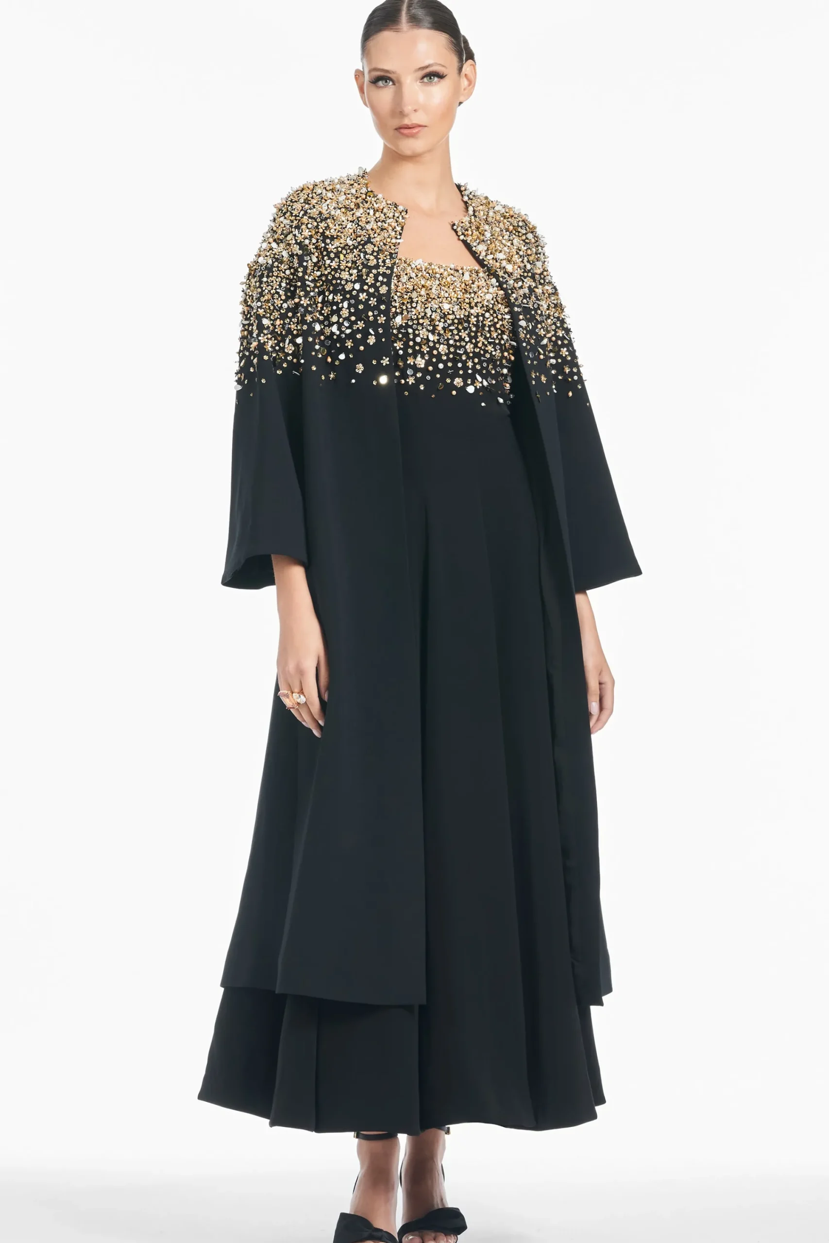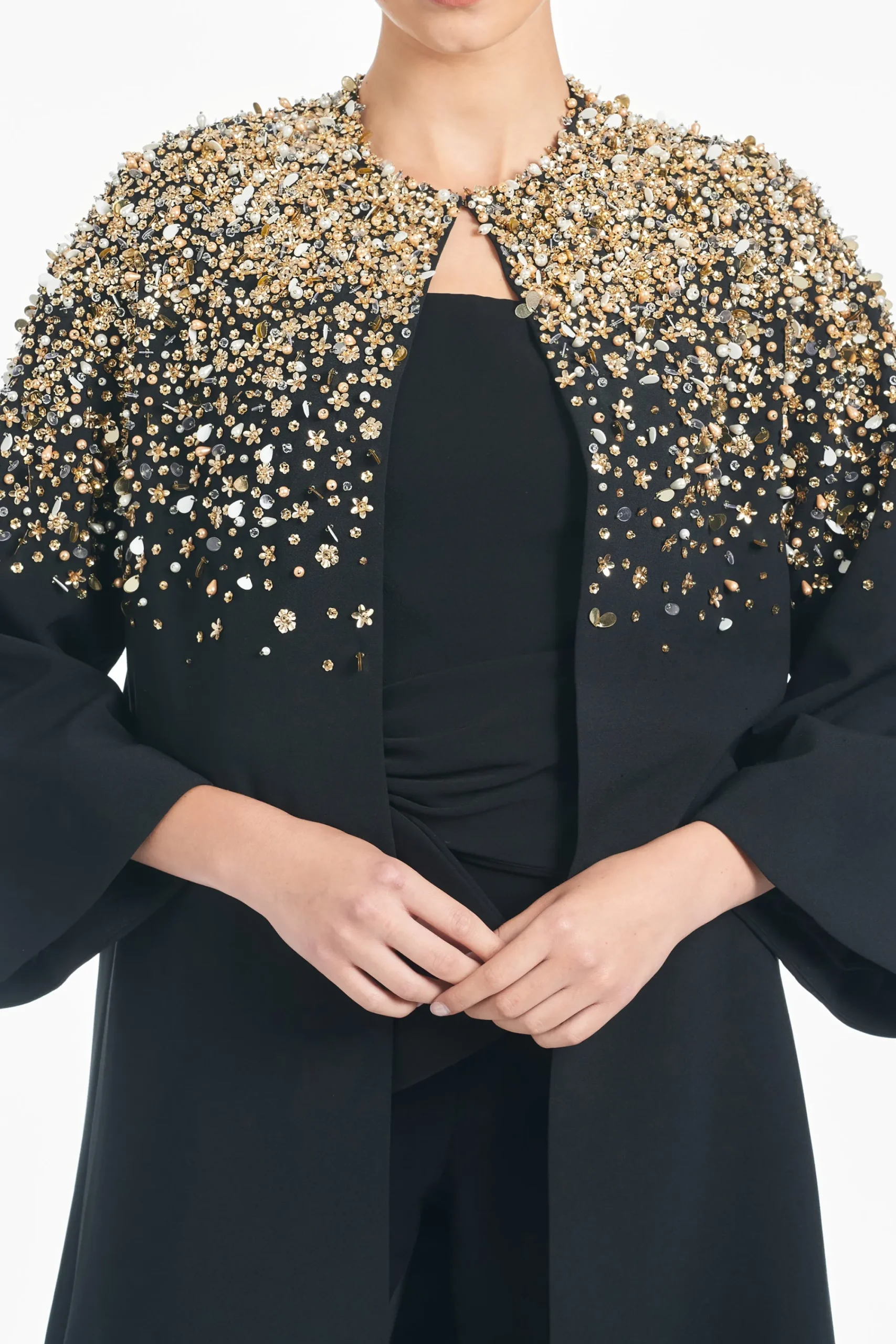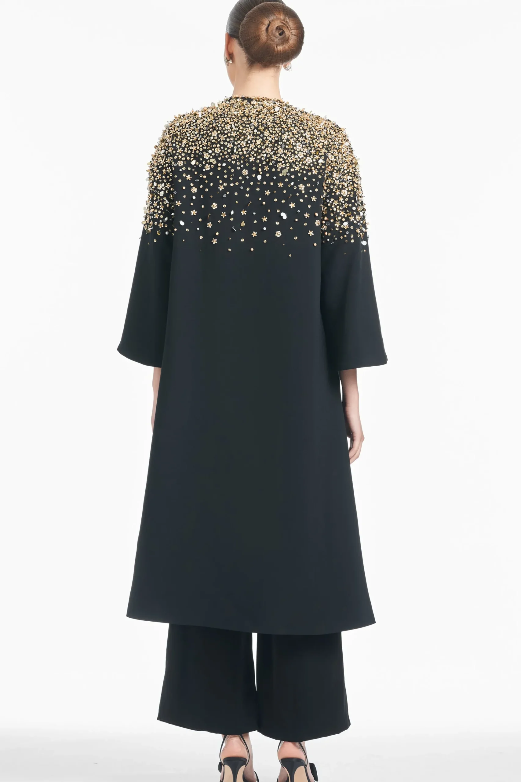 Timeless and dramatic, the Prima Coat is a grande addition to any wardrobe. The seasonless crepe fabric gives it a luxurious look with a relaxed, intentionally easy fit. Hand placed gold and pearl embellishment blanket the neckline catching the light in all the right ways. This is not for the faint-fashioned hearted; this is for all of our bold glamour girls!