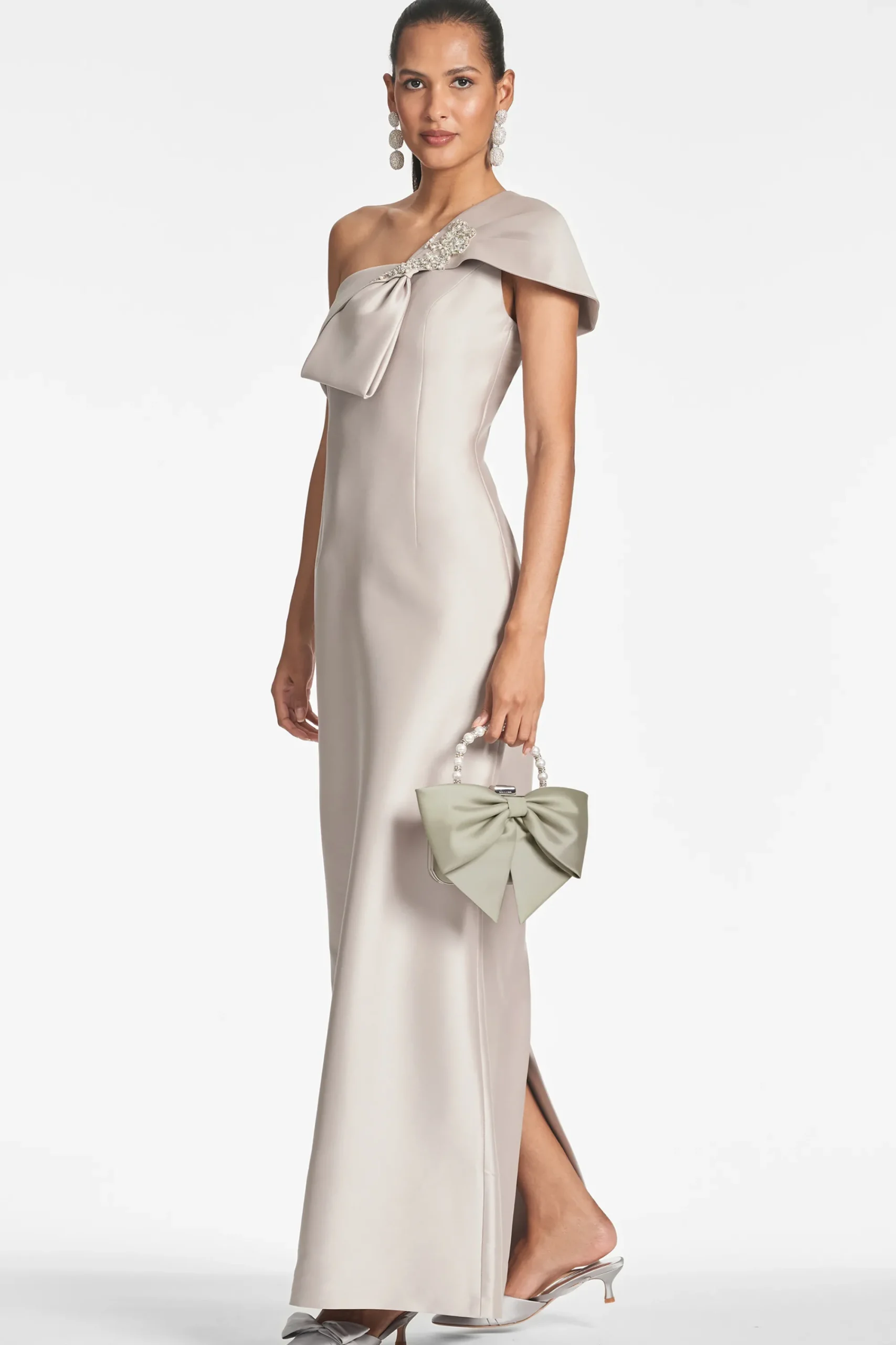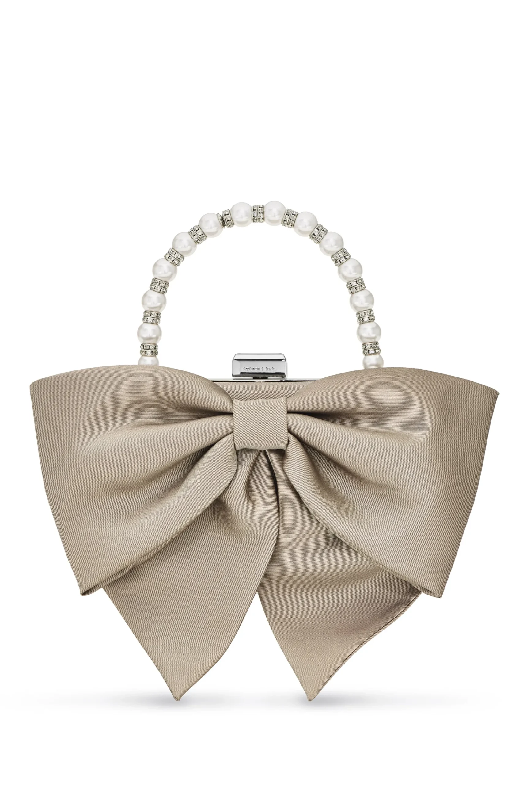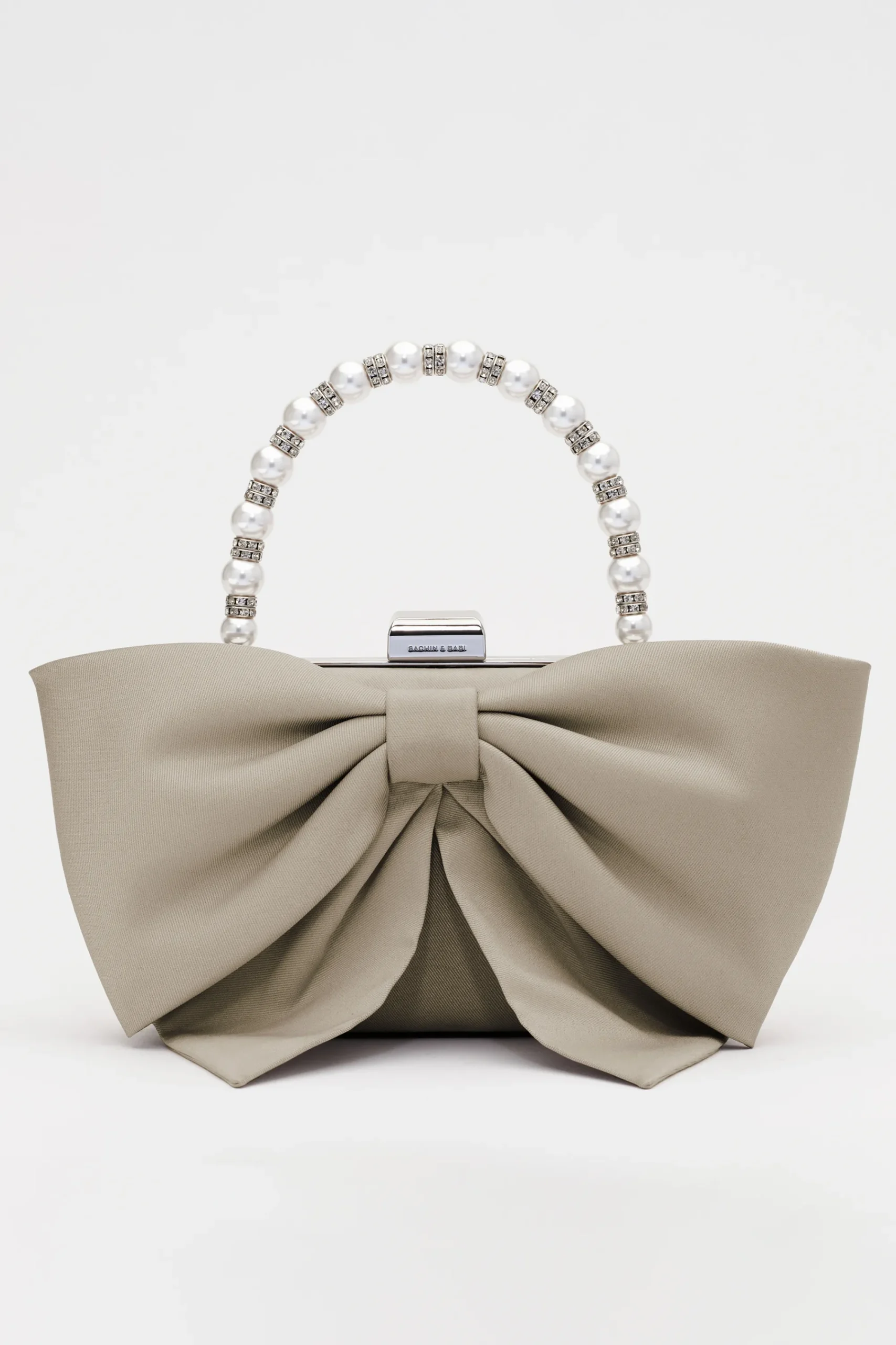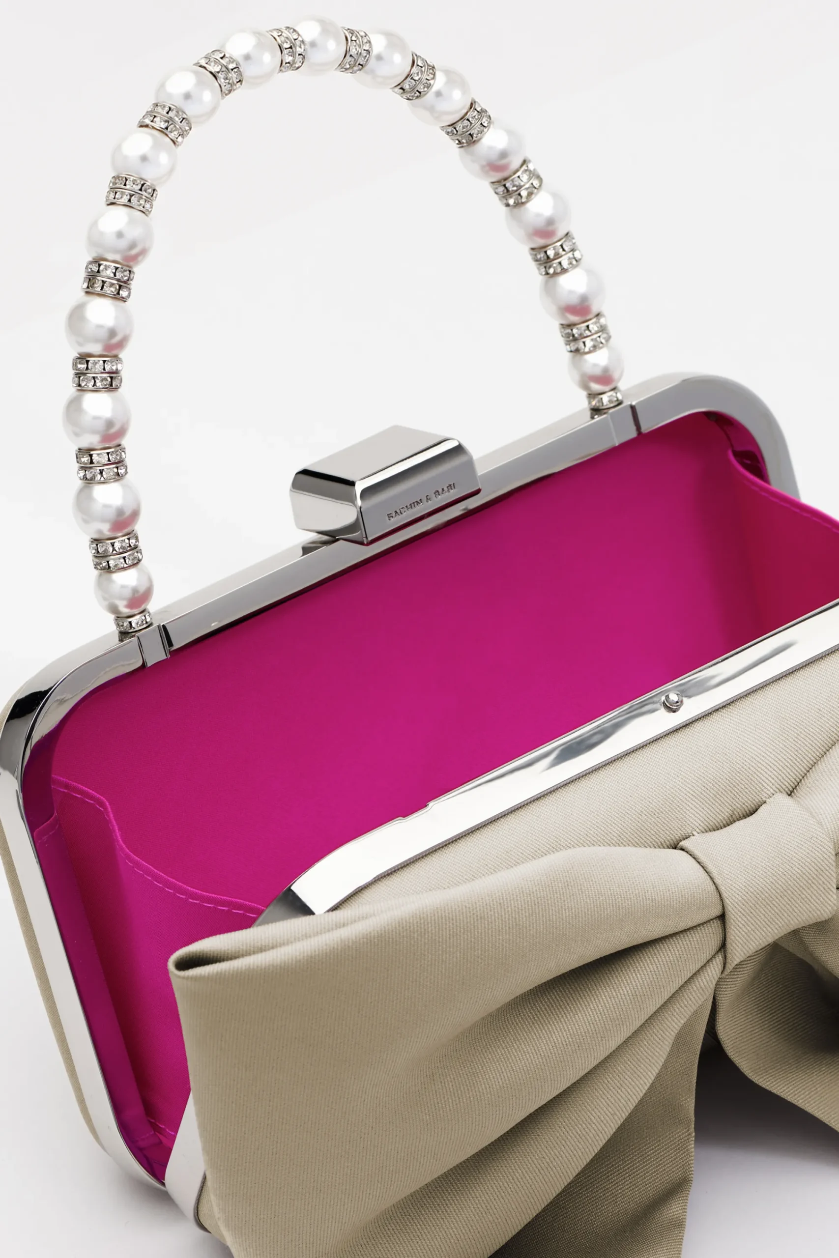 Introducing the Bubbly Bag, inspired by exactly what you would imagine. This fully-framed evening bag features a silver tone finish and an interior pocket. Its rich Mikado fabrication lends itself to luxury, while the pearl and crystal embellished top handle speaks to its timeless sophistication. The perfect companion to any fête.