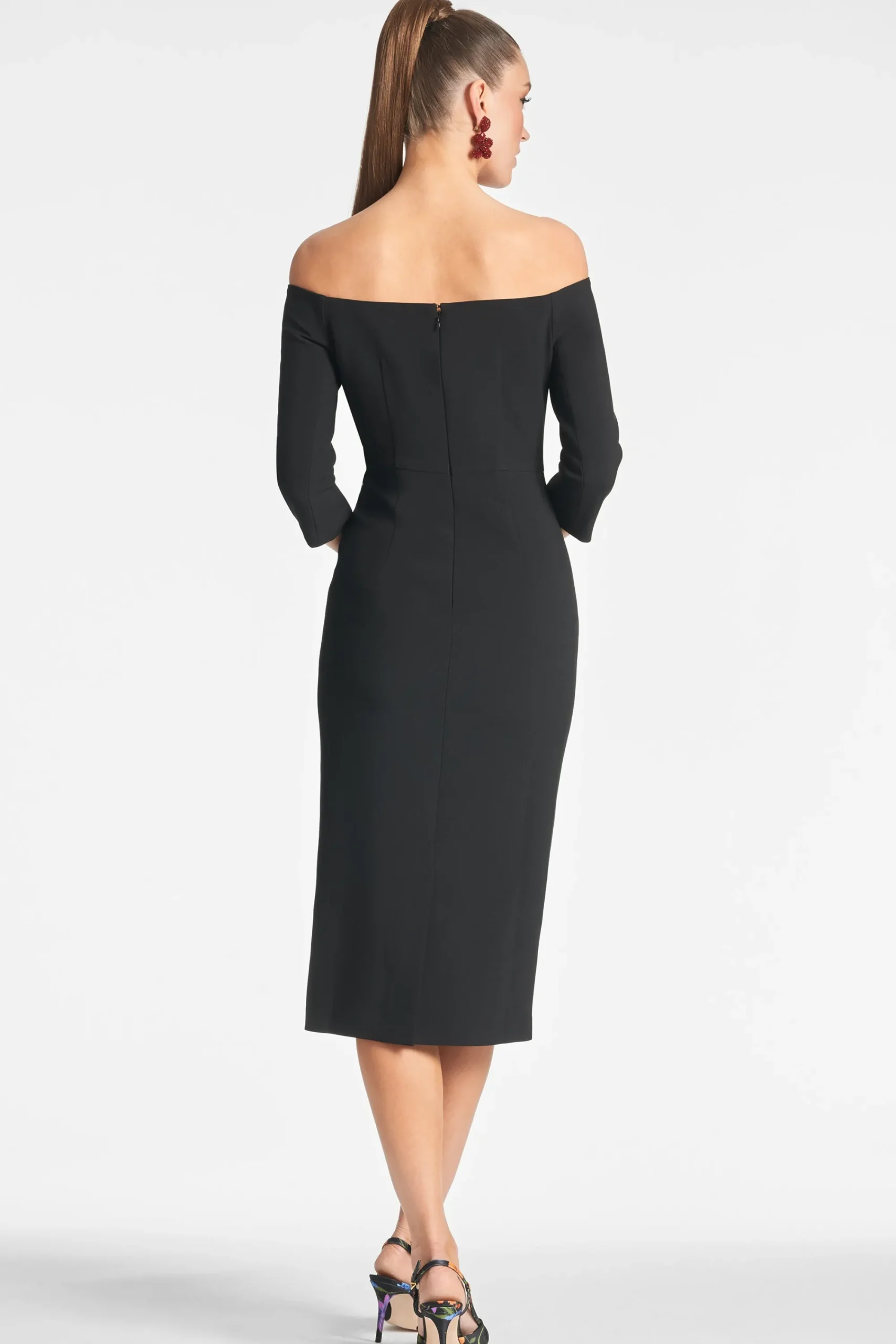 This timeless classic, the Fatima Dress, is crafted from stretch crepe black fabric, boasting an elegant off-the-should…