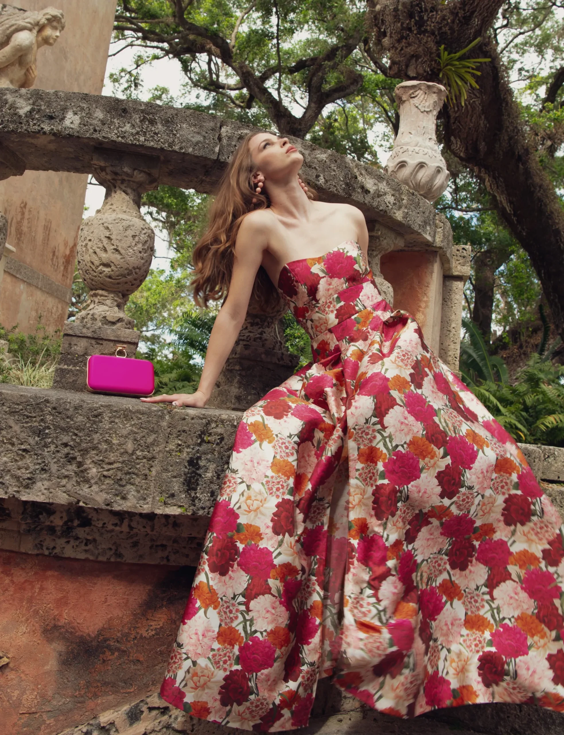 Giovanna is the ball gown that flatters in all the right places. Featured in an all-over floral print, she adds a touch of something special to an otherwise classic silhouette. Opt for natural makeup and throw on a pop of color clutch (On the Rocks in cerise, perhaps), and you have your next wedding, gala, or event look perfected.