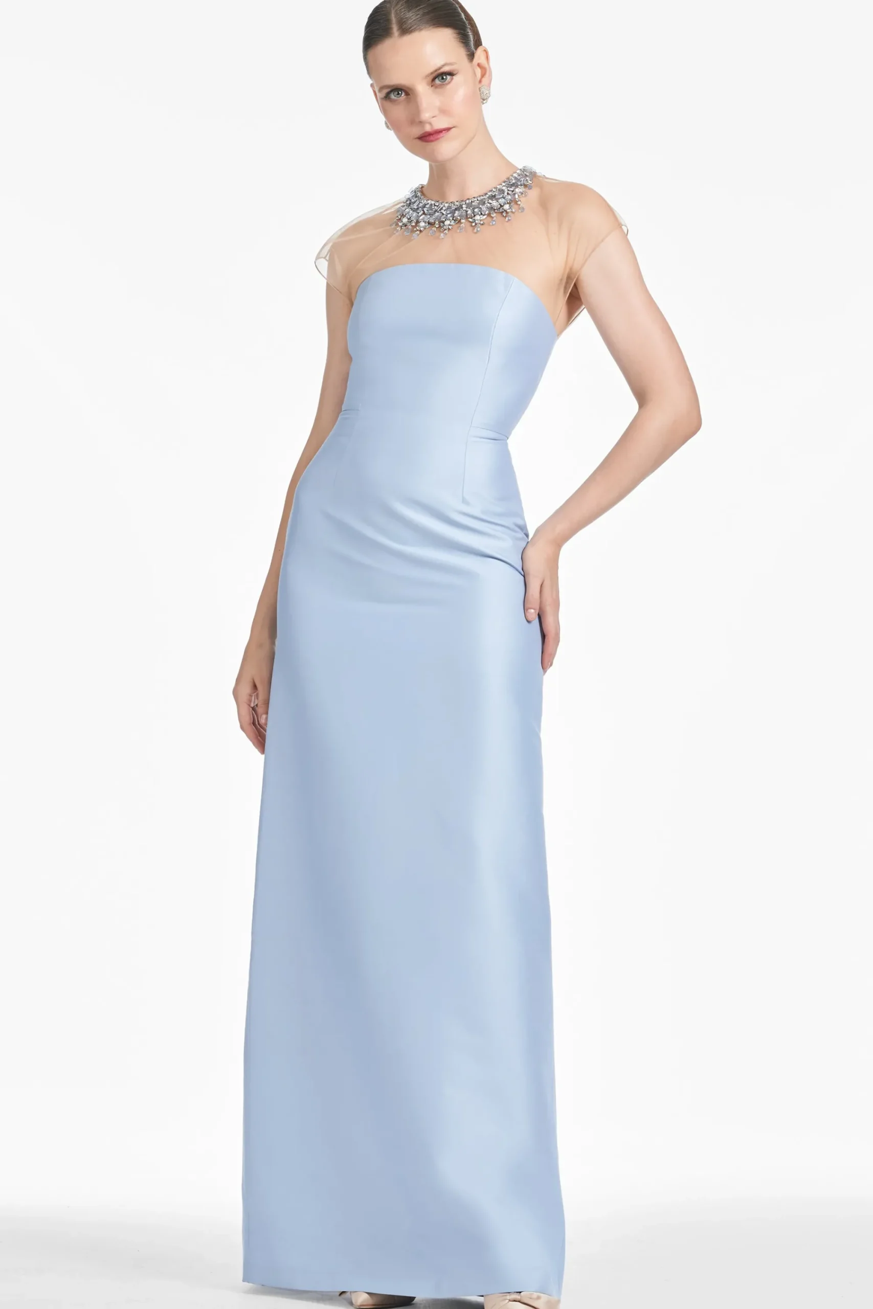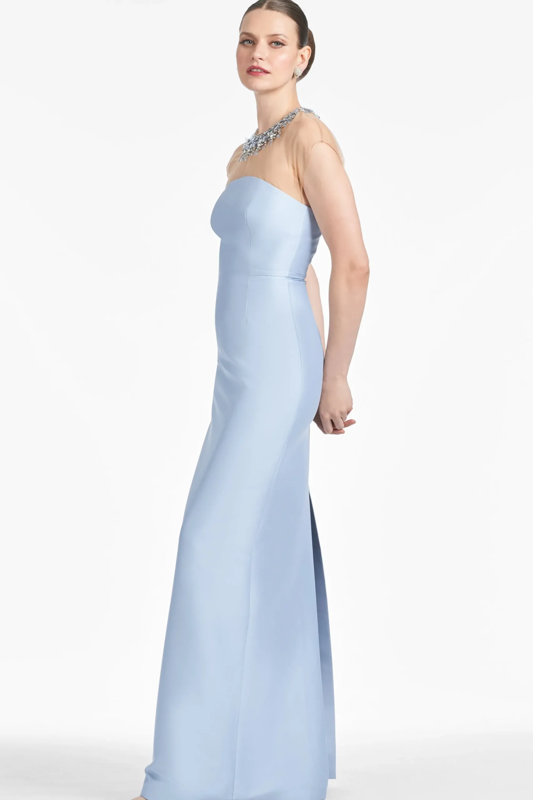 Experience timeless elegance in the Irina Gown in Glacial Blue. This exquisite gown is crafted from stretch Mikado fabric for a truly luxurious feel. A beautiful illusion neckline adorned with intricately beaded embellishments adds an air of sophistication. Showcase your style with this elegant column gown – perfect for the mother of the bride or other special occasions.