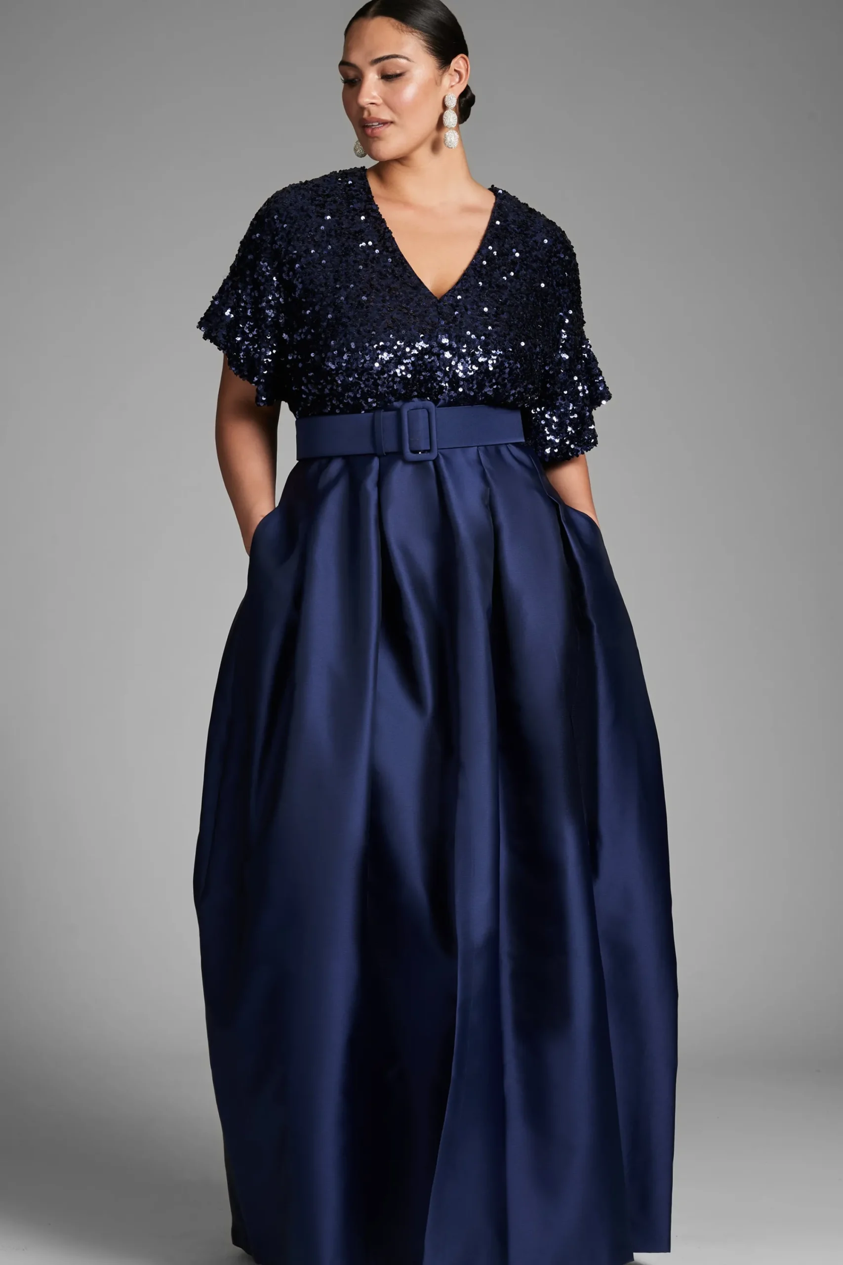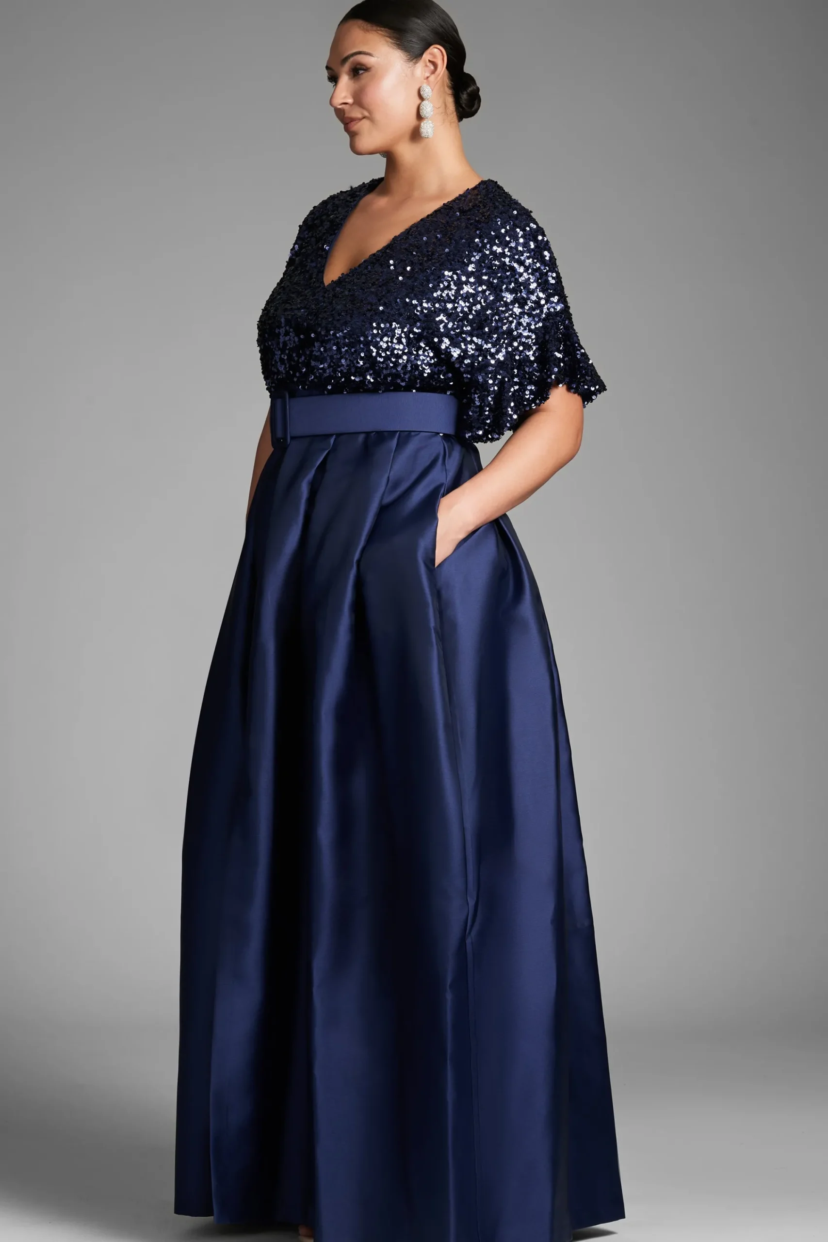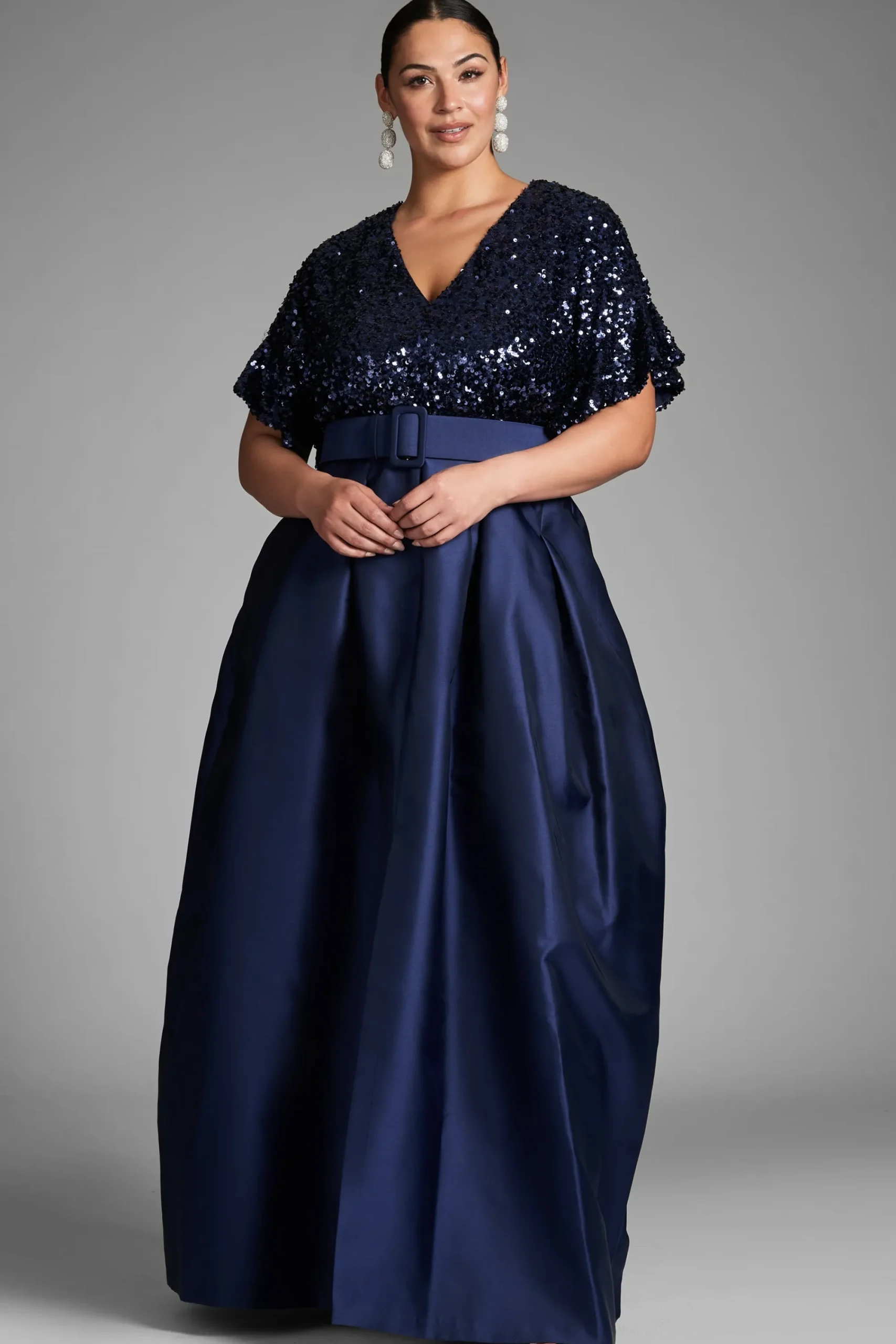 Simply put, the Simone gown is a vision. A classic ball skirt with box pleats in double-face Mikado is punctuated by glittering metallic stretch micro-sequins. The drop sleeve offers an easy elegance to this otherwise classic silhouette. A self-belt in night sky completes the gown.