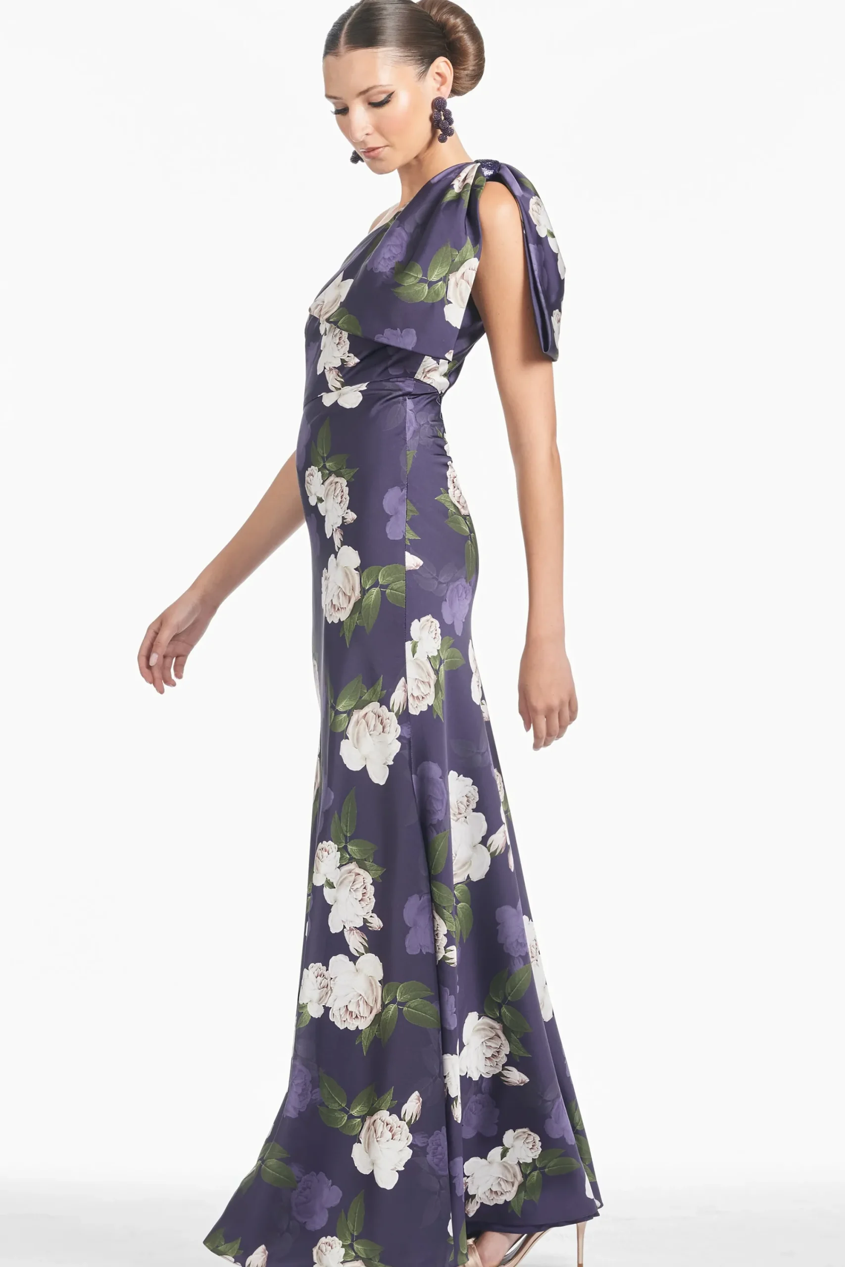 The Aubrey gown in twilight blooms is an example of balance by design. A sleek sleeve of charmeuse cut on the bias with an asymmetric seam at the waist creates a column for curves. At the shoulder sits a hand tucked collapsed bow adorned with hand-embroidered crystals at the knot.