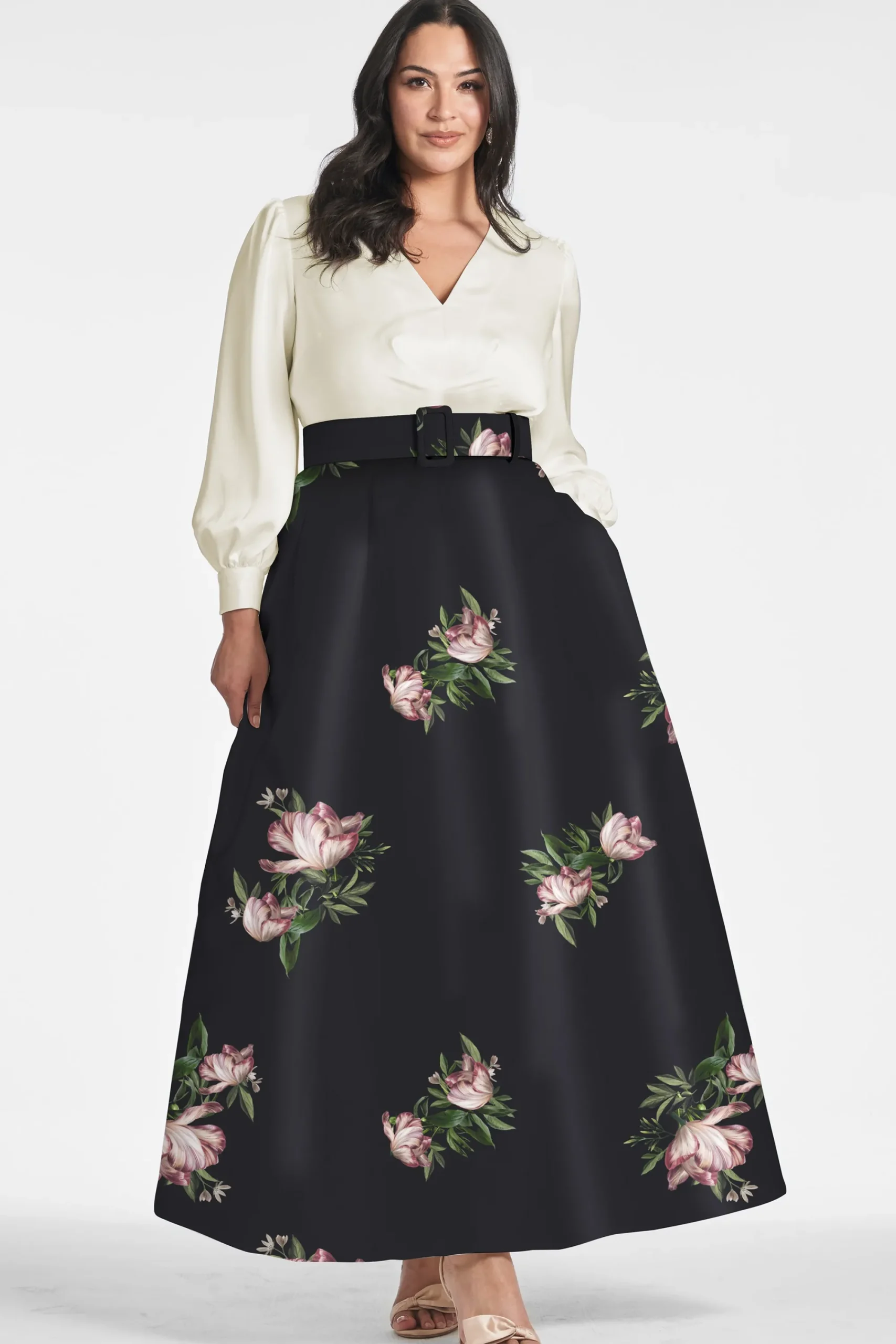 The Zoe Gown is the “Grande Dame” of the occasion. The deep V-neck slate satin crepe bodice meets the printed Mikado s…