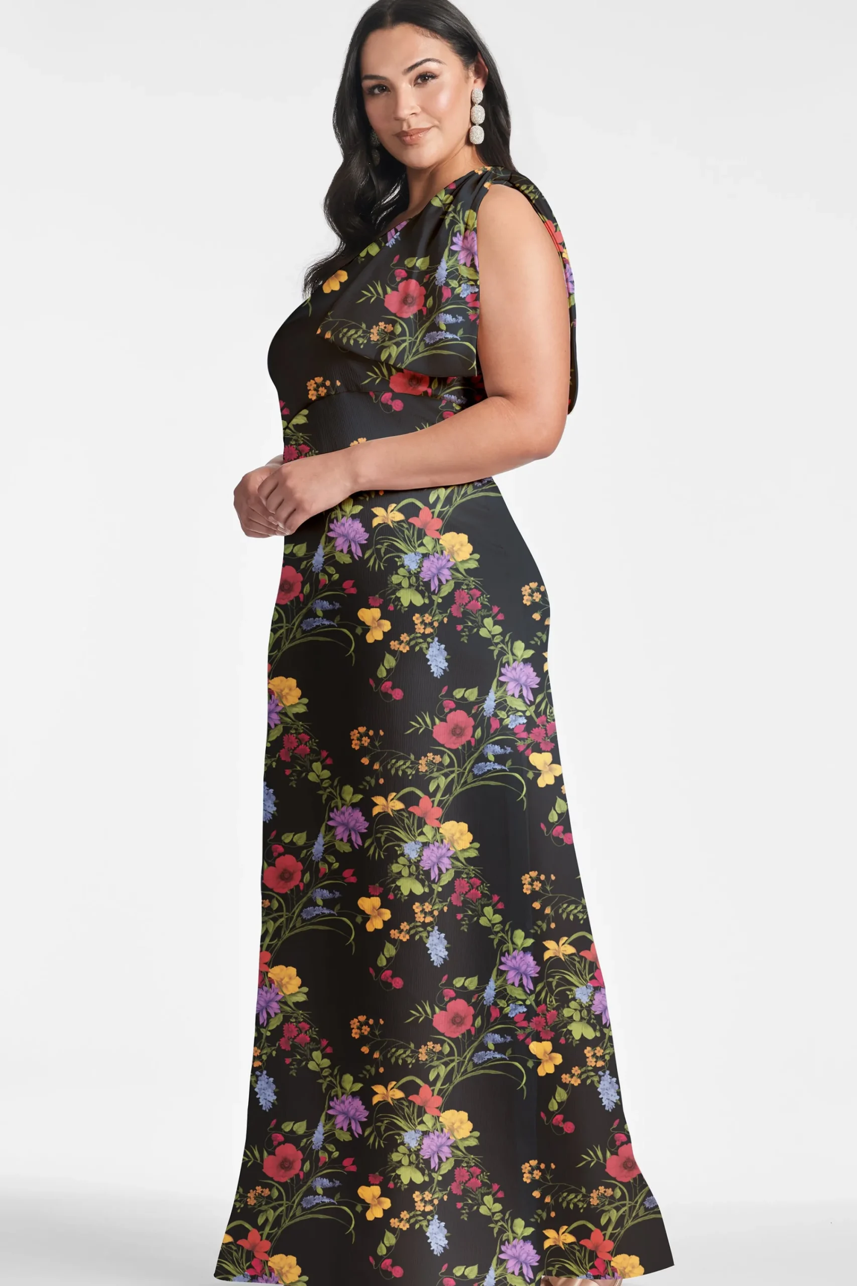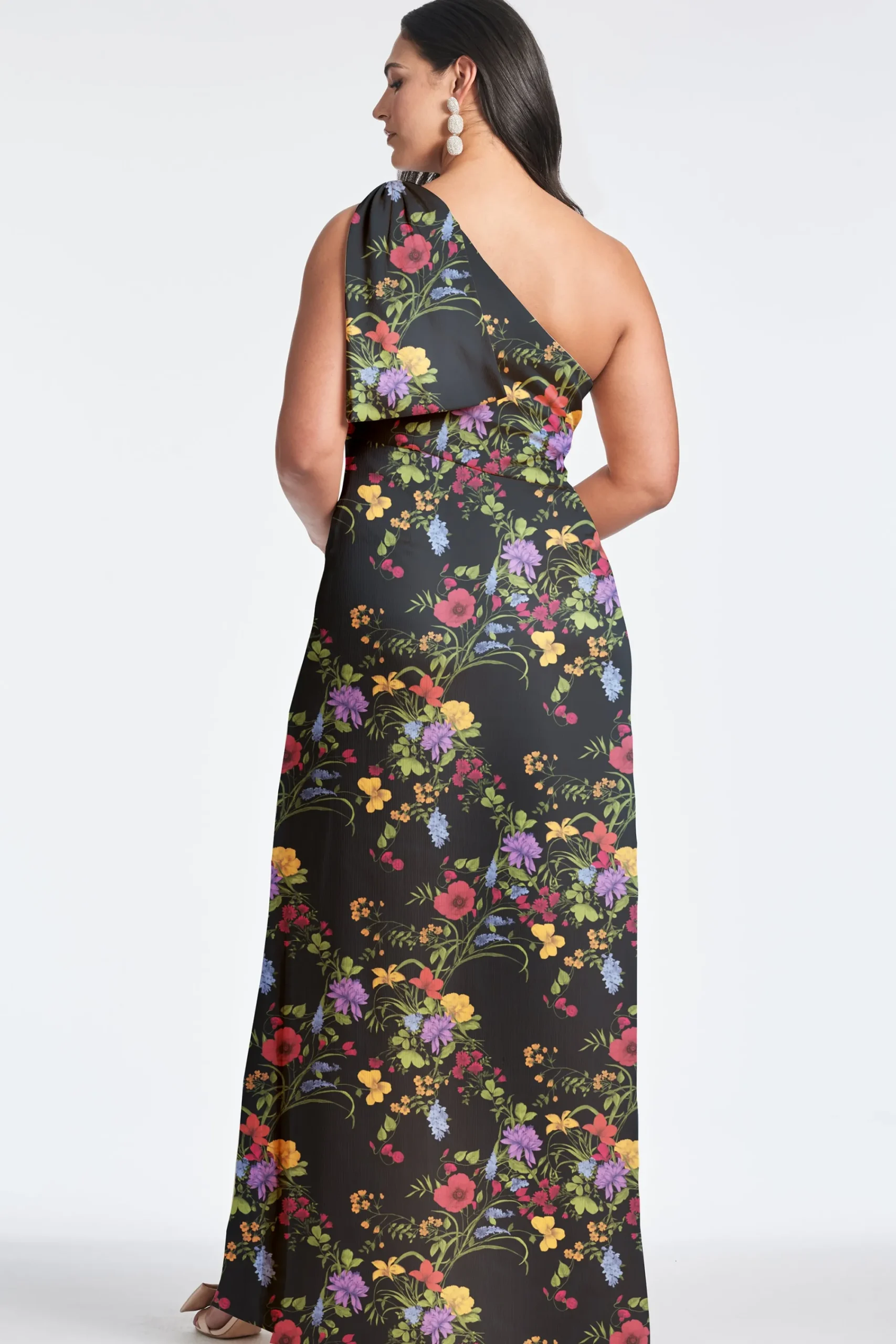The Chelsea gown in our Noir Wildflower print is an example of balance by design. A sleek sleeve of crinkle georgette is cut on the bias with an asymmetric seam at the waist, creating a column for curves. At the shoulder sits a hand-tucked, stitched-on collapsed bow. We design all of our Essential Social dresses with the intention that they can be enjoyed again and again. After all, a beautiful dress should be worn often and well.