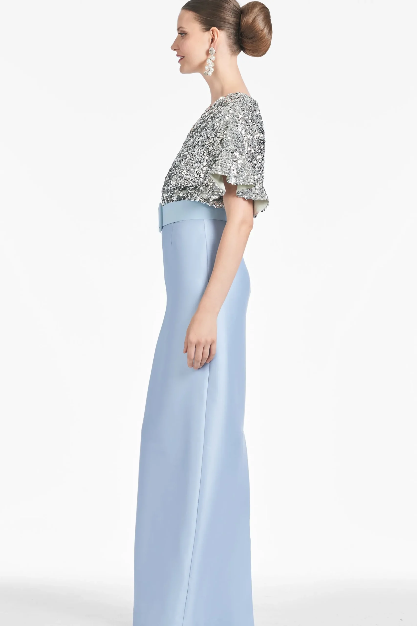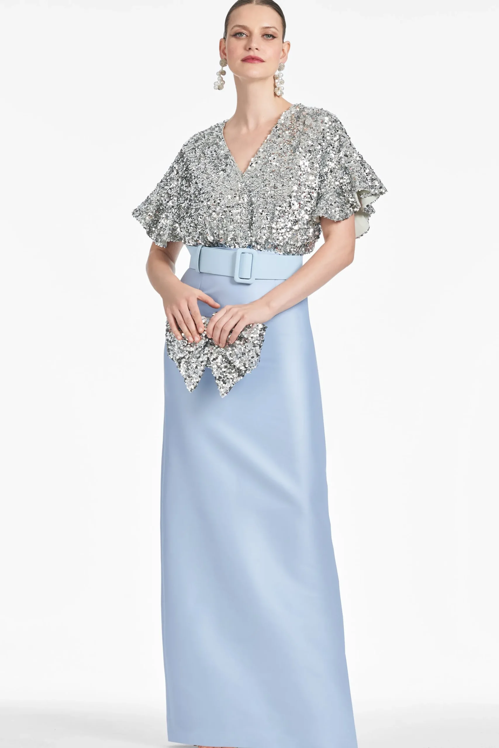 Prepare to turn heads in the Marlene. A classic column skirt in double-face Mikado meets glittering metallic stretch micro-sequins for the ultimate black-tie ensemble. The drop sleeve offers an easy elegance to this otherwise classic silhouette. A self-belt in silver glacial blue completes the gown.