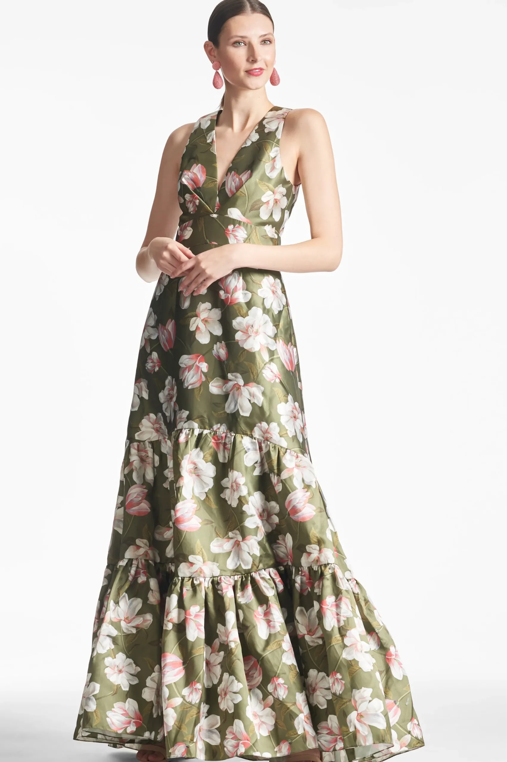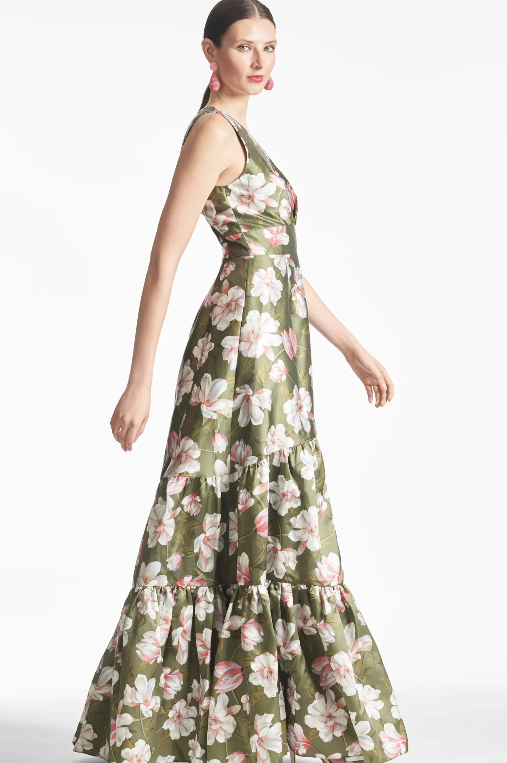 Rori is not for those looking to blend, she is a show-stopping conversation piece. A clean a-line silhouette with deep v-neckline is punctuated through tiers of our moss green magnolia print. Featured in our non-stretch Mikado, she is designed to fit and flatter, cinching at the highest point of the waist and elegantly falling at the hip.