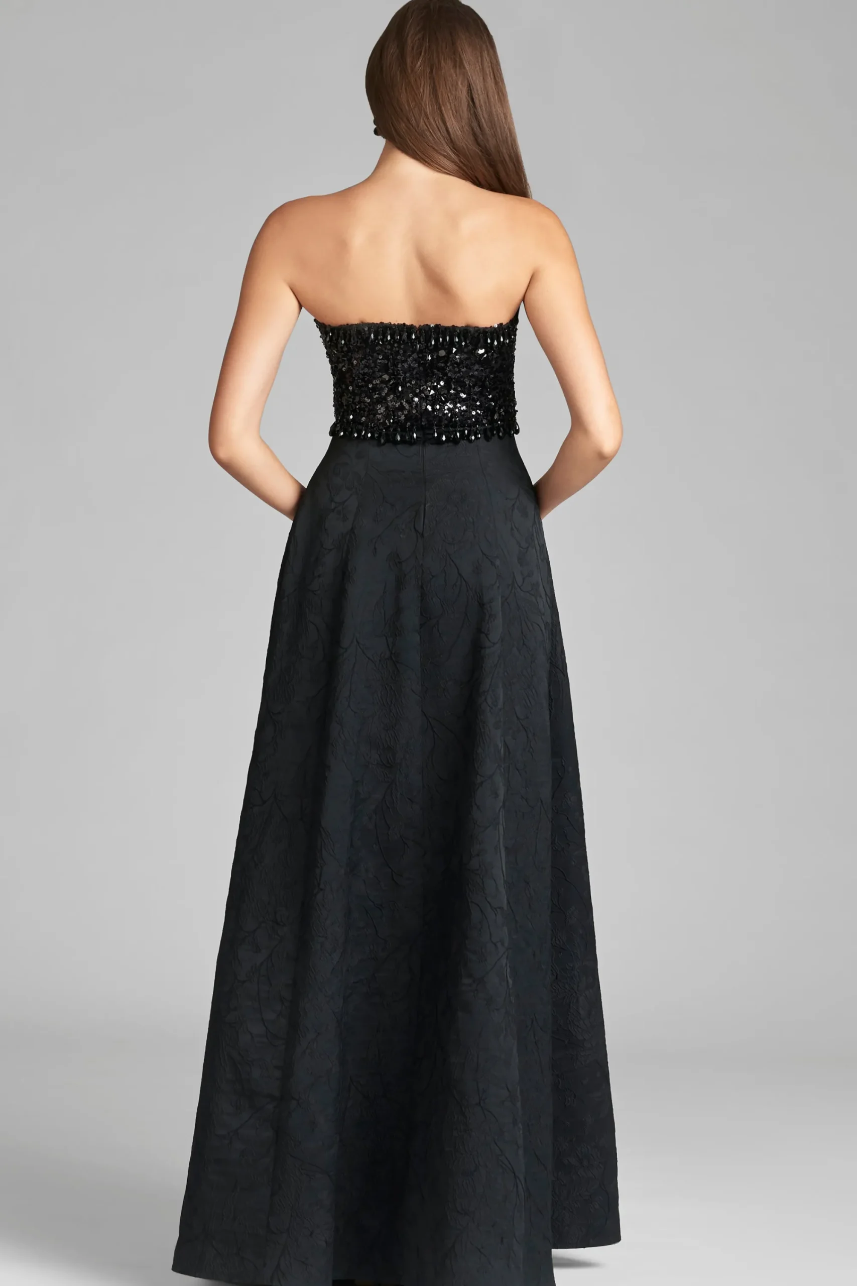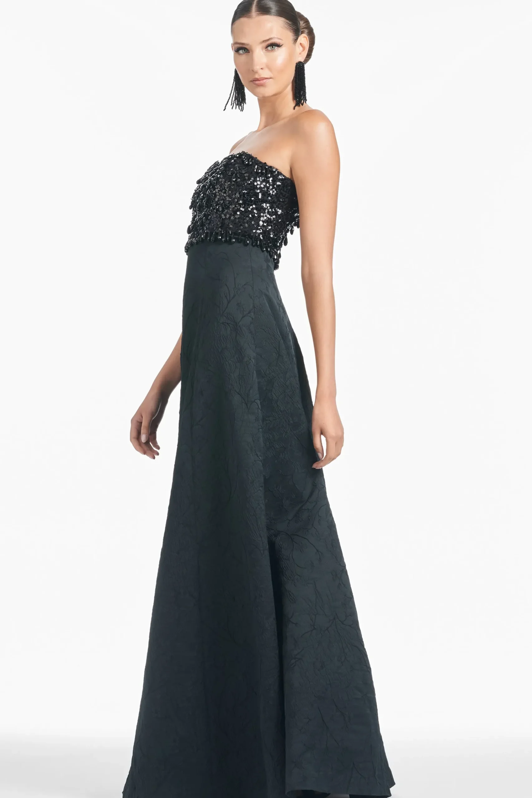 Lillian is a staple and a statement all at once. The Jacquard Cloque fabrication is exquisite on its own, but it’s made even more fabulous with the sequin and drop embellishment at the sweetheart neckline. She cascades into a subtle A-line to create the dreamiest black-tie gown.