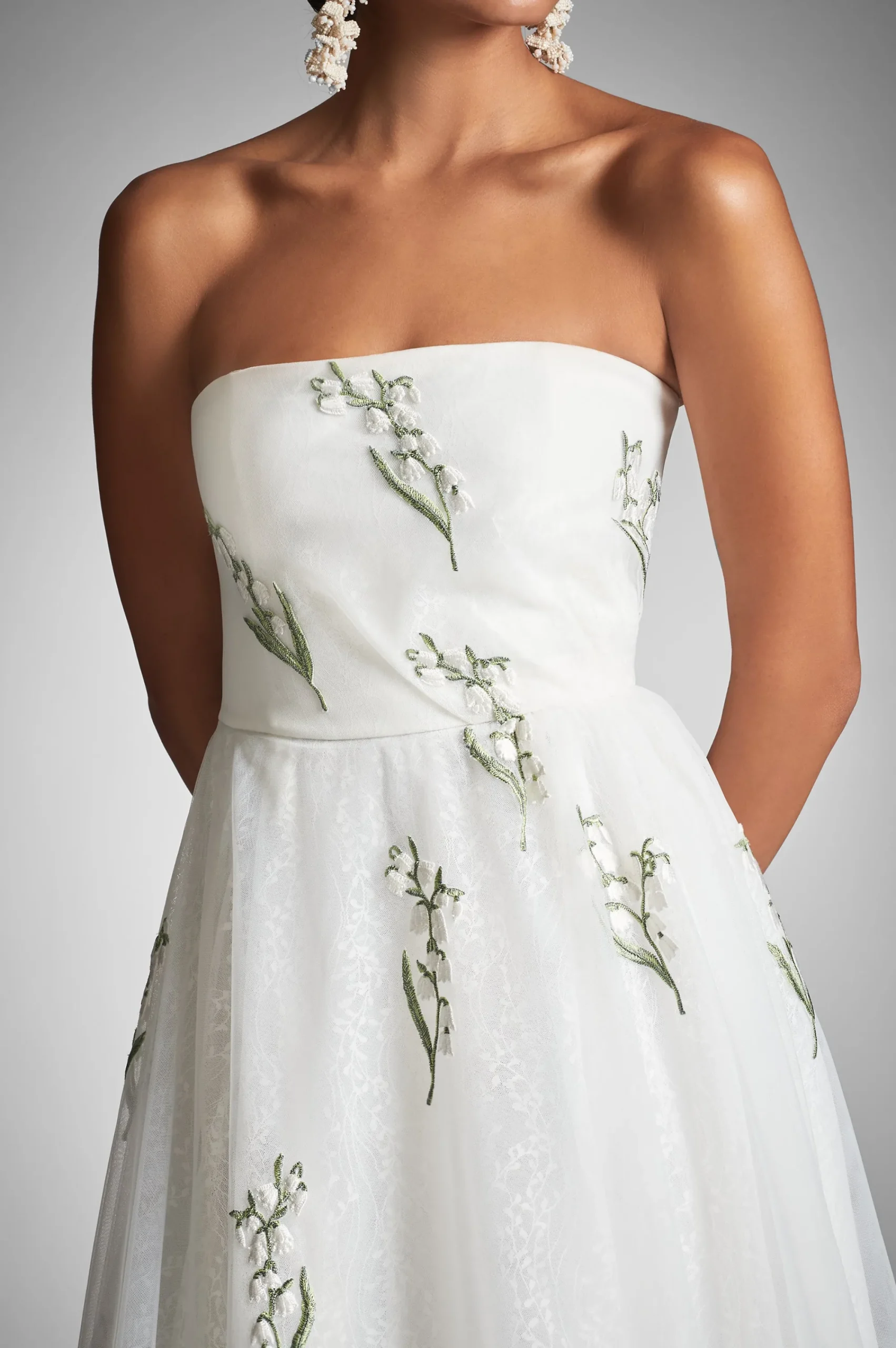 Look stunning on your special day in the Anais Gown. Flowing layers of tulle and lace are adorned with impressive scattered Lily of the Valley floral embroidery.