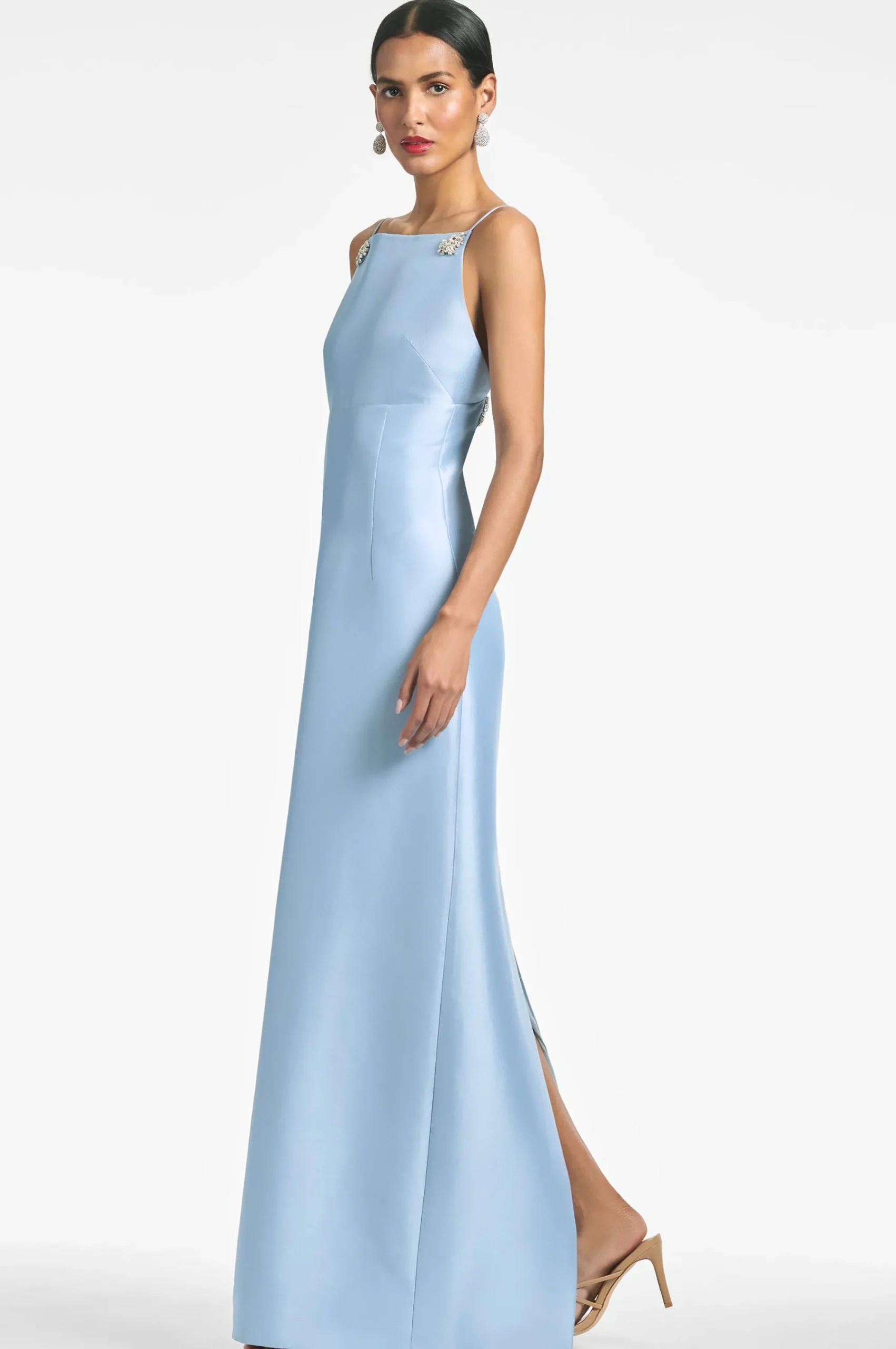 Sometimes the best answer is the most simple one, and that is true for the Pryce gown. A stunning column dress in stretch Mikado, she’s delicately adorned with crystal clips in a stunning shade of glacial blue.